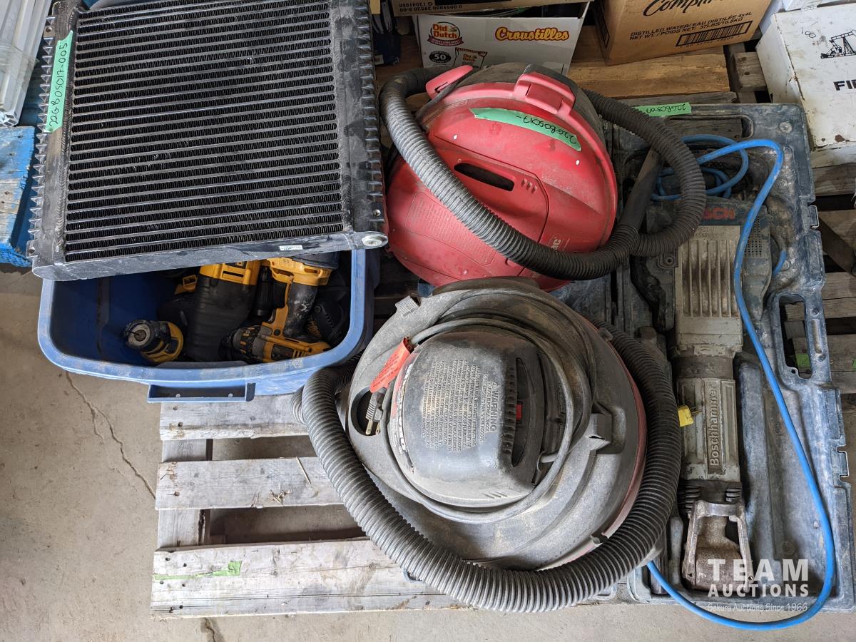 shop vacs, various Dewalt tools, hydraulic oil cooler, jack hammer