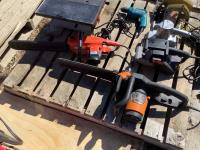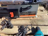 Black & Decker 8 inch table saw and 7-1/4 inch circular saw, Makita drill, DeWalt reciprocating saw, WORKX 120V chainsaw, Rockwell sander, Craftsman planer
