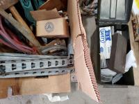 Antique ammo boxes, large heavy duty rope, extension cords, lights, hammer, booster cables