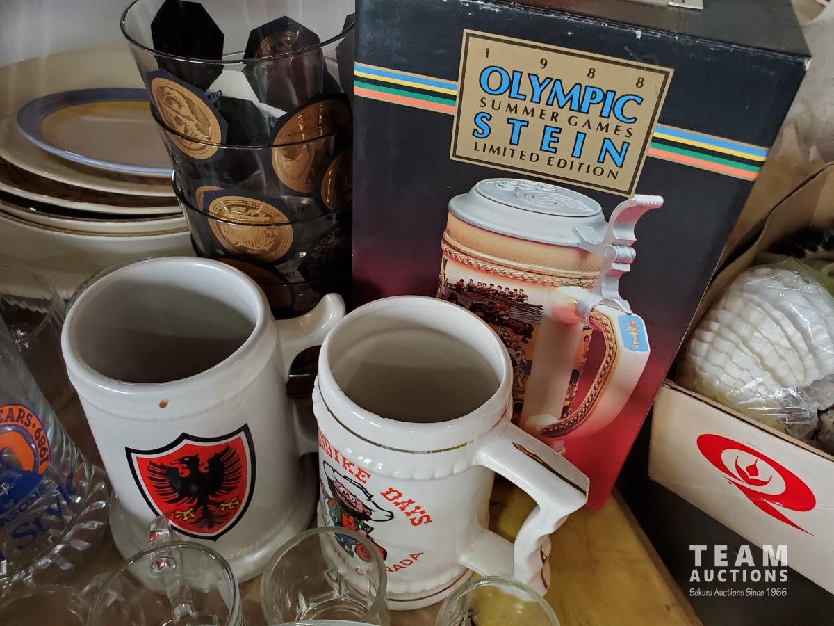 Stein cup, various cups, plates, frosty mugs