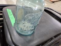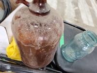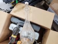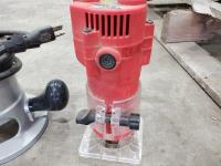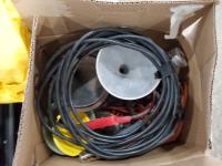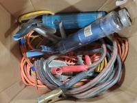 (9) black folding chairs, antique bottles, box w/ black& decker router, king Canada router, soldering gun, Mastercraft hole saw set, box w/ assorted extension cords, funnels, calking gun, jumper cable, trouble light