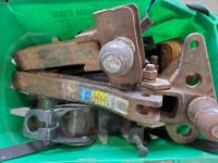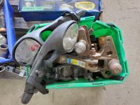 Assorted ball hitches, towing mirrors, saw, locks w/keys, assorted pipes & fittings, pail of screws & chrome head lamps covers
