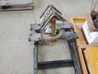Jobmate stand, umbrella, pressure washer nozzles, scale w/ wooden box, outdoor décor & assorted tools