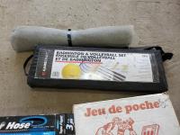 Sand bag throw game, badminton & volleyball set, Bocce set, croquet set & 10' sewer hose