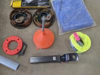 Pallet of miscellaneous shop tools & equipment: tarp, hitch, Delta saw, brake drums