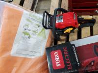 Bench tool box with tools, 16 inch electric chainsaw, garage mat, 14 inch Toro trimmer/edger, heavy duty 14X14 tarp