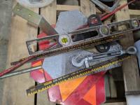 Pallet of miscellaneous horse shoes, shovel, farm vehicle signs, grease guns, saw blades