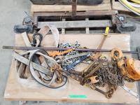 Pallet of slings, chains, boomers, ratchet & boomers, crescent wrench, 2ton chain hoist, pry bar & hitch mount aux trail lights