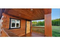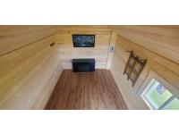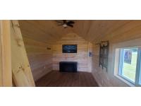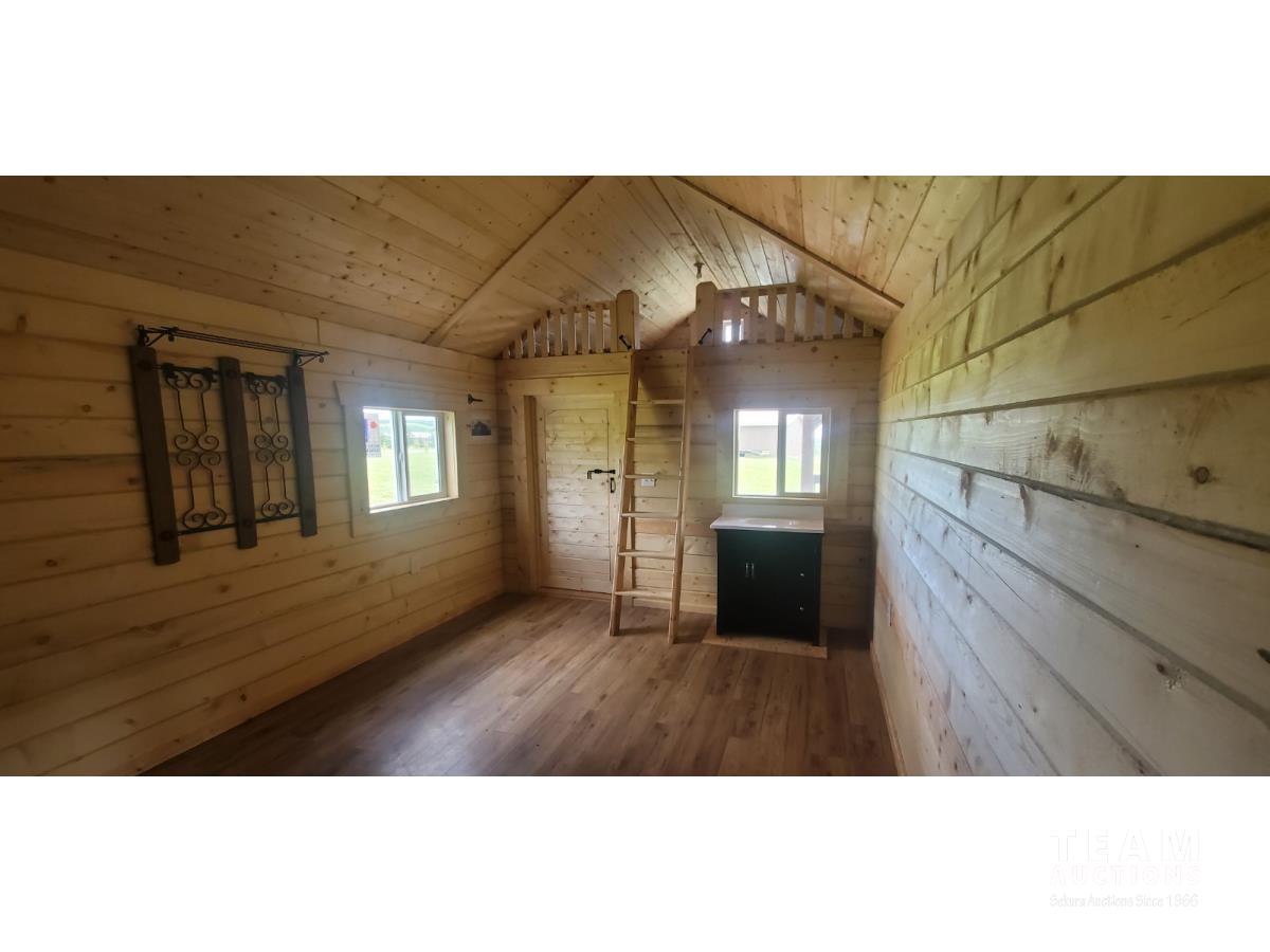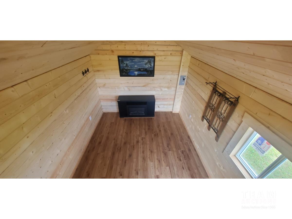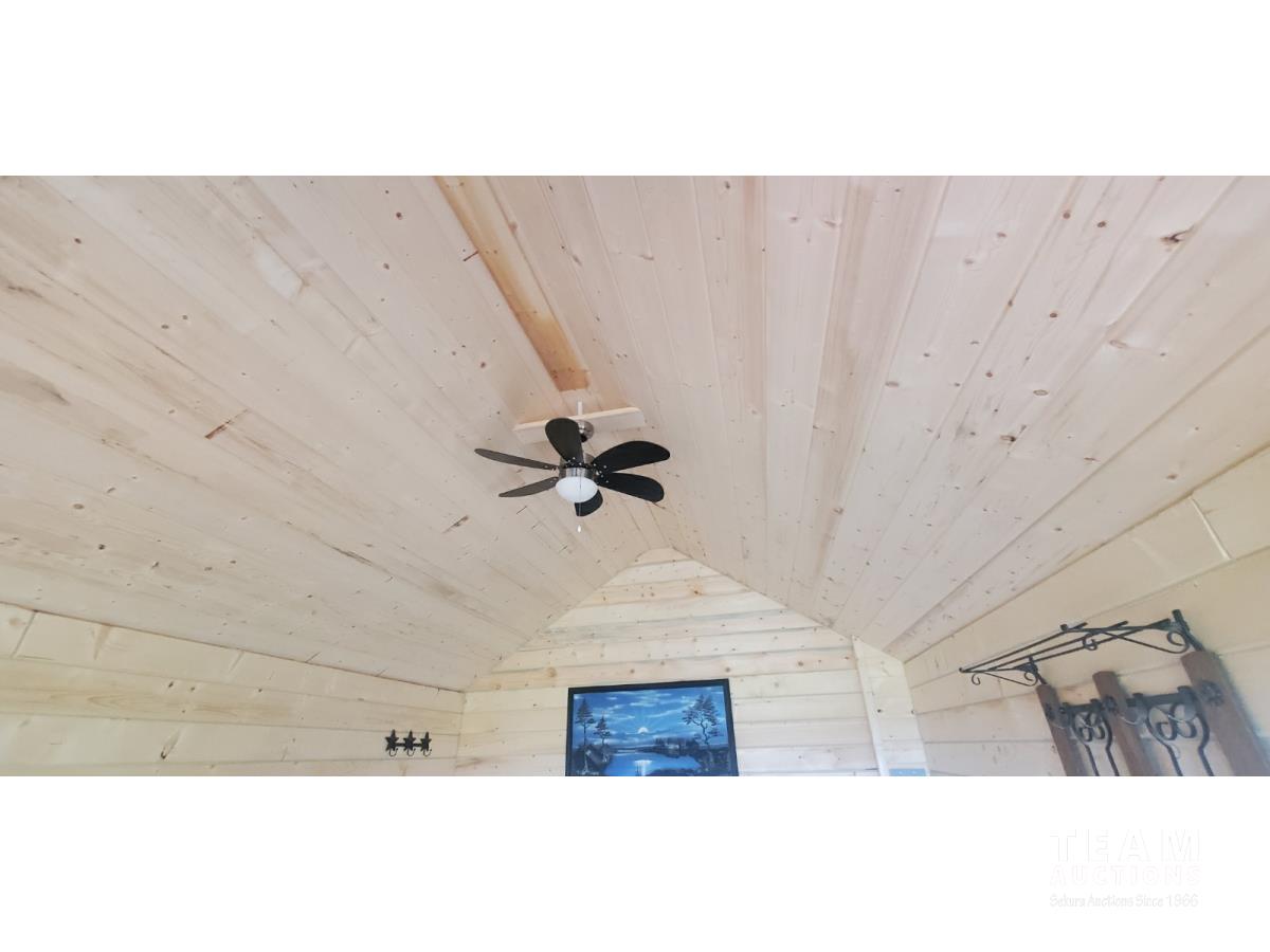 on skids, fully insulated, wired, ceiling fan, porch light, electric heater, sink, tongue and groove ceiling, tin roof, 8 ft x 12 ft loft w/ carpet and light, 8 ft deck, all weather windows