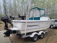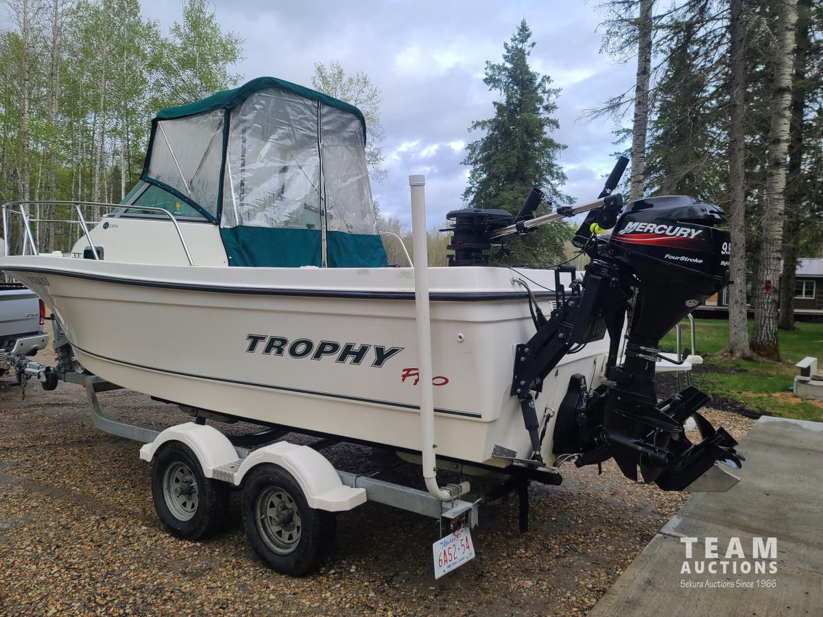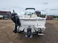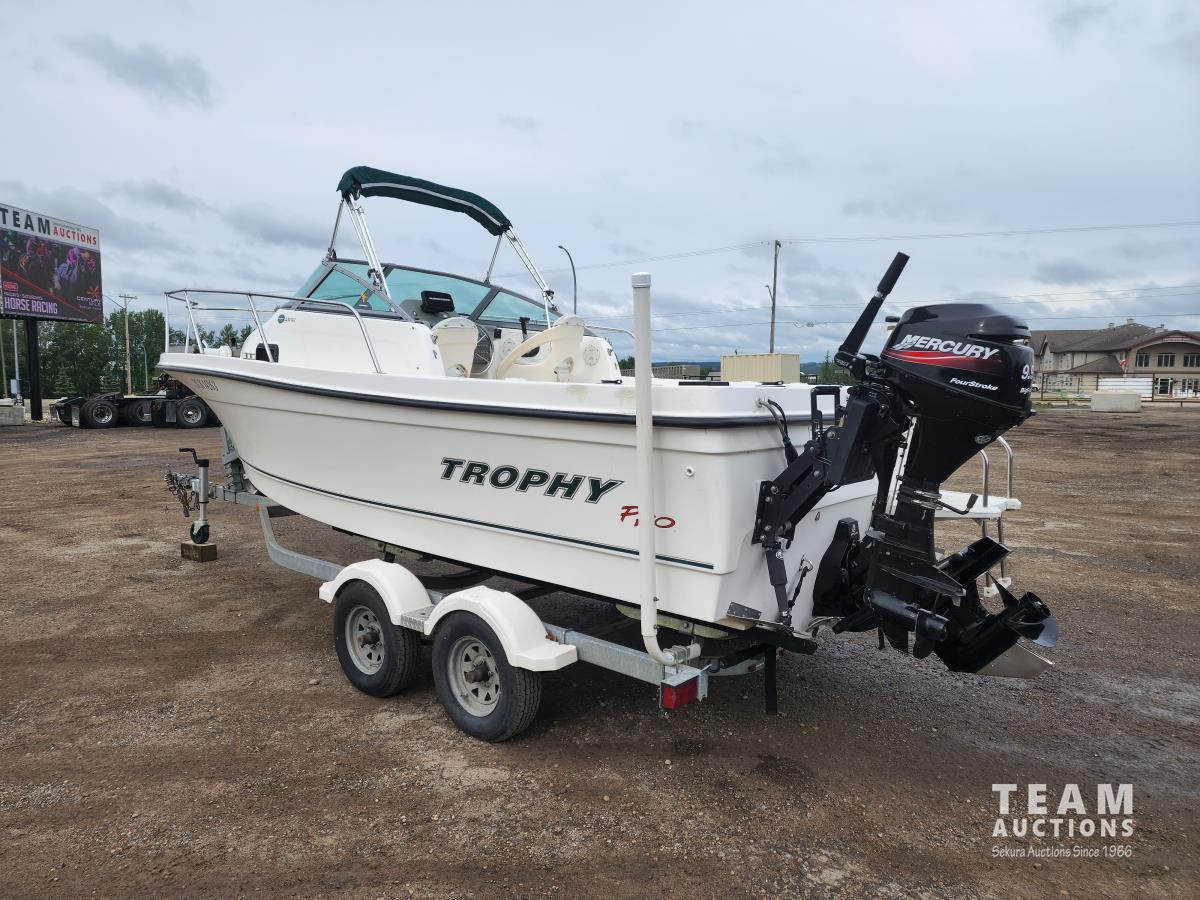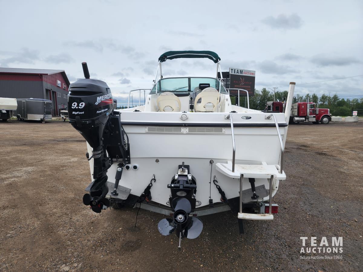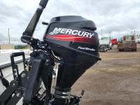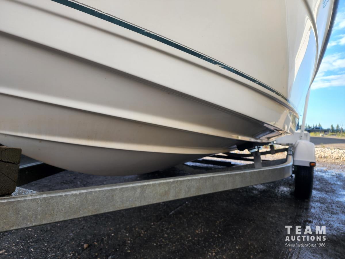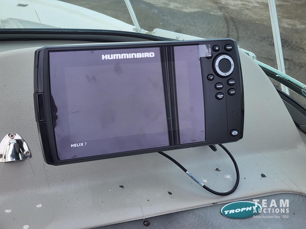 c/w Karavan T/A galvanized trailer, swing away trailer hitch, 4.3 L Mercury ( hrs are unknown, no hrs meter) w/new prop, 9.9 HP Mercury kicker, cabin cuddy, closed loop cooling system, Windlass winch, New Hummingbird Helix 7 w/ chart plotter card, VHF radio, dual fish lockers with pumps, live bait well, Lenco trim tabs, self draining floor, multiple rod holders, canvas top, anchor, 8.1 ft beam, new 185/80R13 tires on trailer