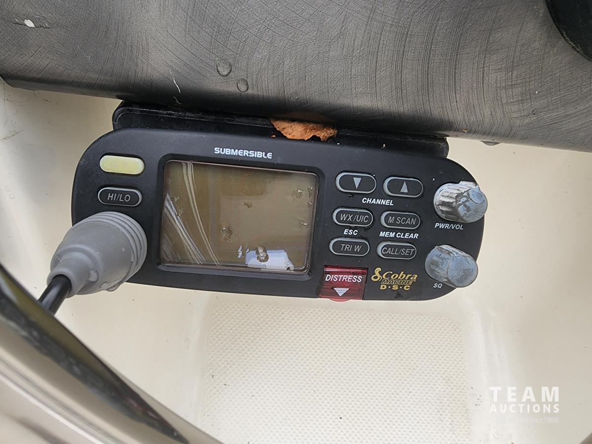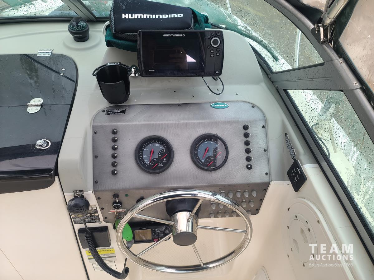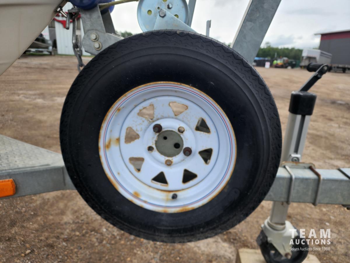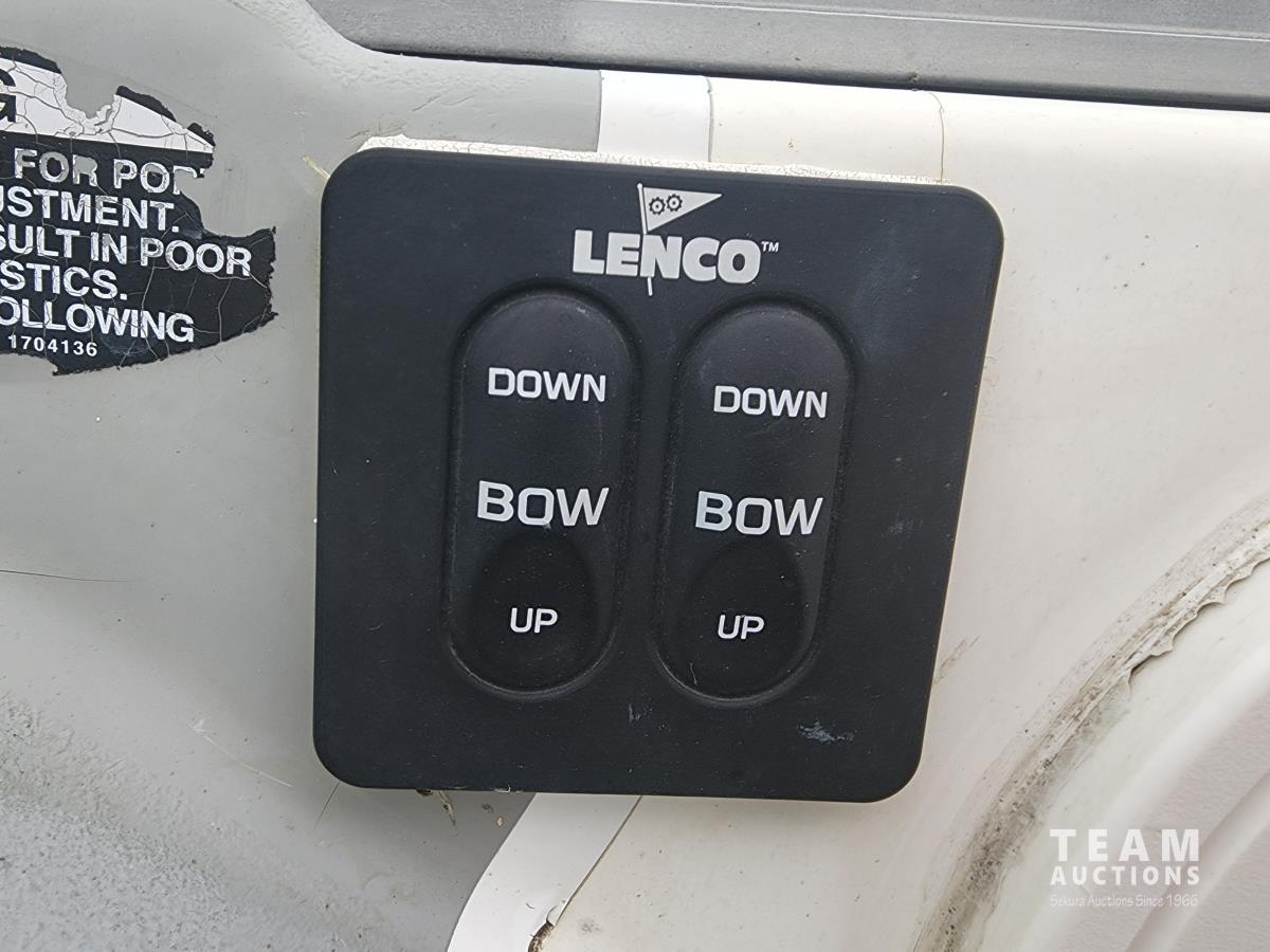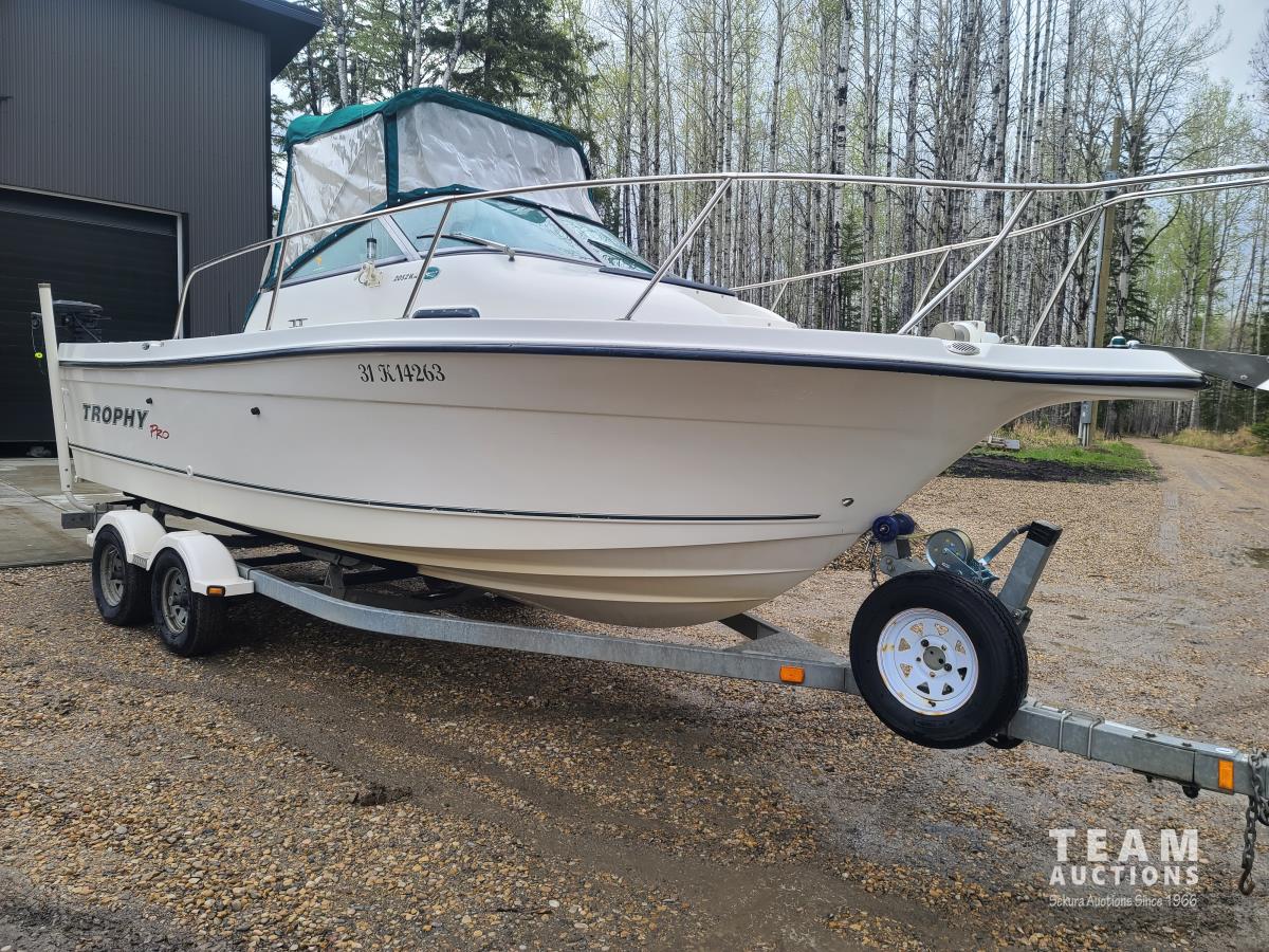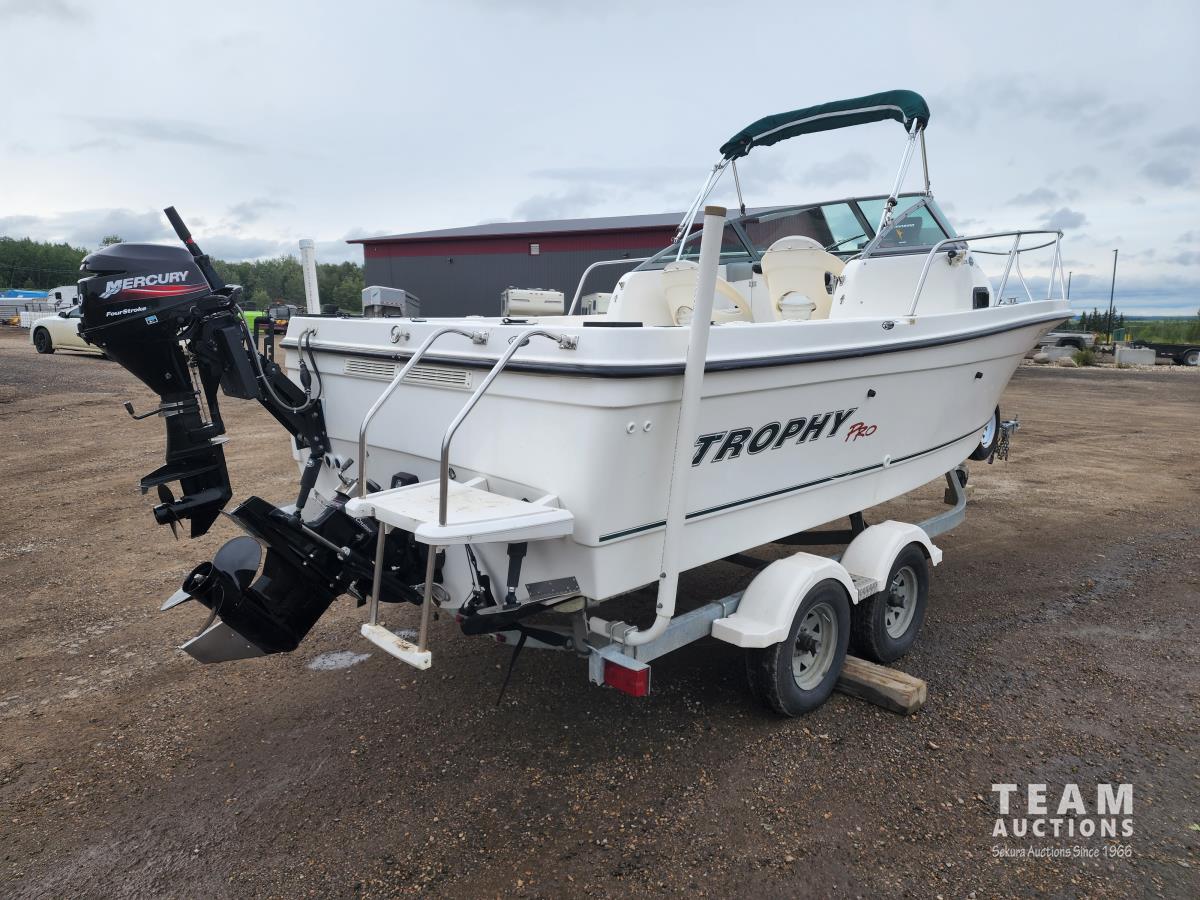 c/w Karavan T/A galvanized trailer, swing away trailer hitch, 4.3 L Mercury ( hrs are unknown, no hrs meter) w/new prop, 9.9 HP Mercury kicker, cabin cuddy, closed loop cooling system, Windlass winch, New Hummingbird Helix 7 w/ chart plotter card, VHF radio, dual fish lockers with pumps, live bait well, Lenco trim tabs, self draining floor, multiple rod holders, canvas top, anchor, 8.1 ft beam, new 185/80R13 tires on trailer