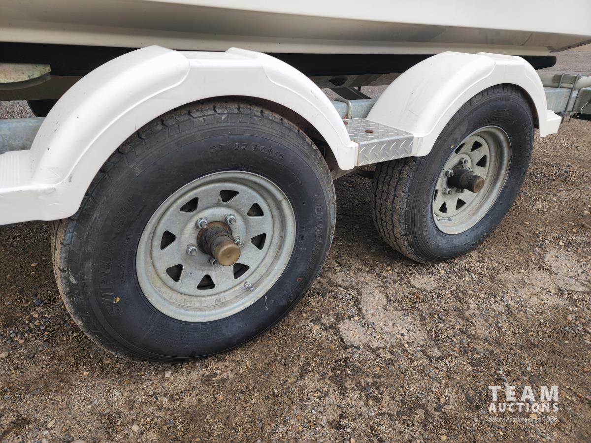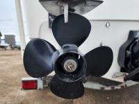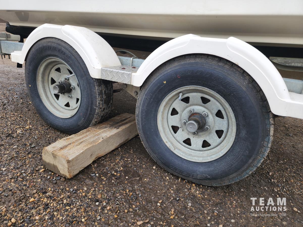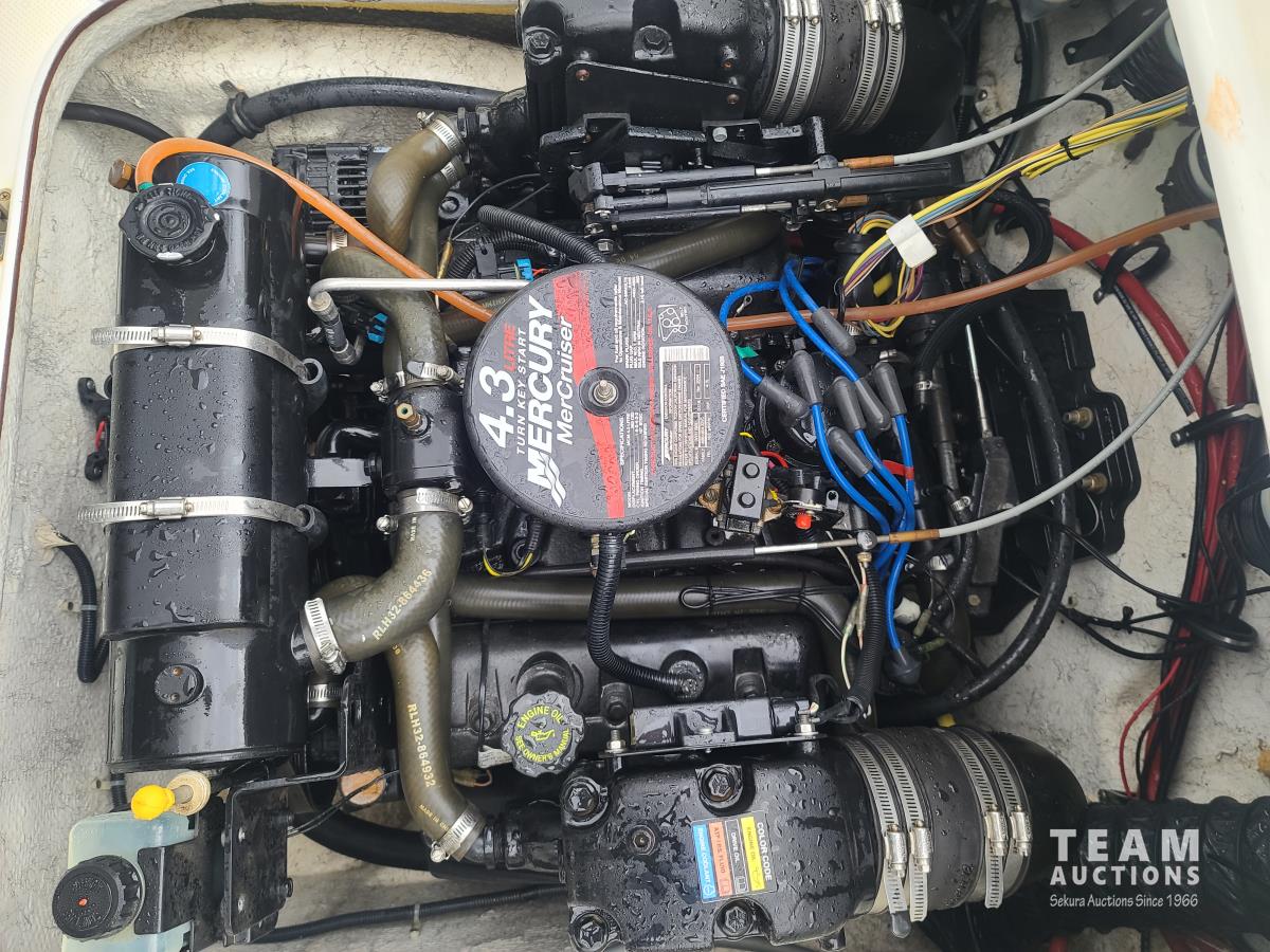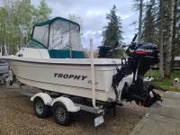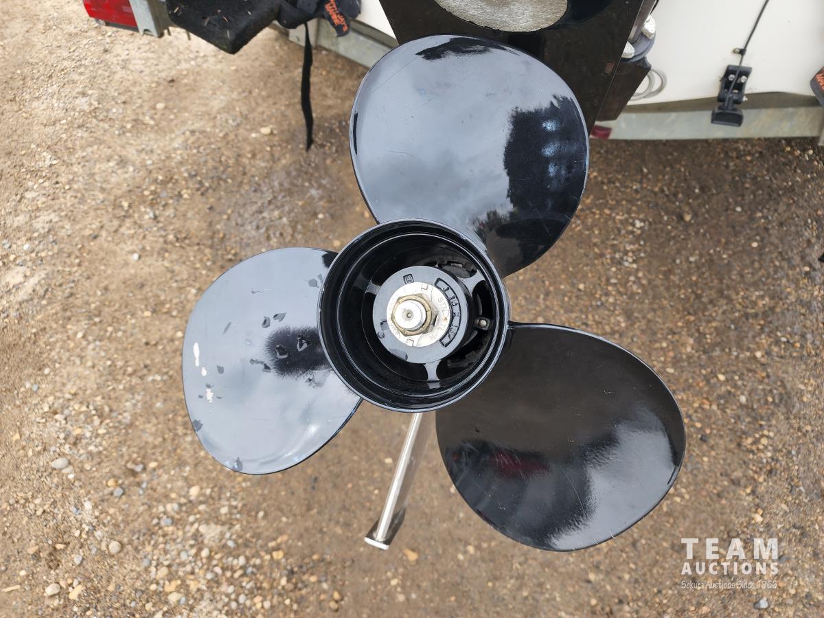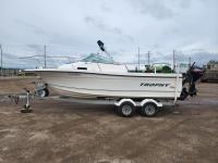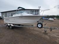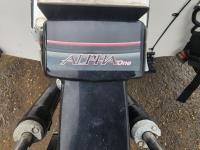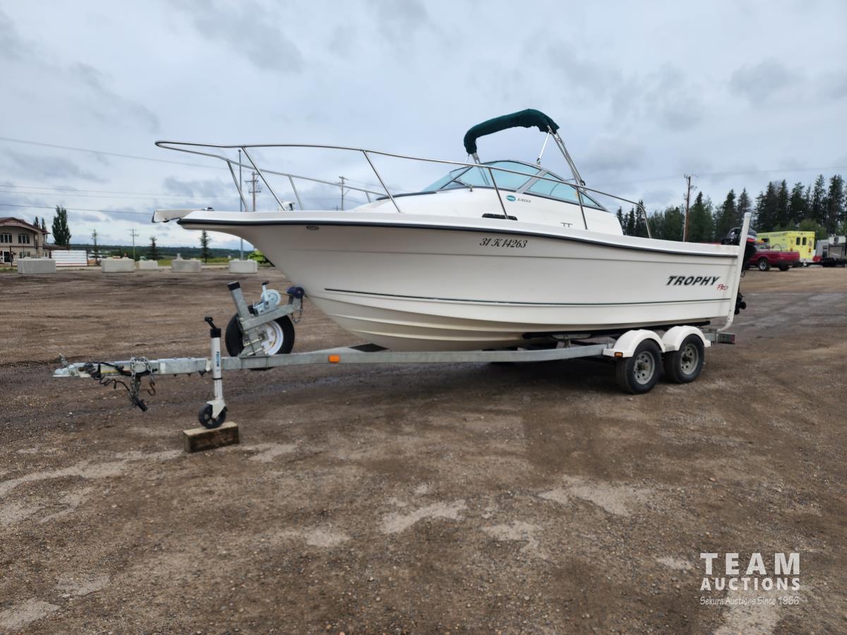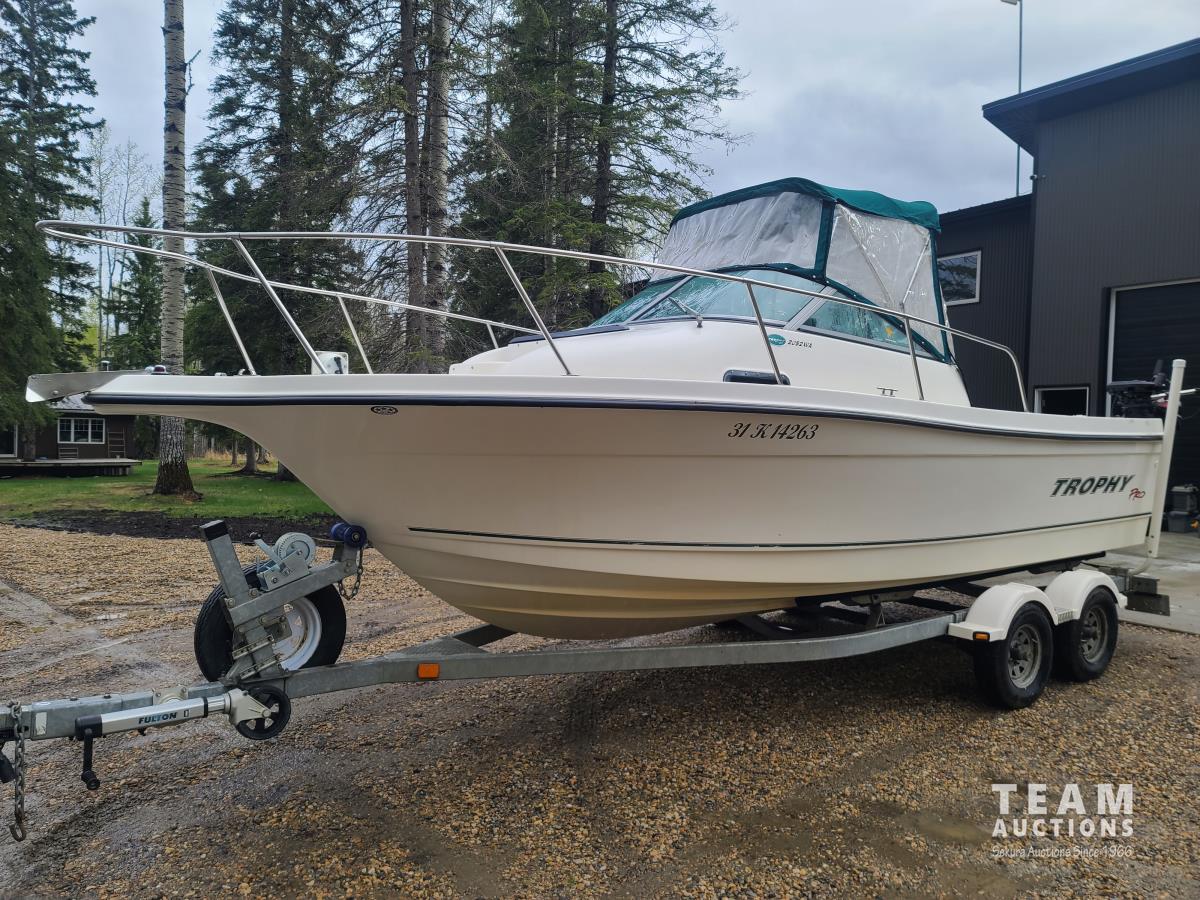c/w Karavan T/A galvanized trailer, swing away trailer hitch, 4.3 L Mercury ( hrs are unknown, no hrs meter) w/new prop, 9.9 HP Mercury kicker, cabin cuddy, closed loop cooling system, Windlass winch, New Hummingbird Helix 7 w/ chart plotter card, VHF radio, dual fish lockers with pumps, live bait well, Lenco trim tabs, self draining floor, multiple rod holders, canvas top, anchor, 8.1 ft beam, new 185/80R13 tires on trailer