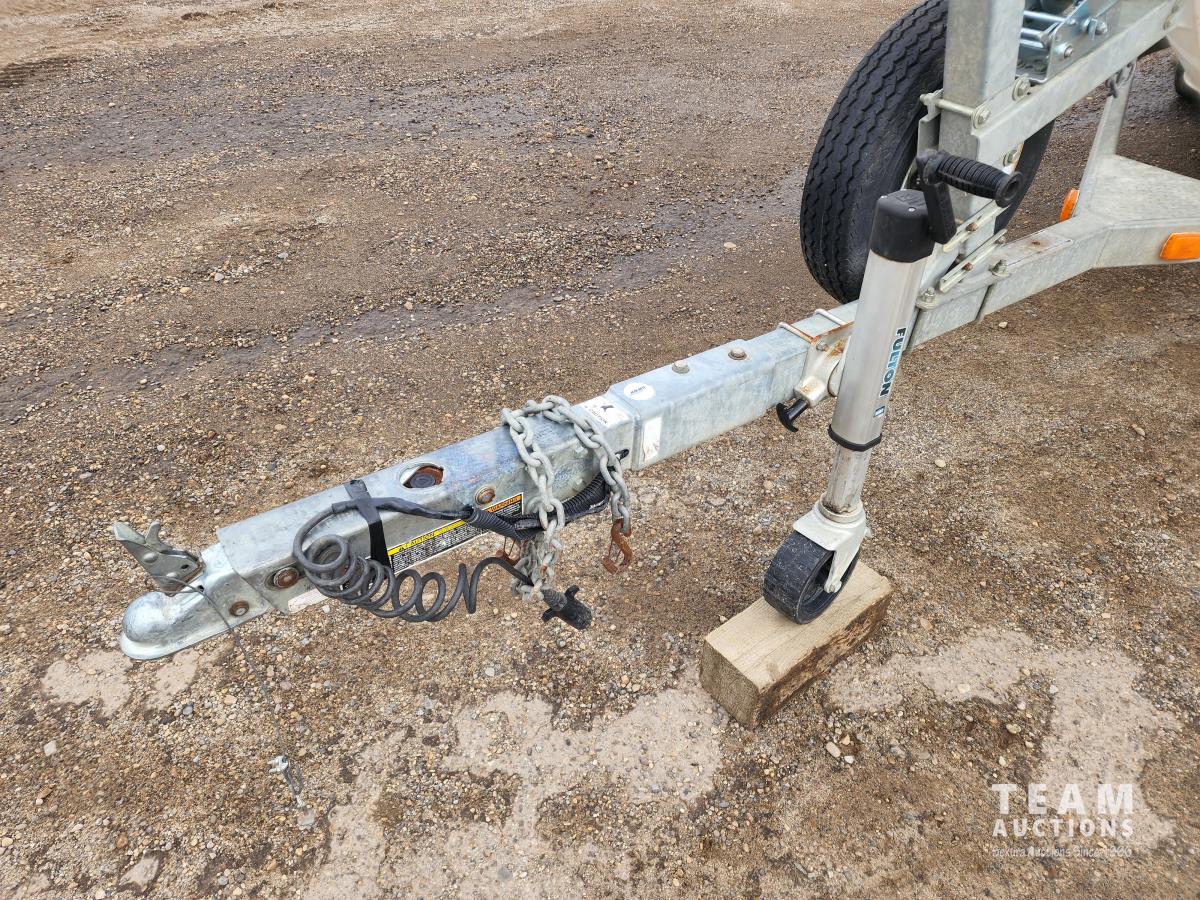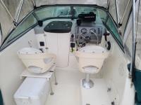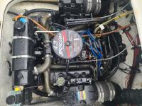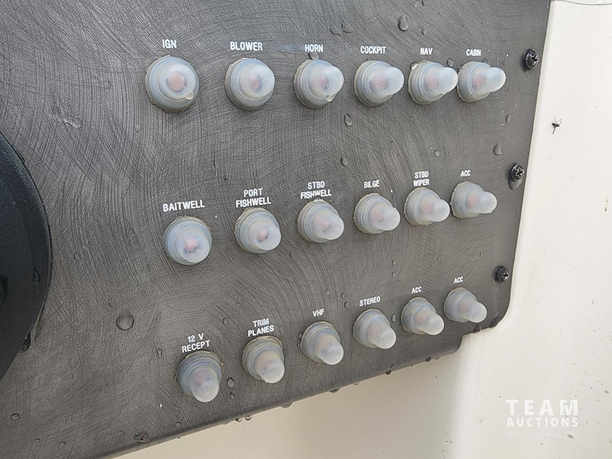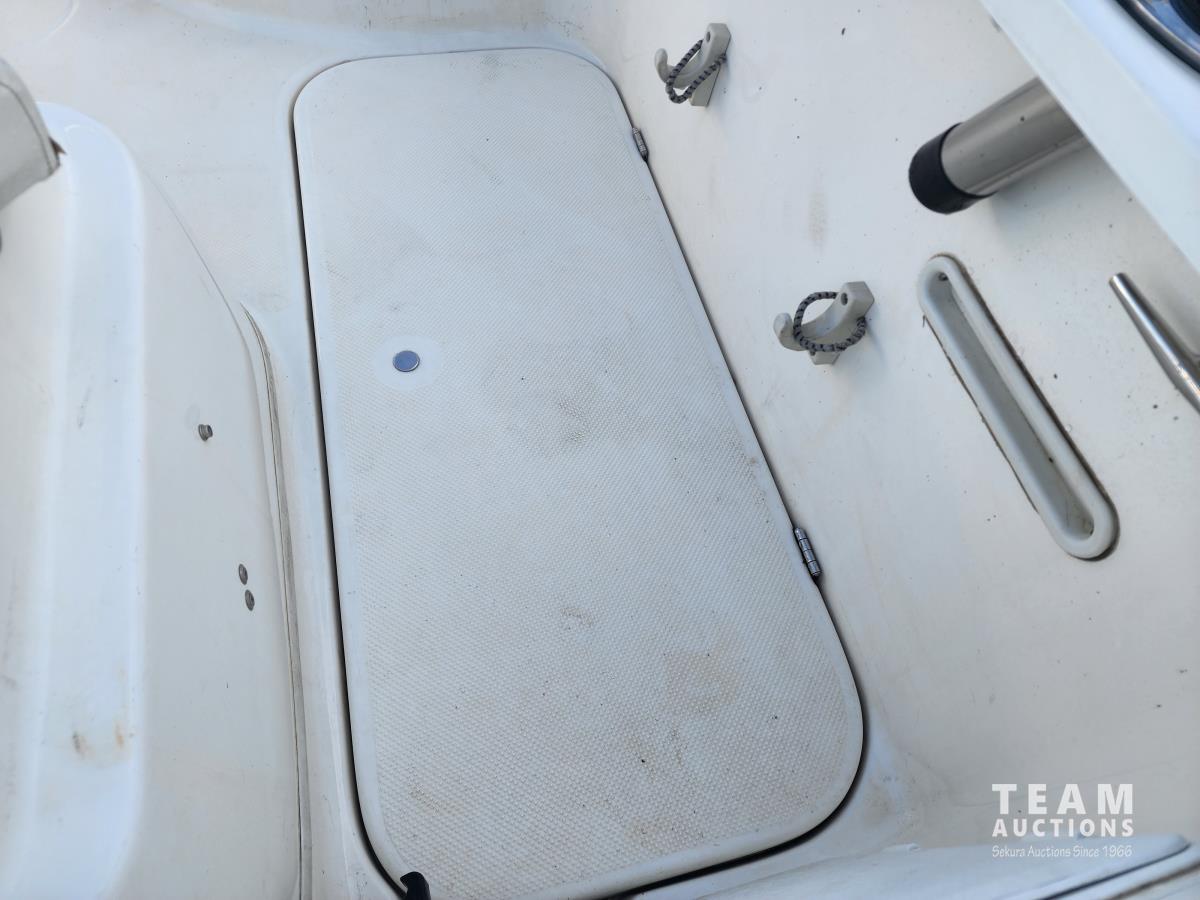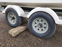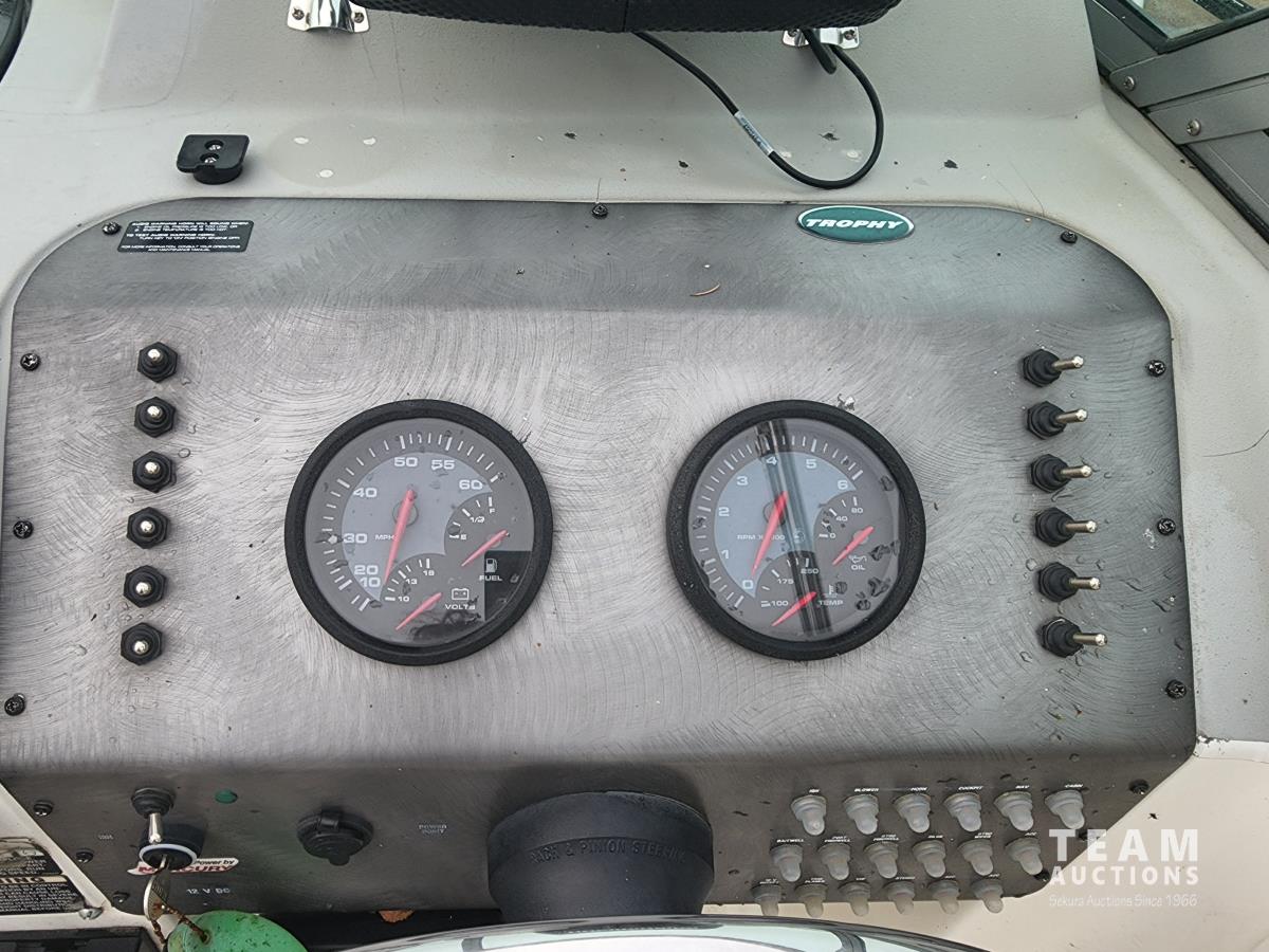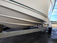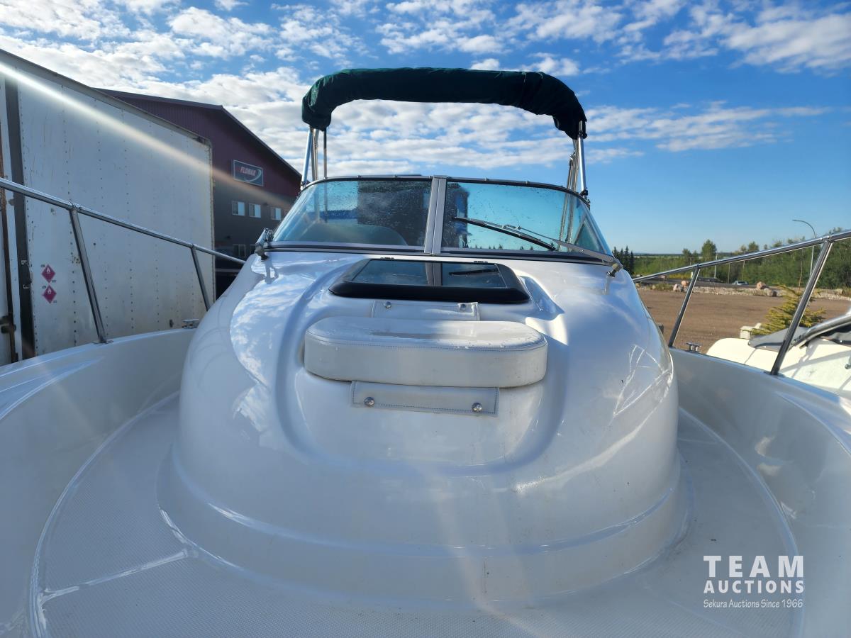 c/w Karavan T/A galvanized trailer, swing away trailer hitch, 4.3 L Mercury ( hrs are unknown, no hrs meter) w/new prop, 9.9 HP Mercury kicker, cabin cuddy, closed loop cooling system, Windlass winch, New Hummingbird Helix 7 w/ chart plotter card, VHF radio, dual fish lockers with pumps, live bait well, Lenco trim tabs, self draining floor, multiple rod holders, canvas top, anchor, 8.1 ft beam, new 185/80R13 tires on trailer