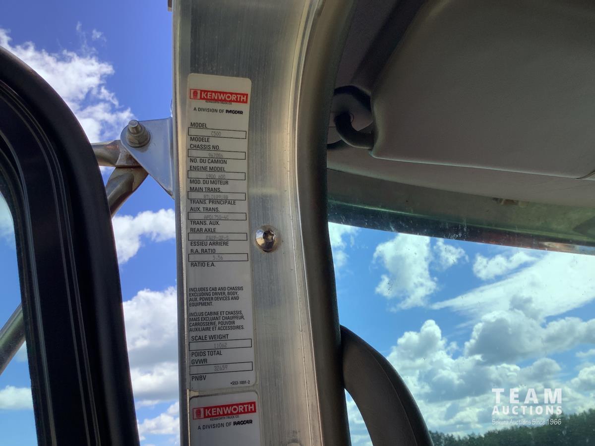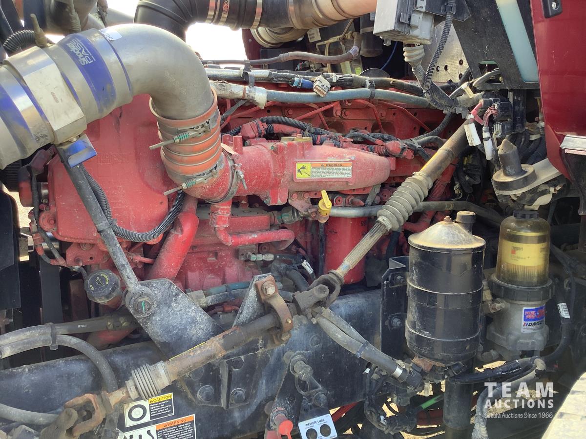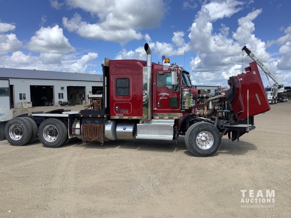 Cummins ISX, 600 HP, Eaton Fuller 18 speed transmission, 4 speed auxiliary transmission, 19,400 lb front, 46,000 lb rears, NeWay air ride suspension, above mount brake pots, wide track axles, planetary drive system, dual steering boxes, 52 inch mid rise sleeper, rear window, engine heater, Airco rig up, Tulsa RN65P-5ROA2 hydraulic drive winch, rear fenders, full cat walks, sliding fifth wheel, rear live roll, hitch plate, air lift wide load sign, beacon lights, tool boxes, wheel chains, 425/65R22.5 front, 11R24.5 rear