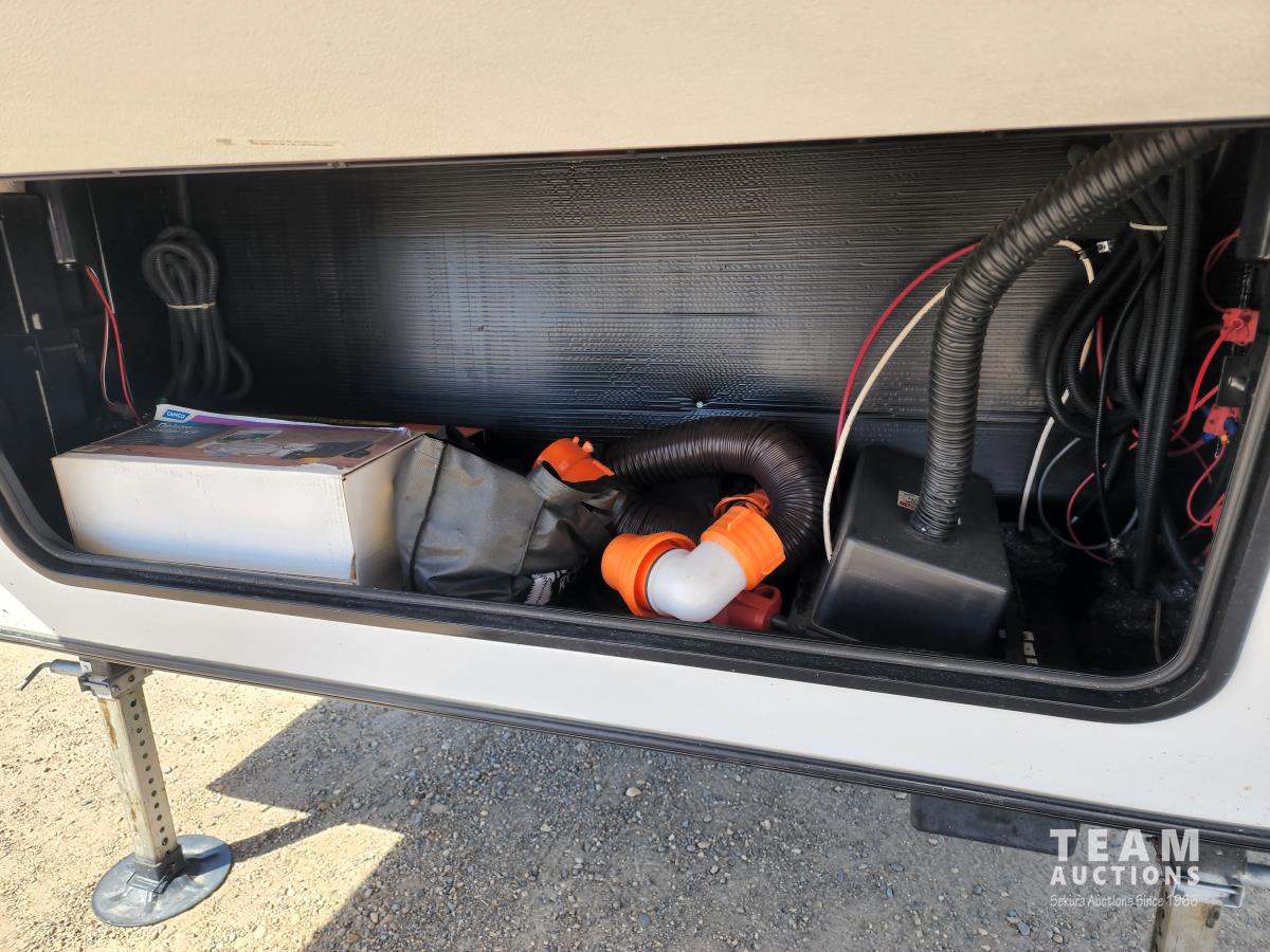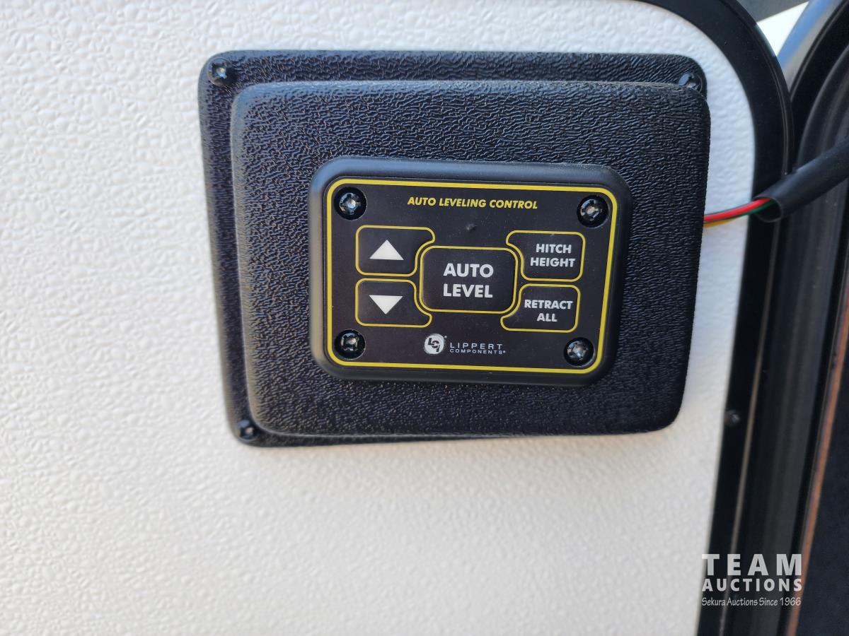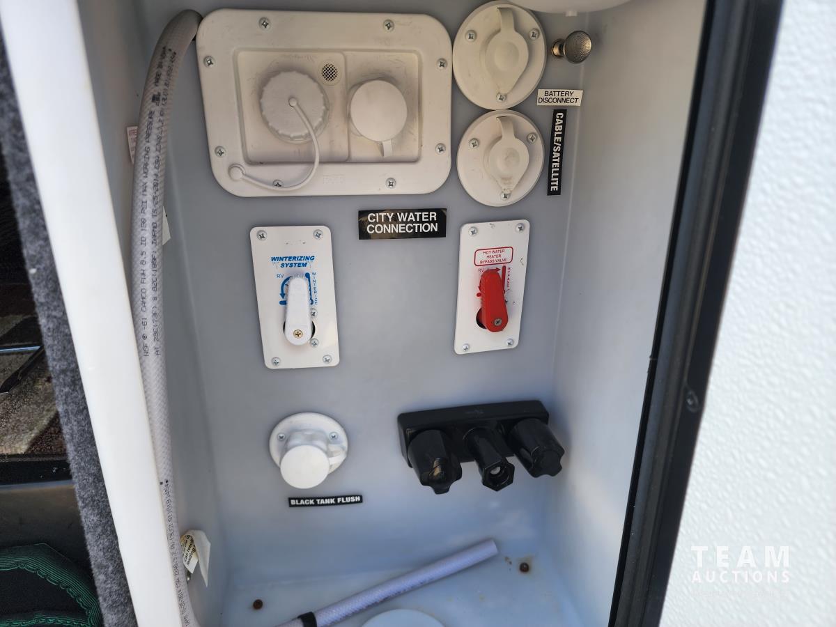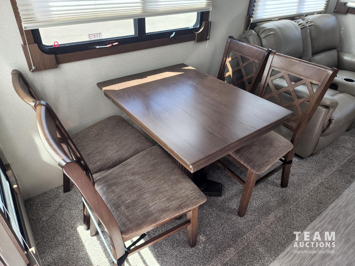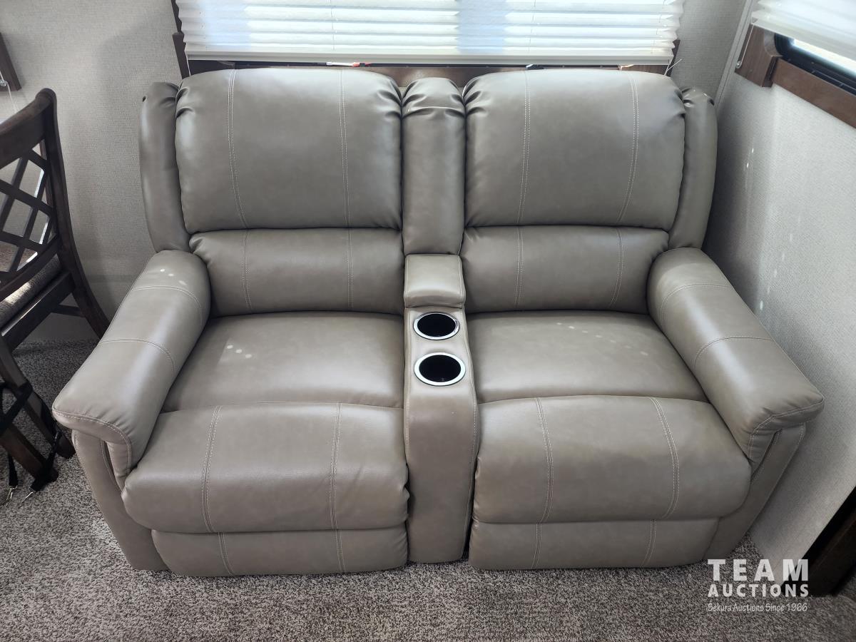 (3) slides, power jacks, power awning, a/c, fridge, stove, microwave, stone countertops, pantry, kitchen table, loveseat and double recliner chairs, TV, fireplace, front bedroom, bathroom, 235/80R16 tires
