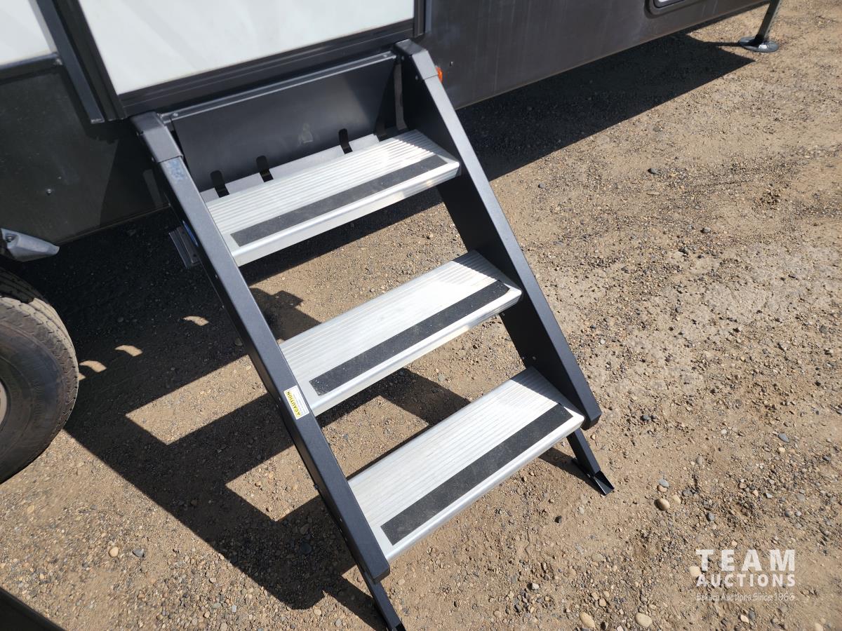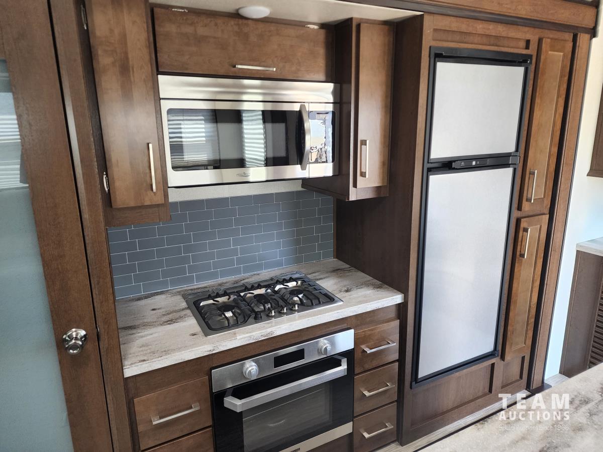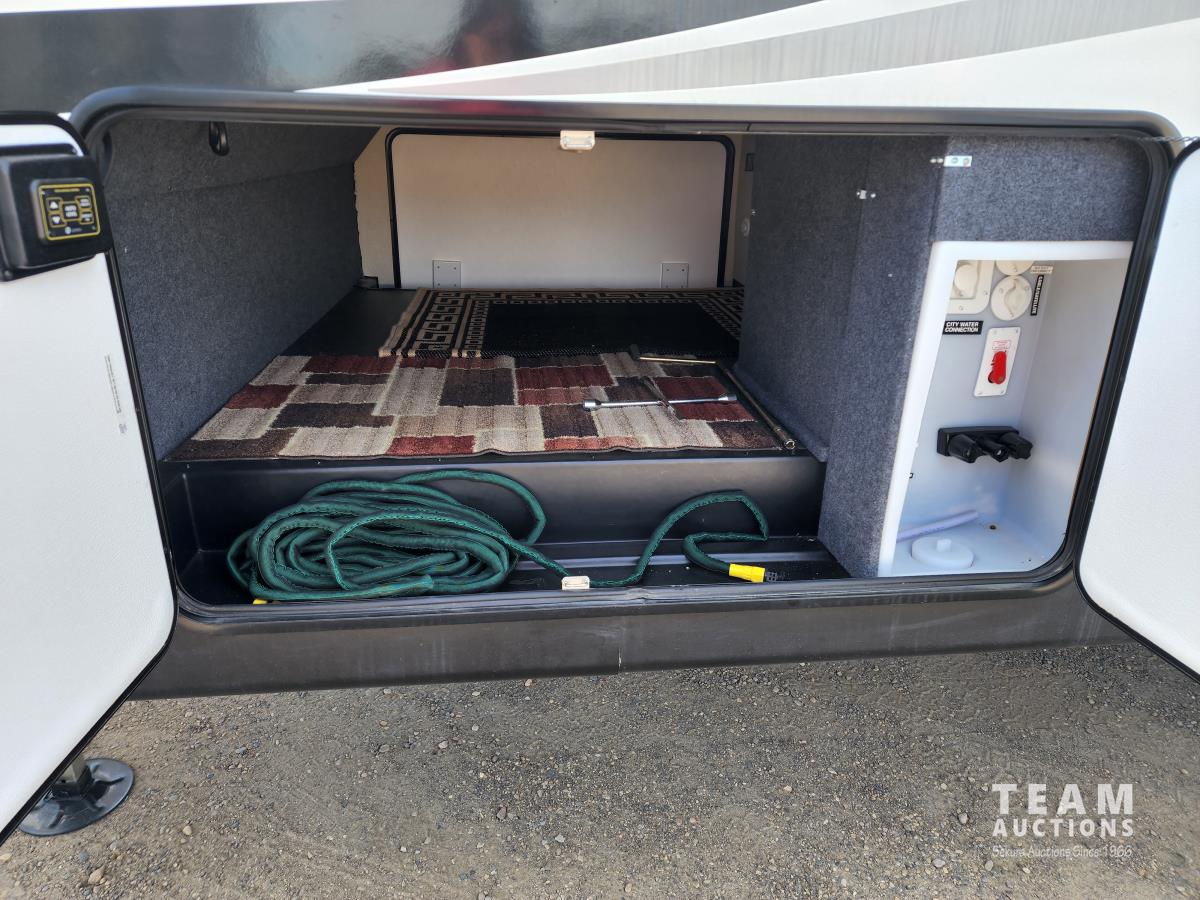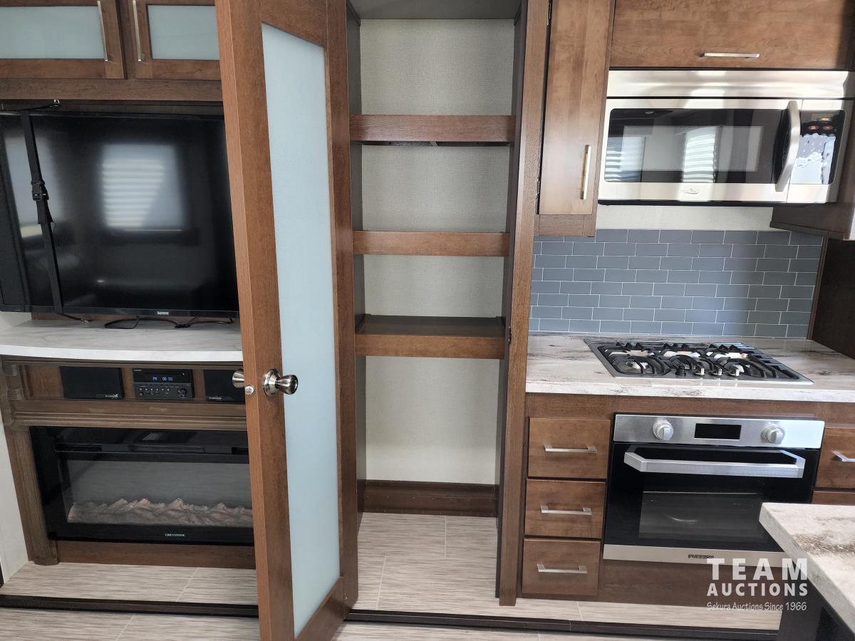 (3) slides, power jacks, power awning, a/c, fridge, stove, microwave, stone countertops, pantry, kitchen table, loveseat and double recliner chairs, TV, fireplace, front bedroom, bathroom, 235/80R16 tires