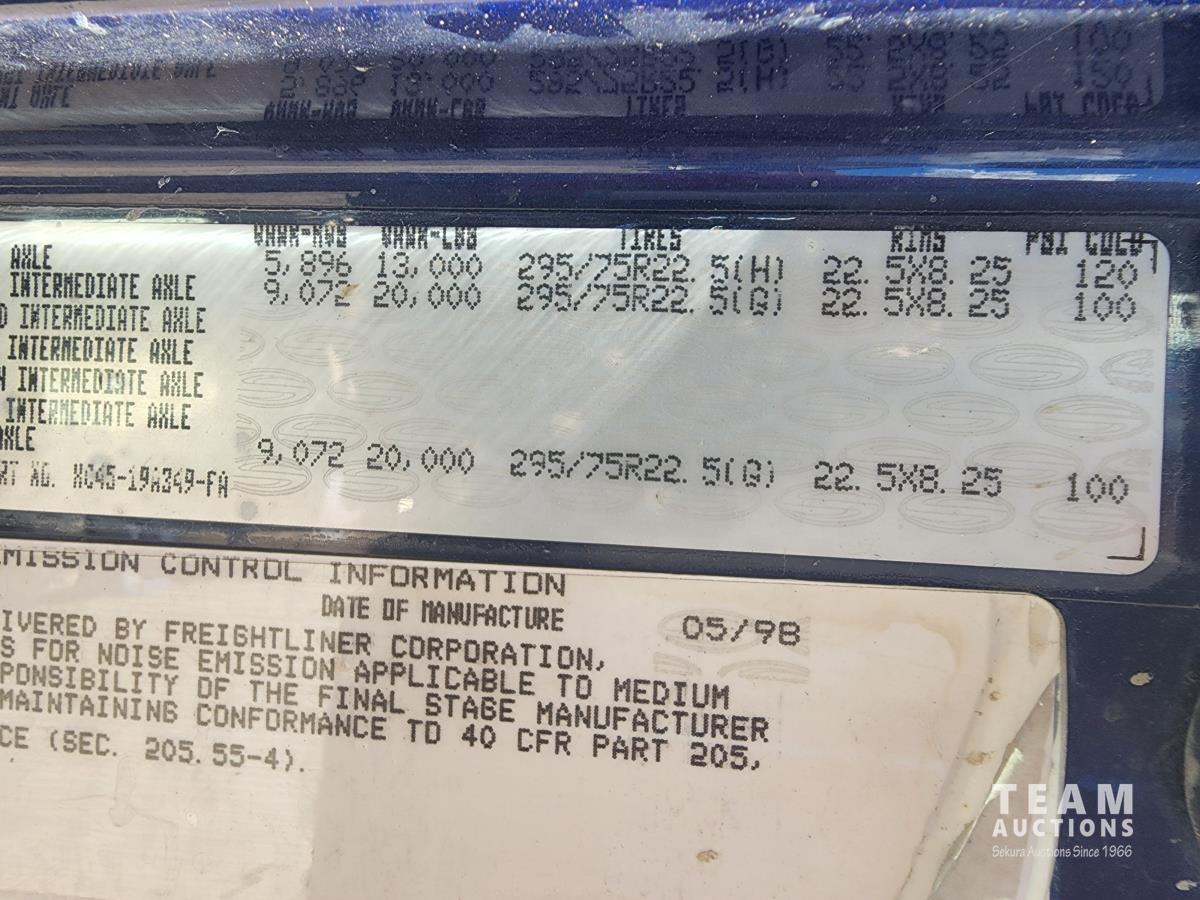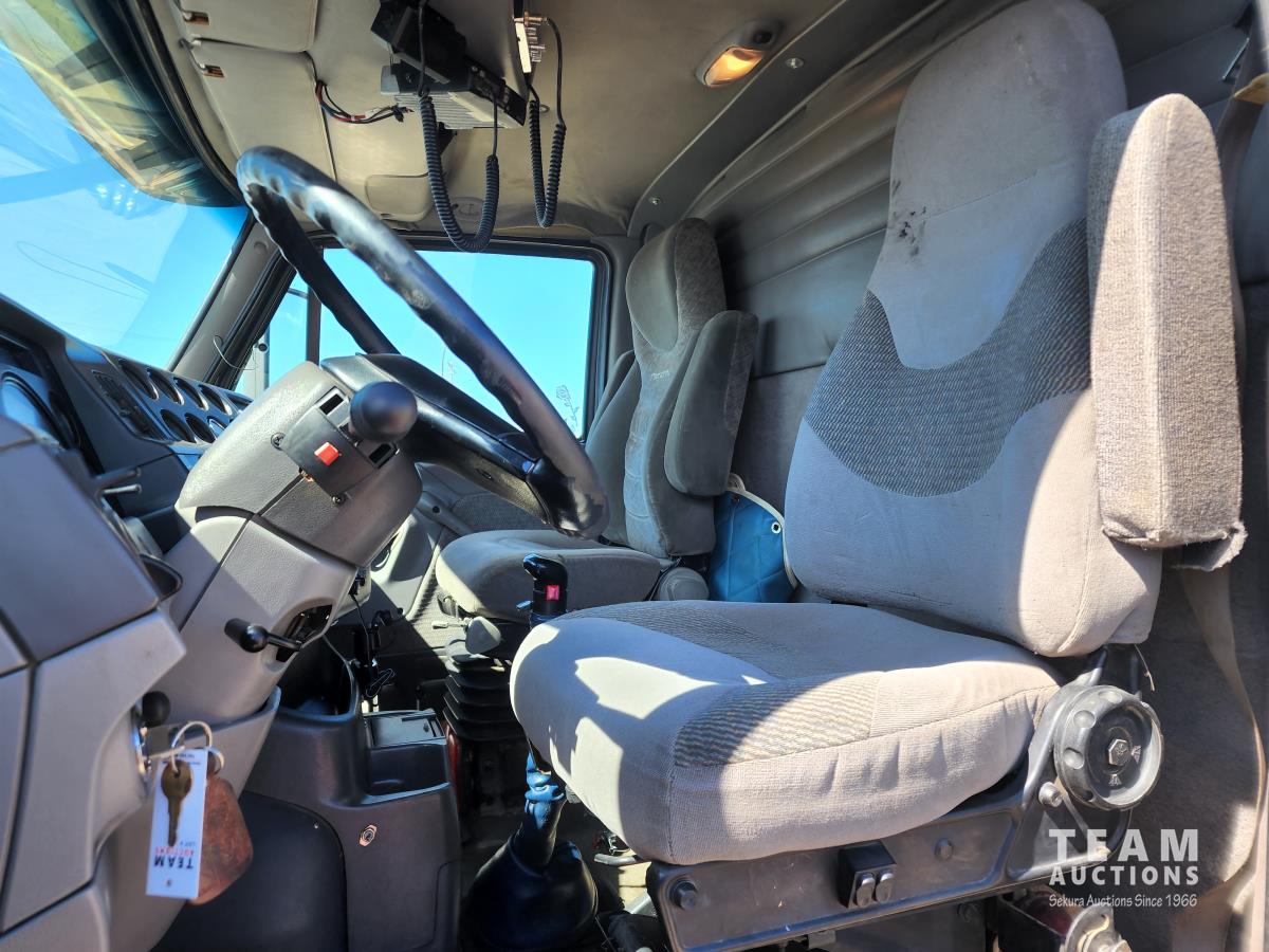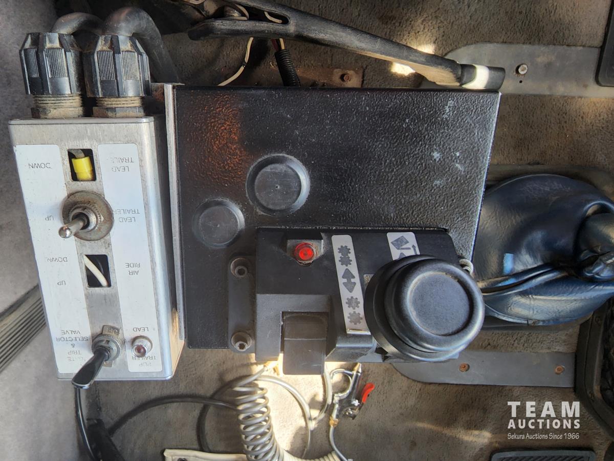 CAT 3406 engine, 13 speed transmission, air ride suspension, 24,000 lb front, 53,000 lb rears, single axle lock, 14 ft box, manual tarp, a/c, P/W, P/L, 11R22.5 inch tires on aluminum rims