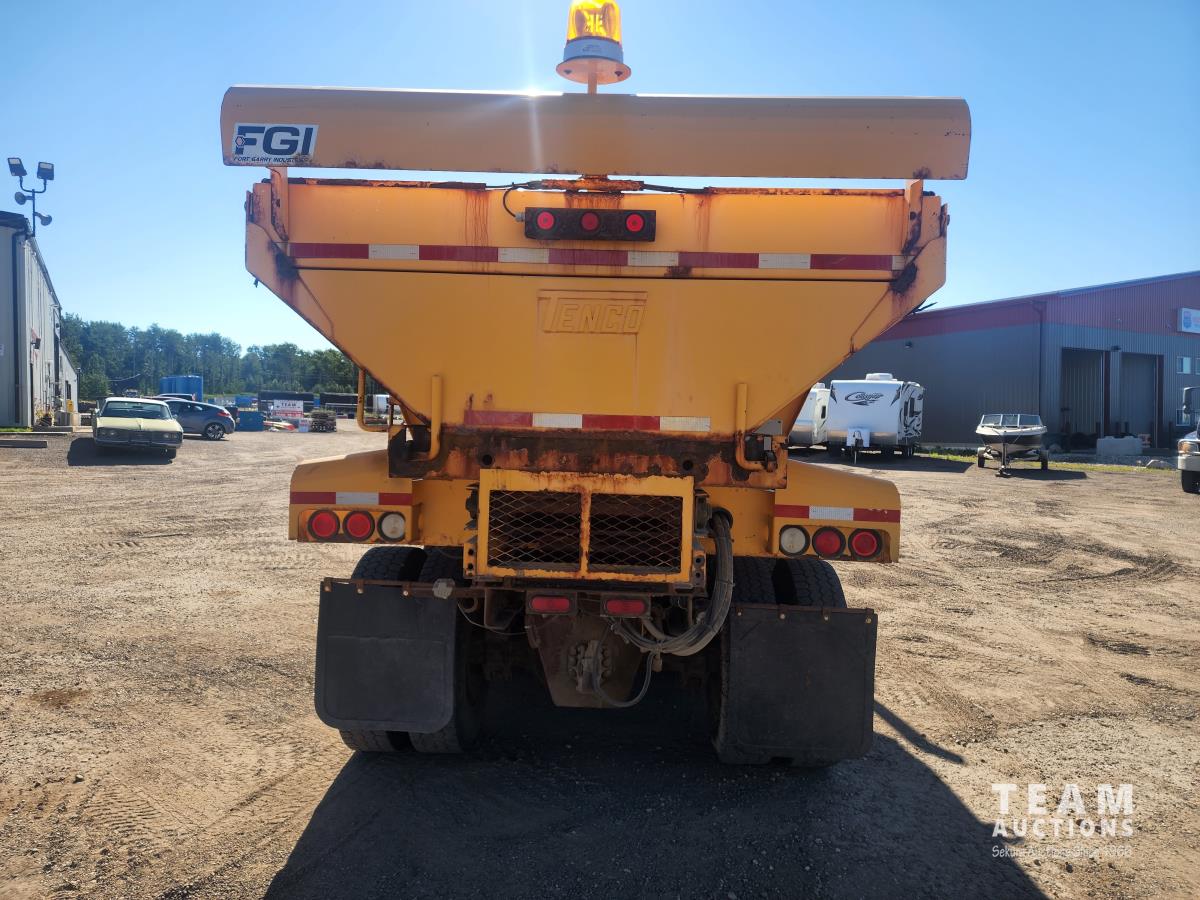 CAT C12 engine, Eaton Fuller 13 speed transmission, 18,000 lb front, 46,000 lb rears, differential lock, air ride suspension, pintle hitch, Tenco 14 ft box, 11R22.5 inch tires