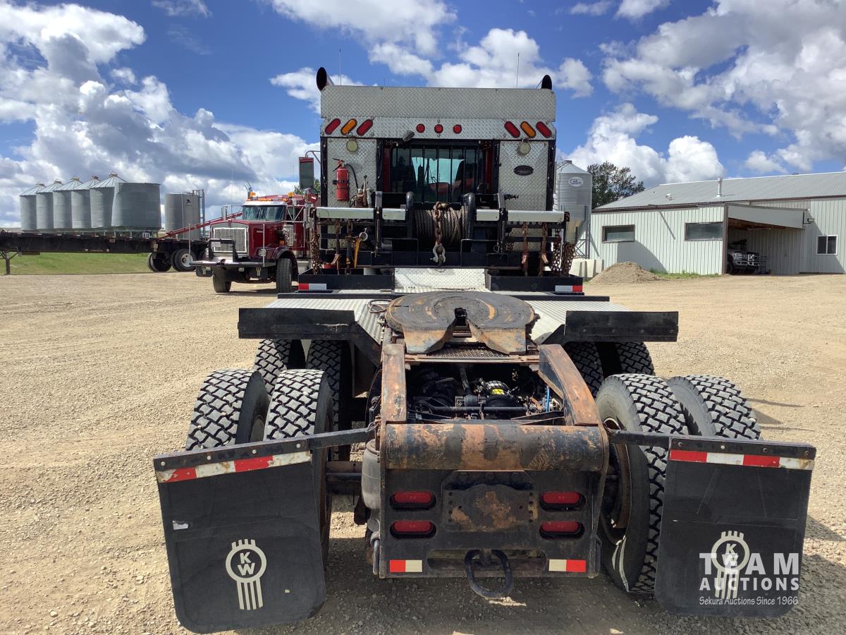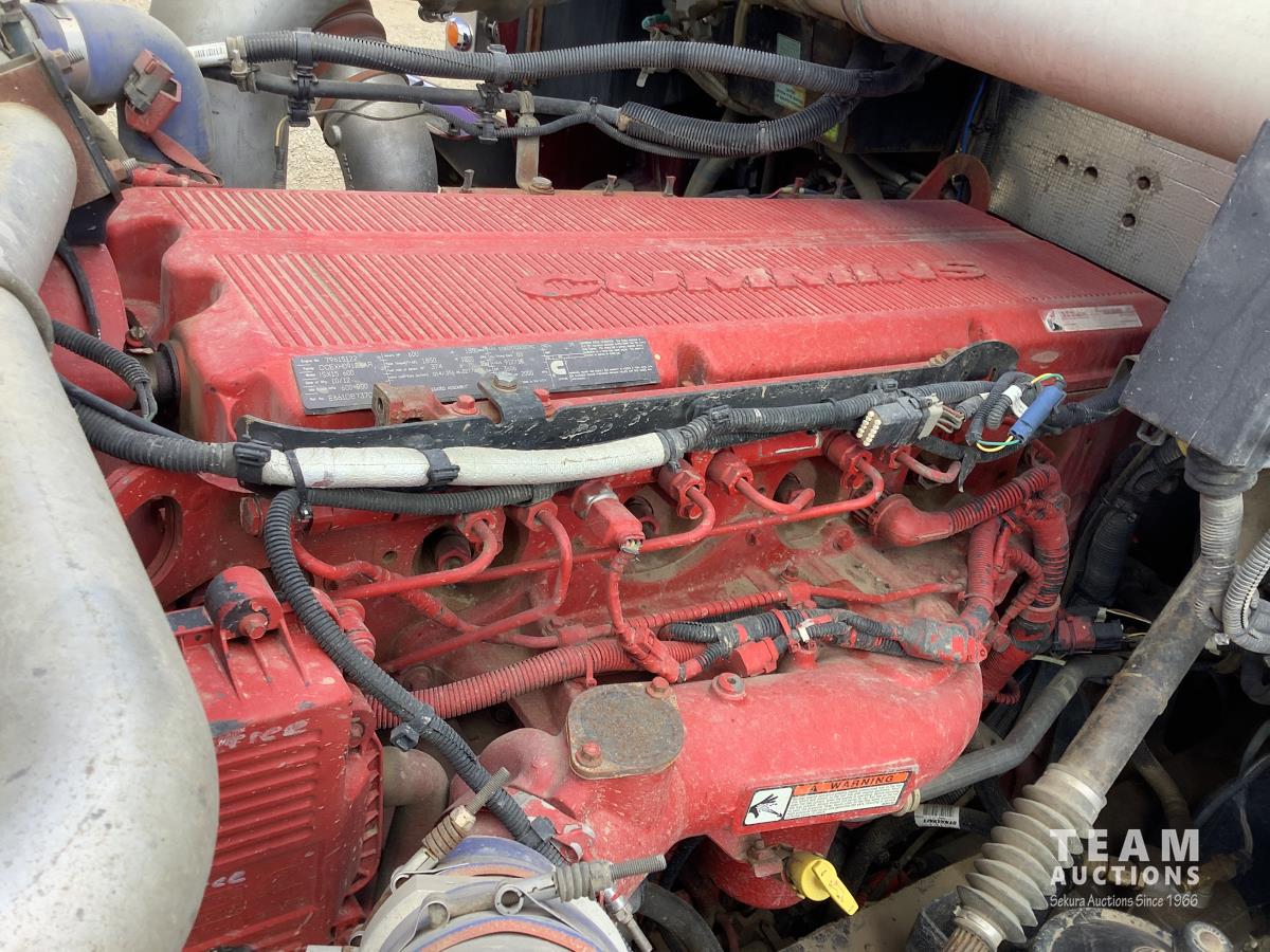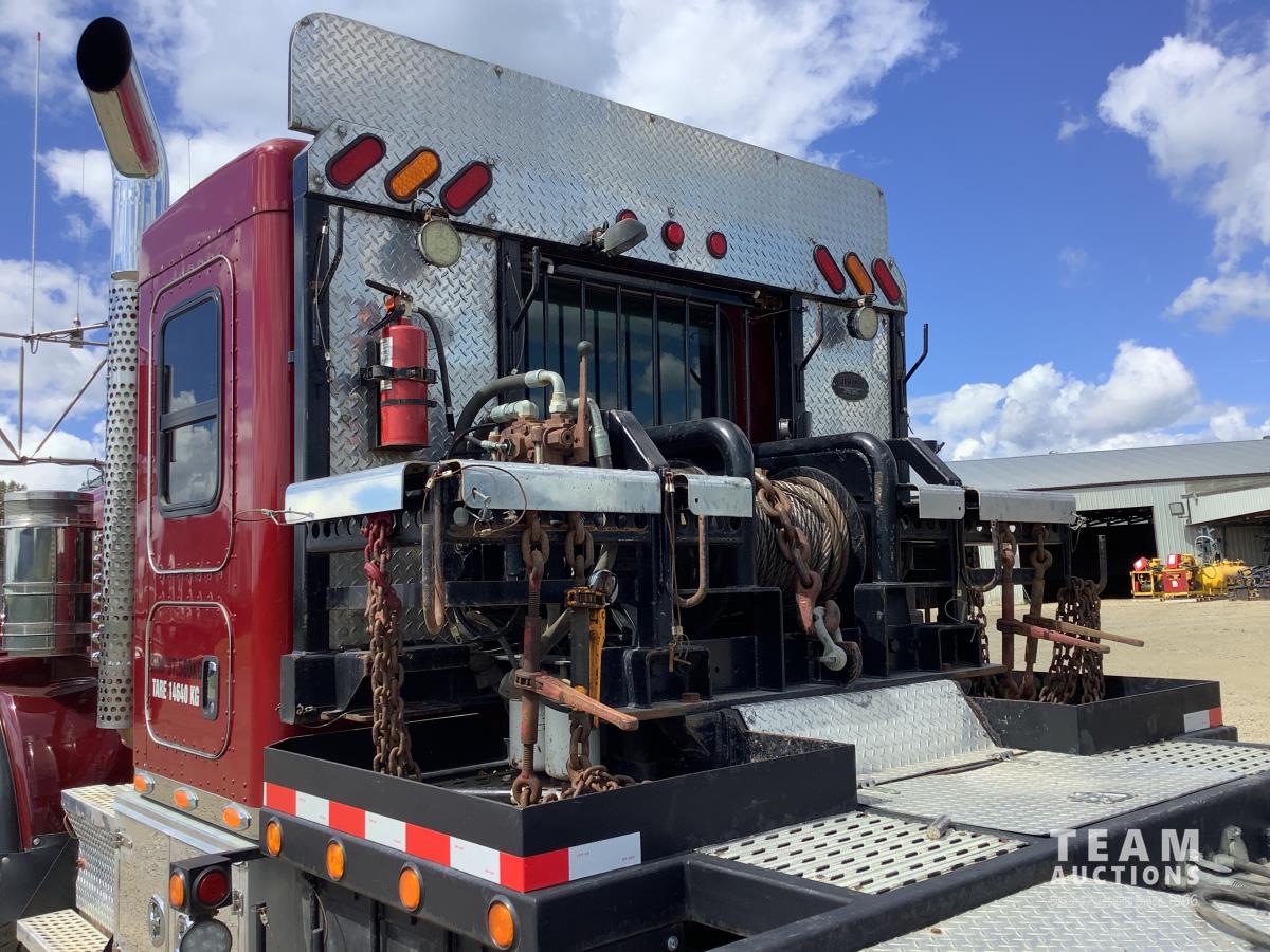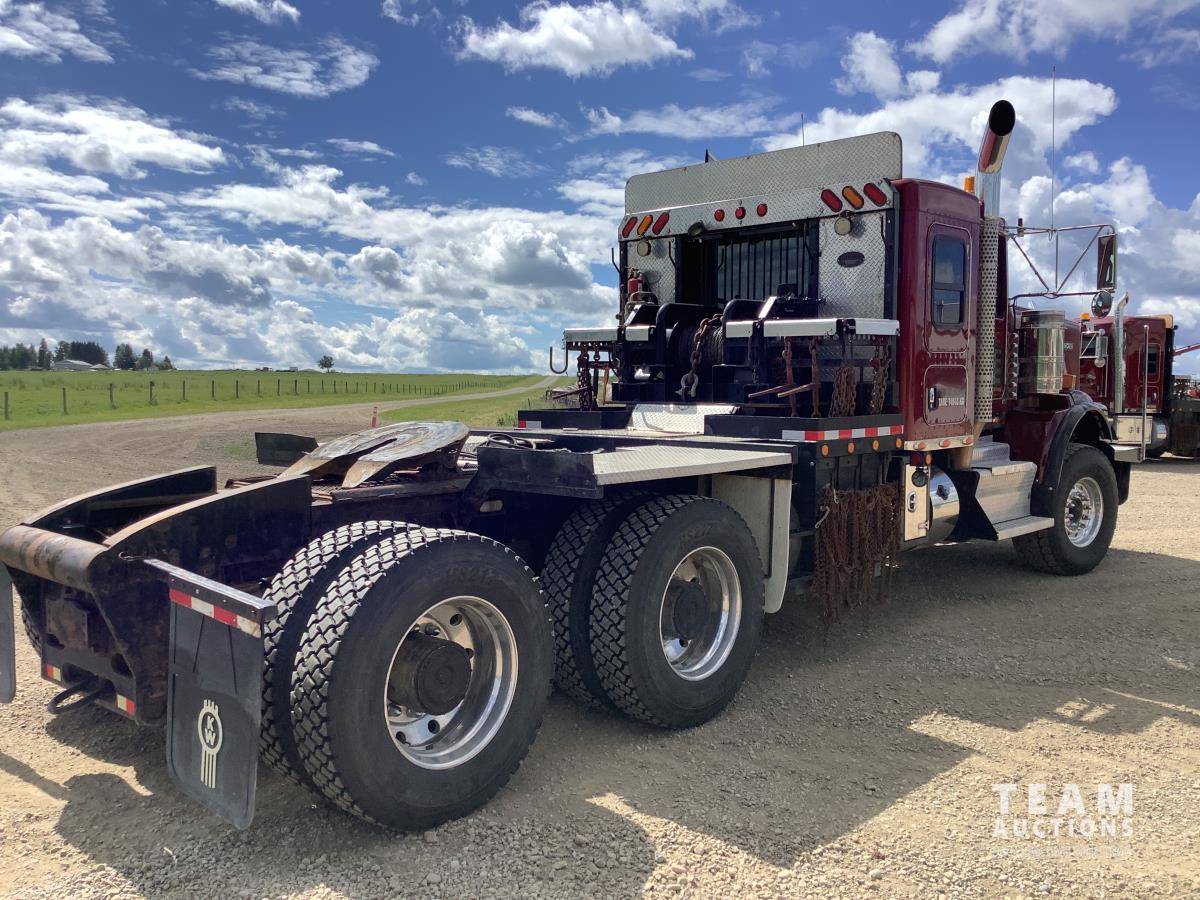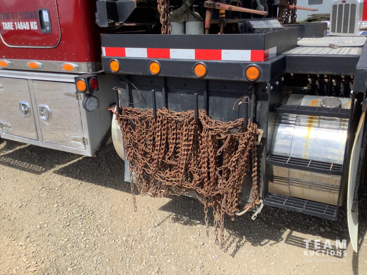 Cummins ISX, 600 HP, Eaton Fuller 18 speed transmission, 4 speed auxiliary transmission, 19,400 lb front, 46,000 lb rears, NeWay air ride suspension, above mount maxi brake pots, wide track axels, planetary drive system, dual steer boxes, 42 inch flat top sleeper, rear window, engine heater, Airco rig up, Tulsa, RN65P-5RXOA2 hydraulic drive winch, rear fenders, full cat walk, sliding fifth wheel, rear live roll, hitch plate, air lift wide load sign, beacon lights, tool boxes, wheel chains, 425/65R22.5 front, 11R24.5 rear