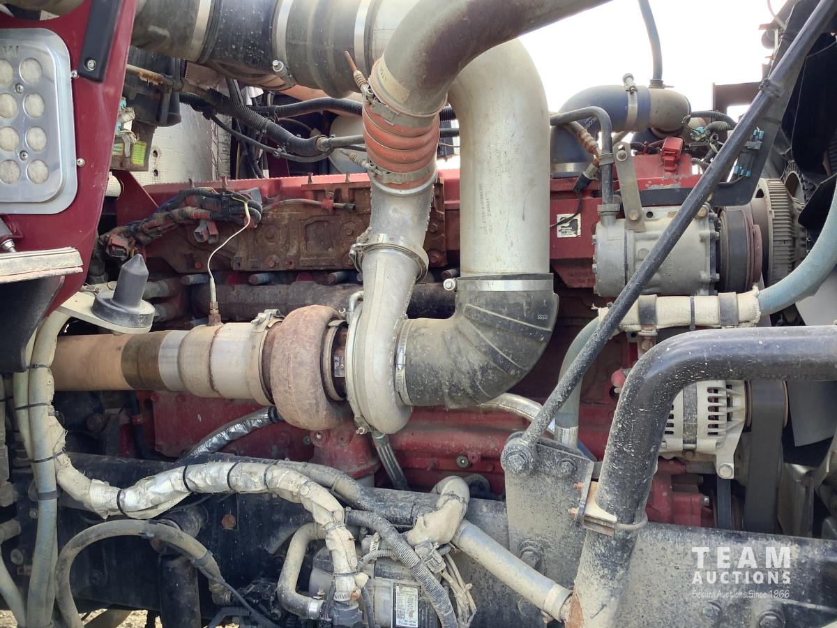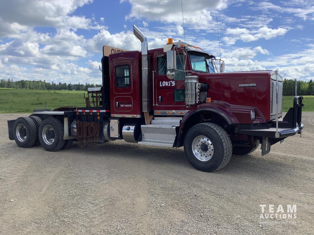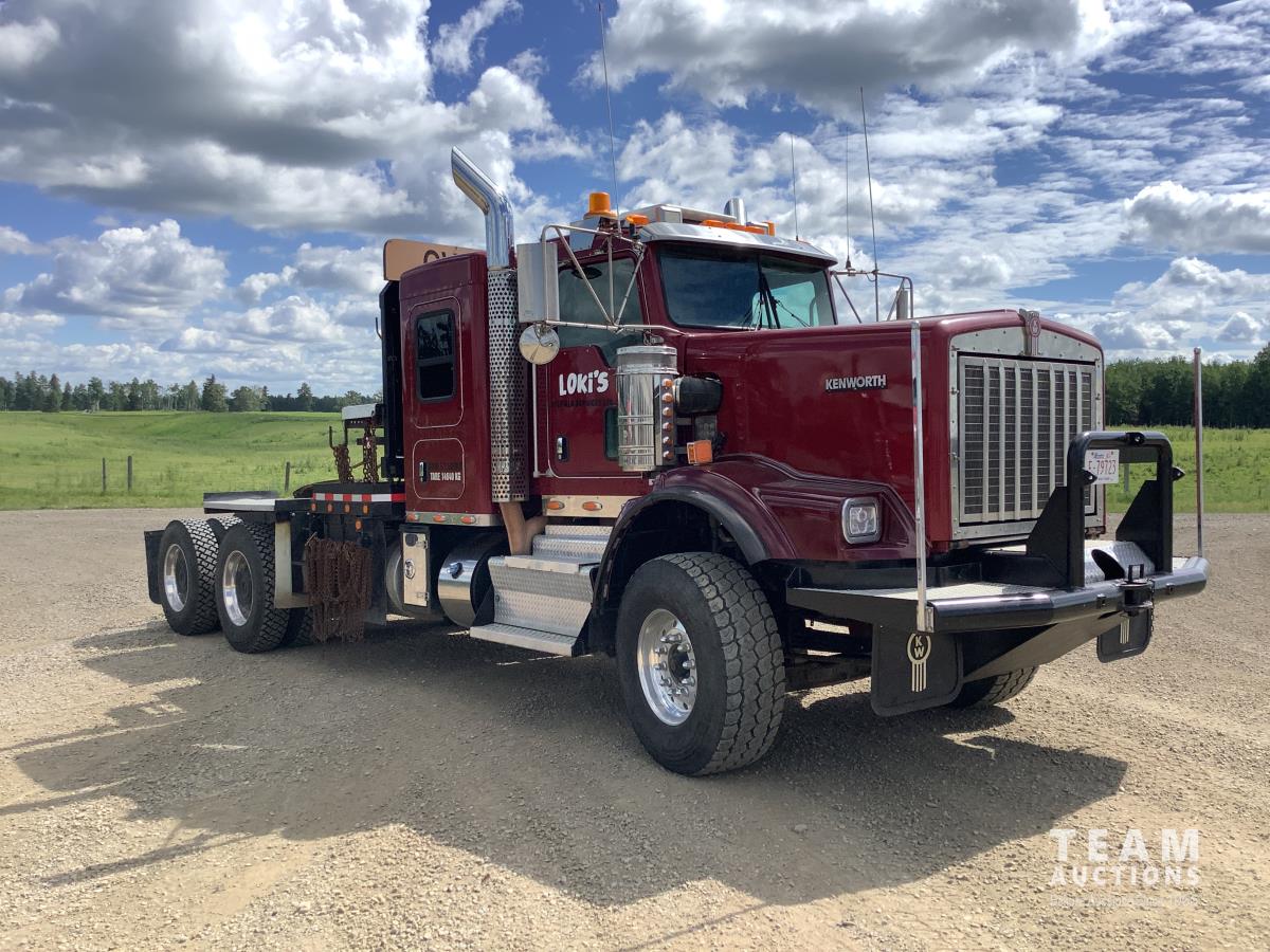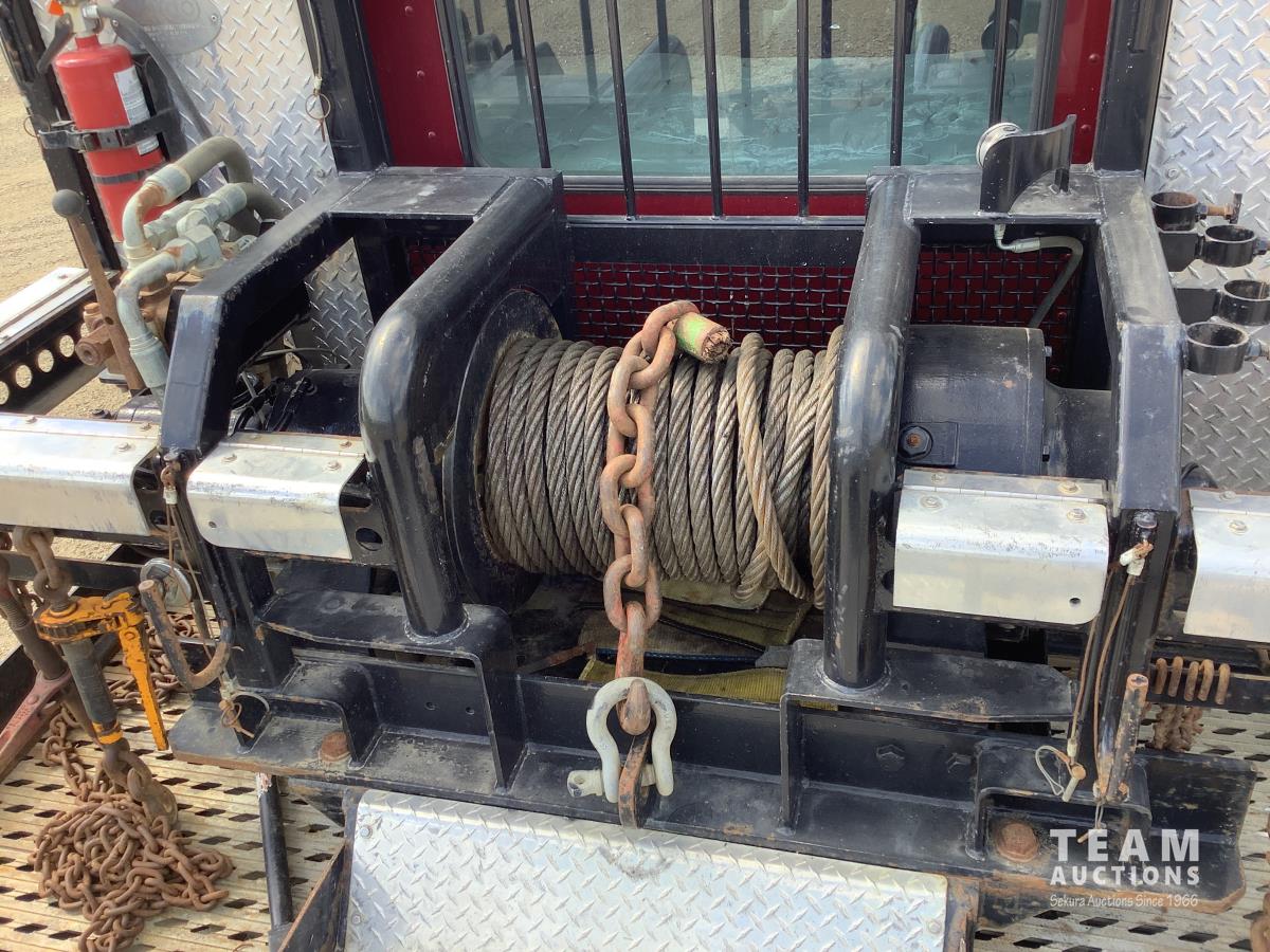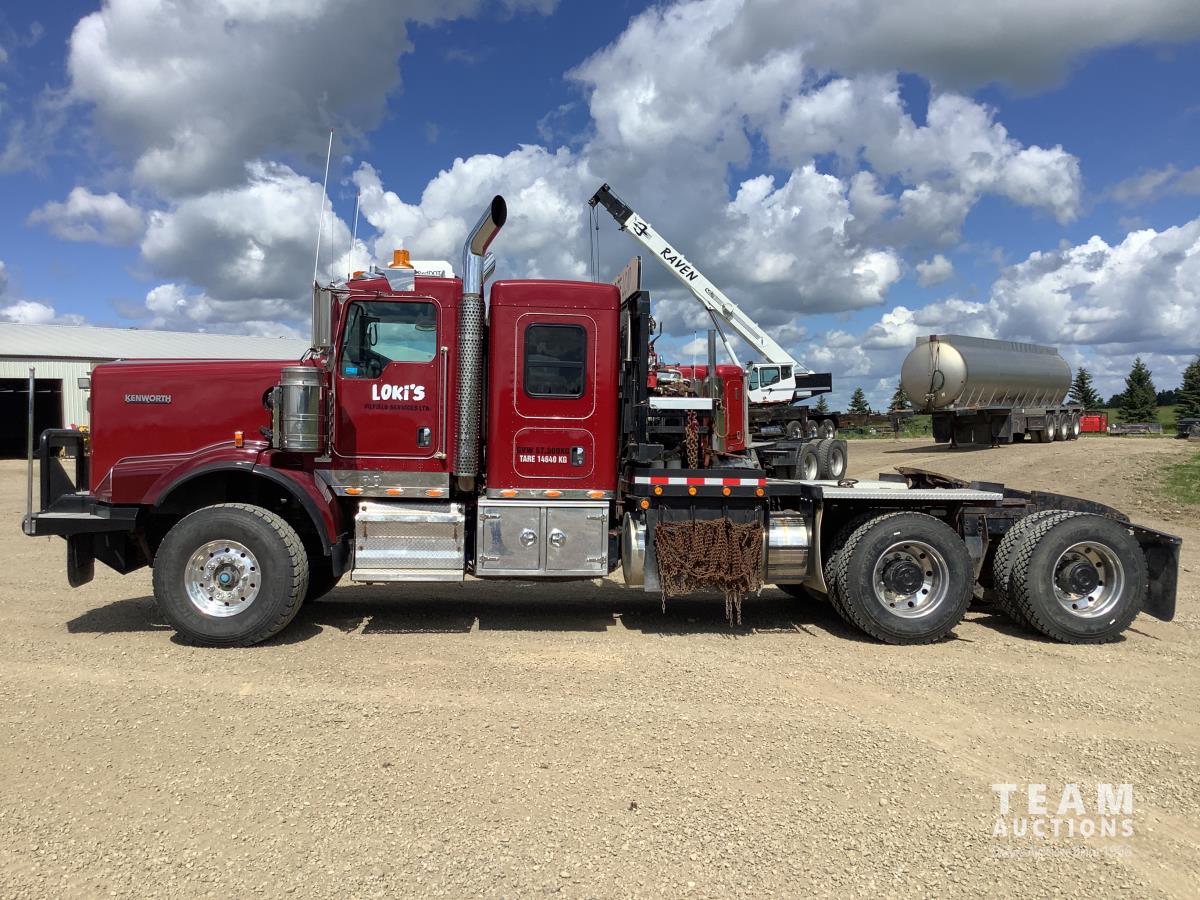 Cummins ISX, 600 HP, Eaton Fuller 18 speed transmission, 4 speed auxiliary transmission, 19,400 lb front, 46,000 lb rears, NeWay air ride suspension, above mount maxi brake pots, wide track axels, planetary drive system, dual steer boxes, 42 inch flat top sleeper, rear window, engine heater, Airco rig up, Tulsa, RN65P-5RXOA2 hydraulic drive winch, rear fenders, full cat walk, sliding fifth wheel, rear live roll, hitch plate, air lift wide load sign, beacon lights, tool boxes, wheel chains, 425/65R22.5 front, 11R24.5 rear