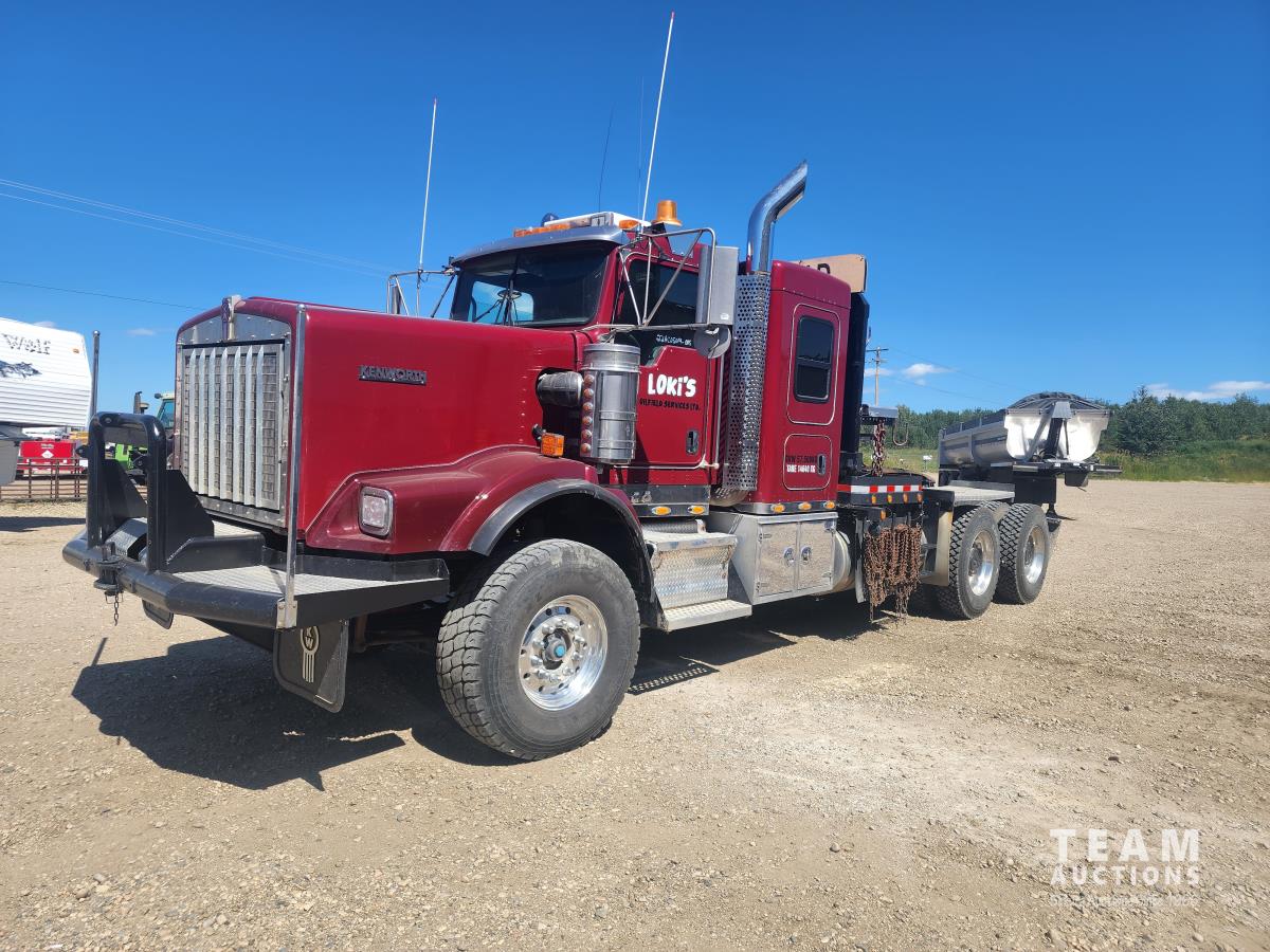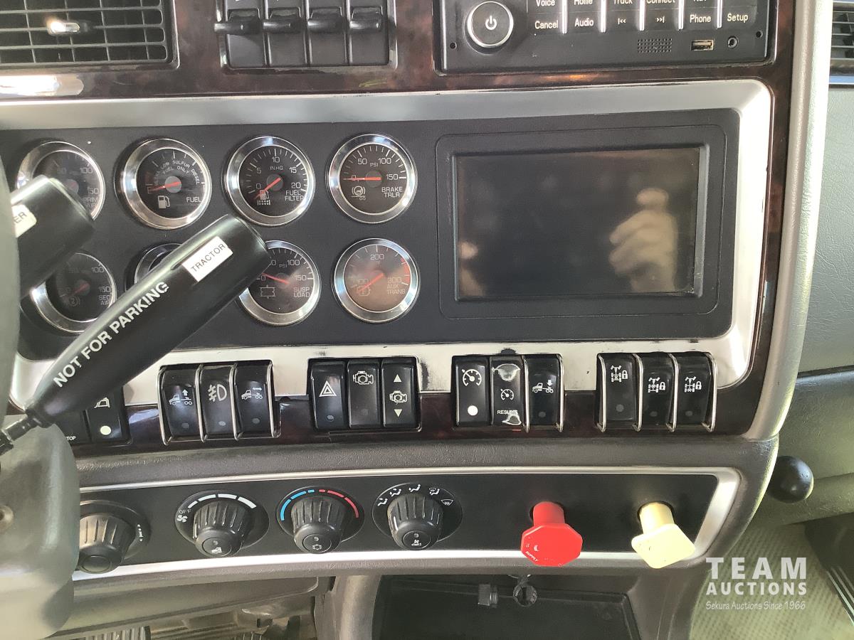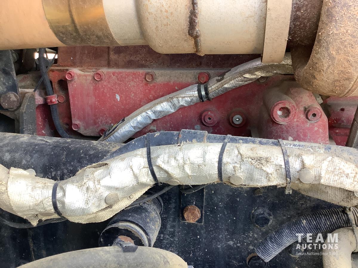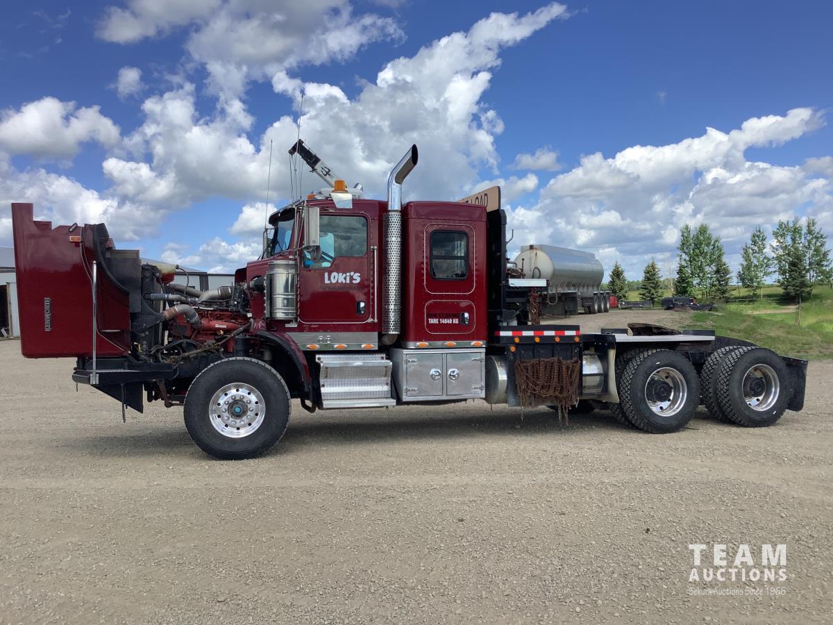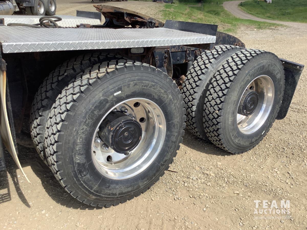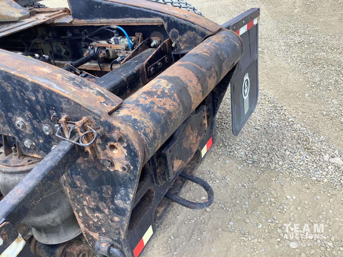 Cummins ISX, 600 HP, Eaton Fuller 18 speed transmission, 4 speed auxiliary transmission, 19,400 lb front, 46,000 lb rears, NeWay air ride suspension, above mount maxi brake pots, wide track axels, planetary drive system, dual steer boxes, 42 inch flat top sleeper, rear window, engine heater, Airco rig up, Tulsa, RN65P-5RXOA2 hydraulic drive winch, rear fenders, full cat walk, sliding fifth wheel, rear live roll, hitch plate, air lift wide load sign, beacon lights, tool boxes, wheel chains, 425/65R22.5 front, 11R24.5 rear