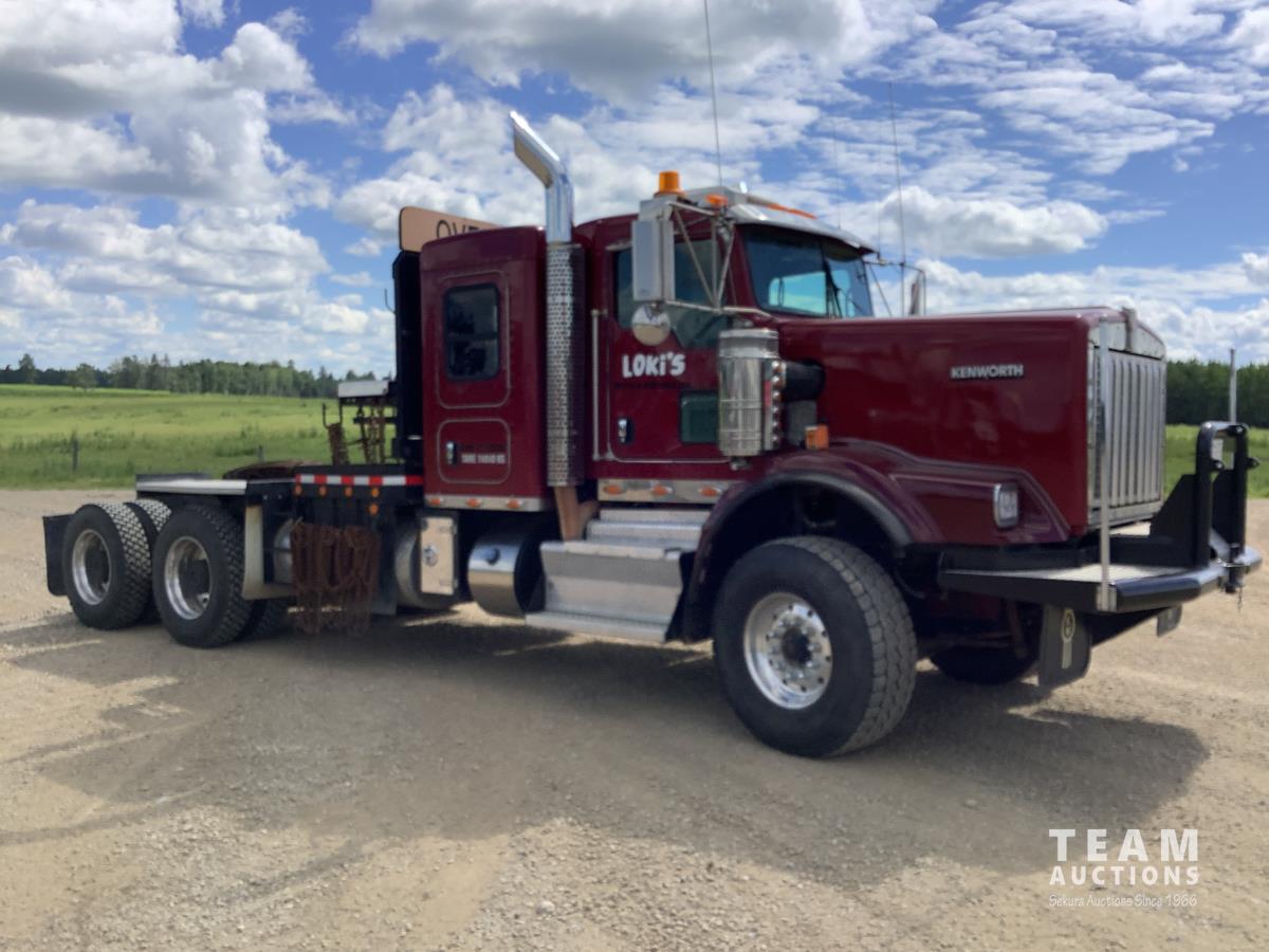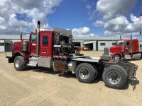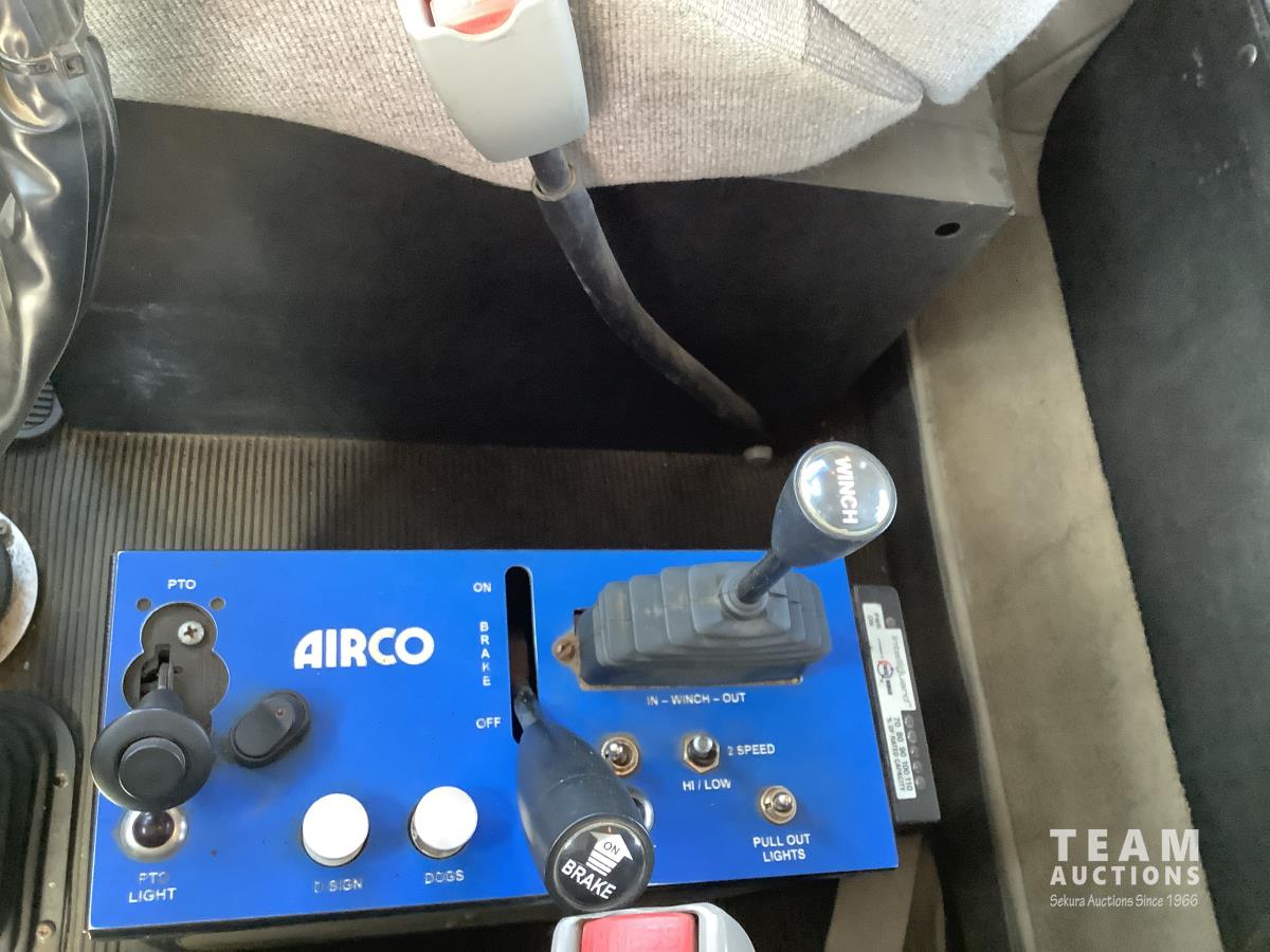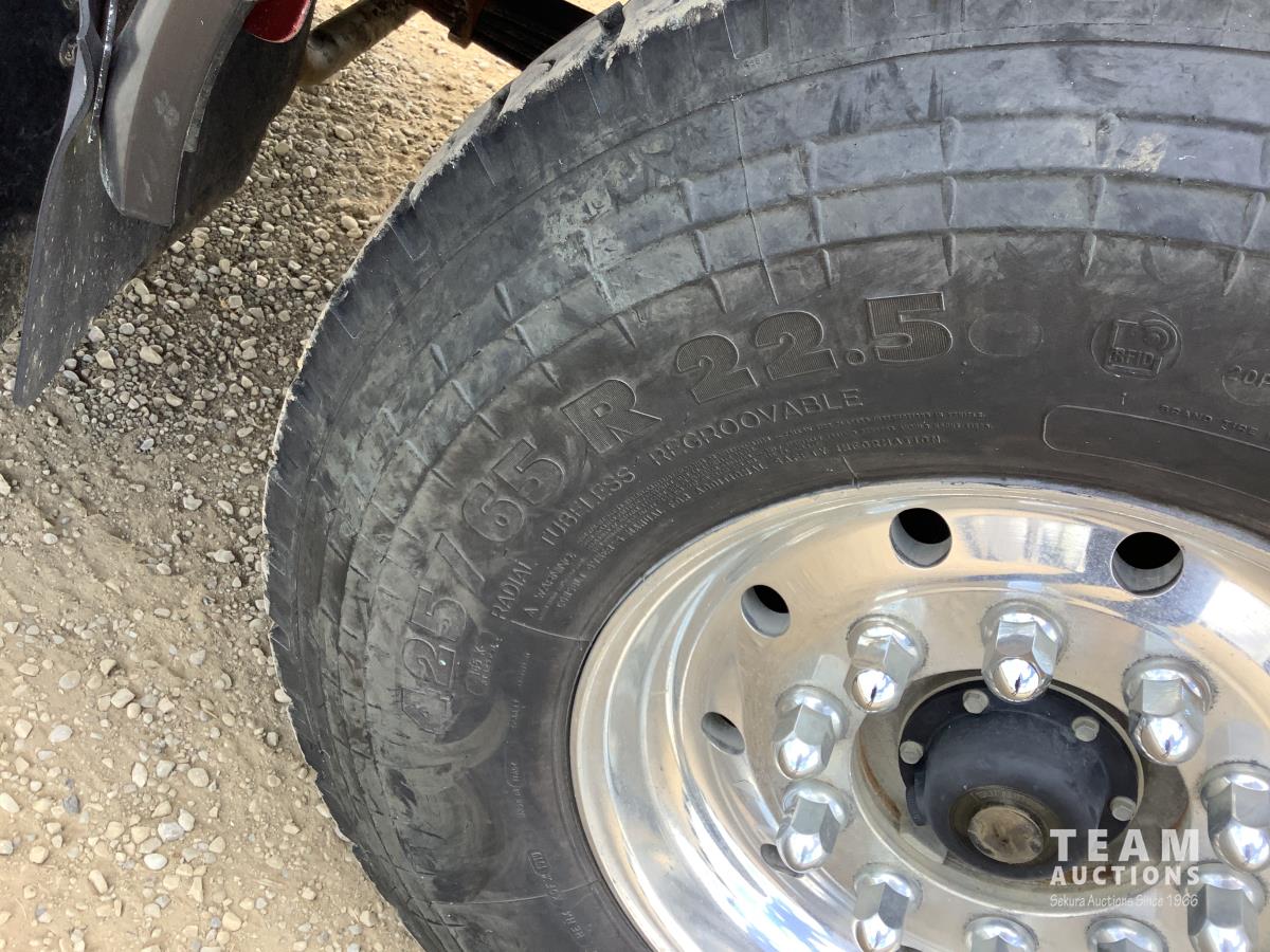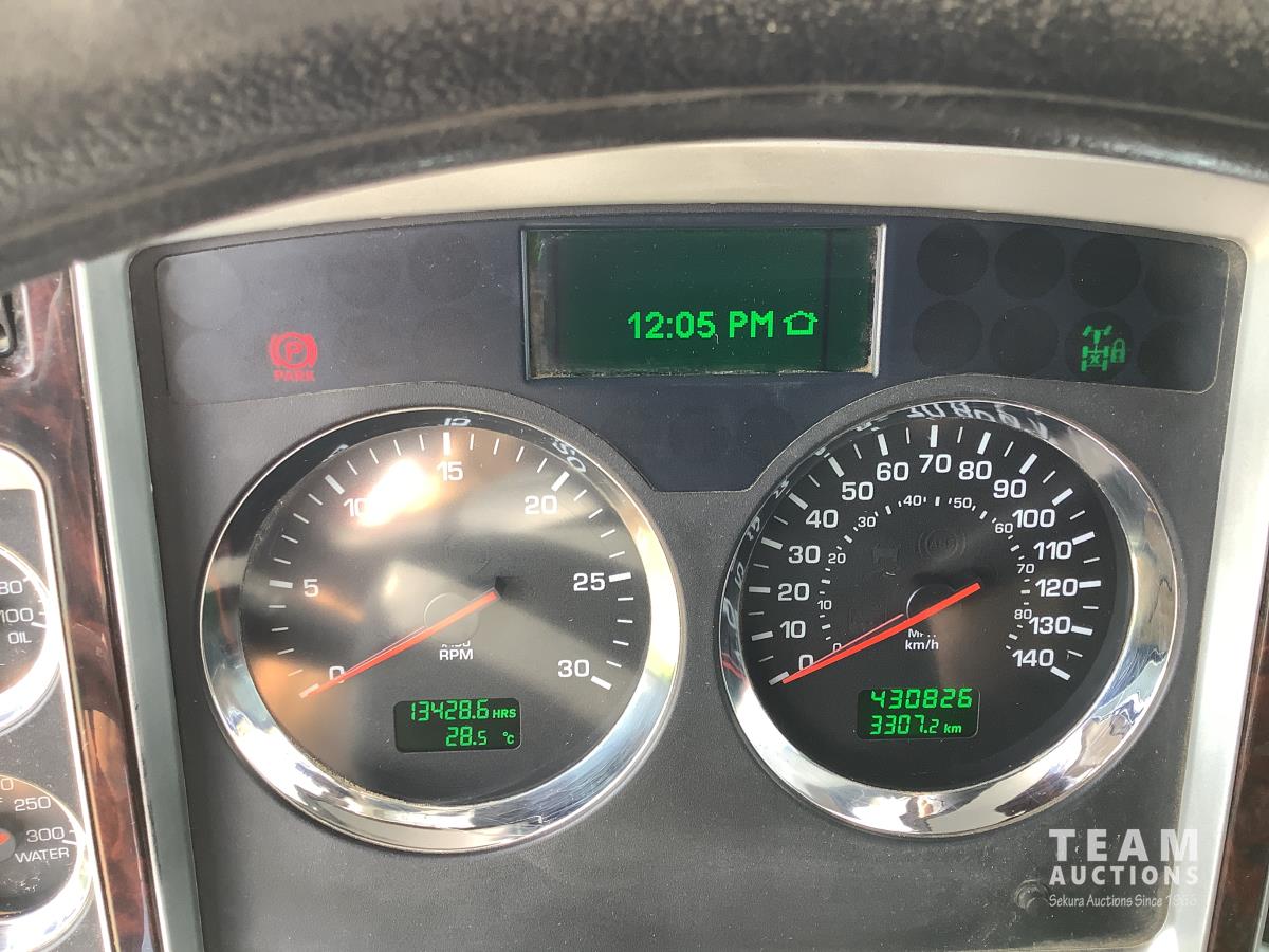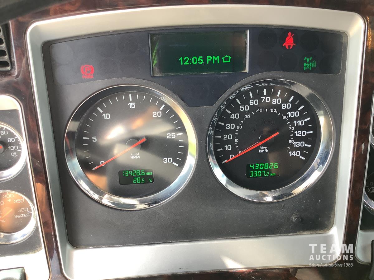 Cummins ISX, 600 HP, Eaton Fuller 18 speed transmission, 4 speed auxiliary transmission, 19,400 lb front, 46,000 lb rears, NeWay air ride suspension, above mount maxi brake pots, wide track axels, planetary drive system, dual steer boxes, 42 inch flat top sleeper, rear window, engine heater, Airco rig up, Tulsa, RN65P-5RXOA2 hydraulic drive winch, rear fenders, full cat walk, sliding fifth wheel, rear live roll, hitch plate, air lift wide load sign, beacon lights, tool boxes, wheel chains, 425/65R22.5 front, 11R24.5 rear