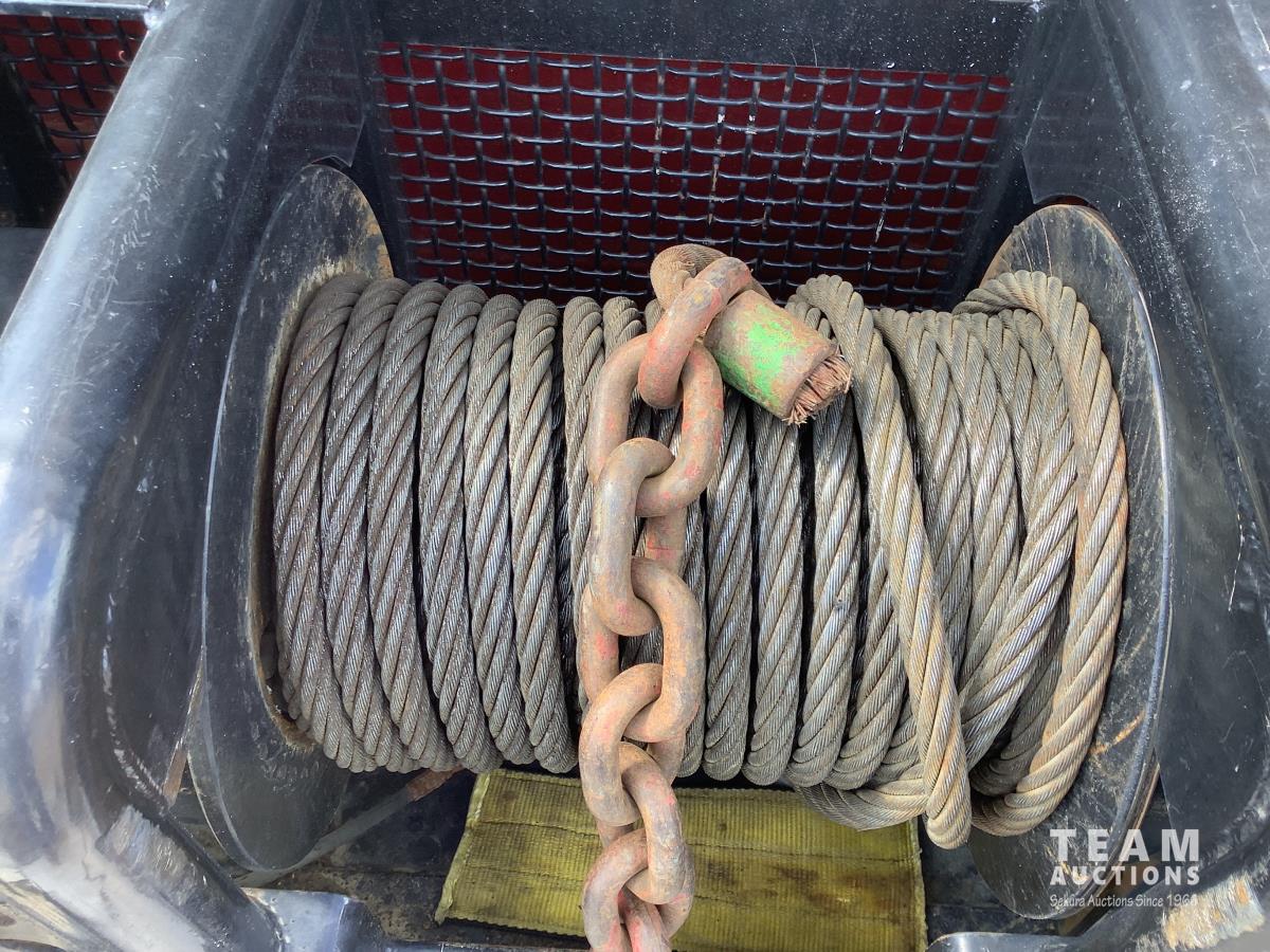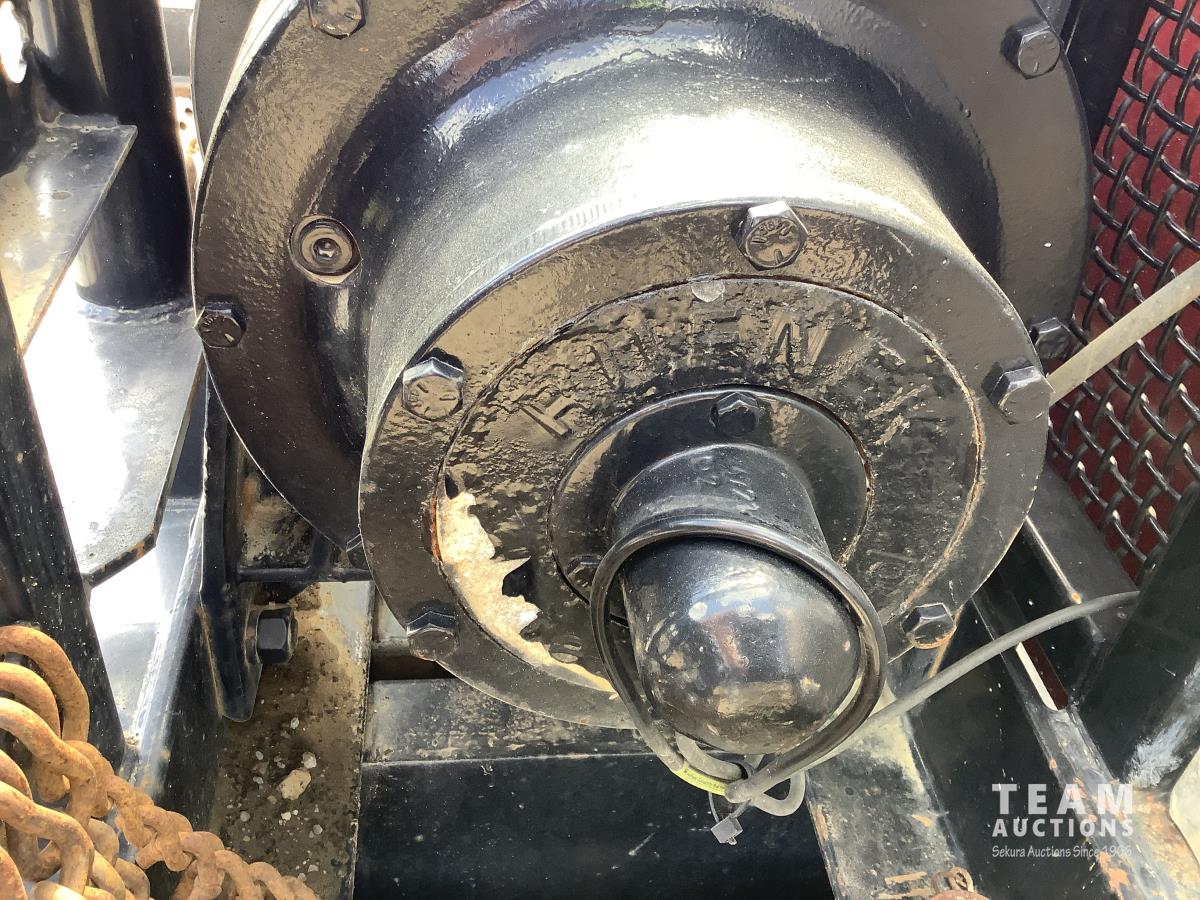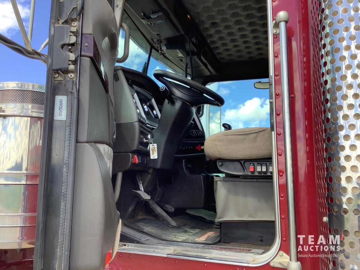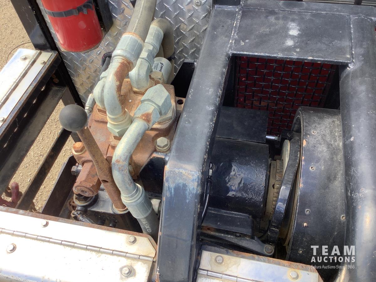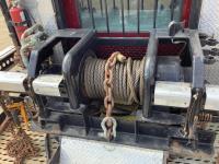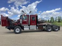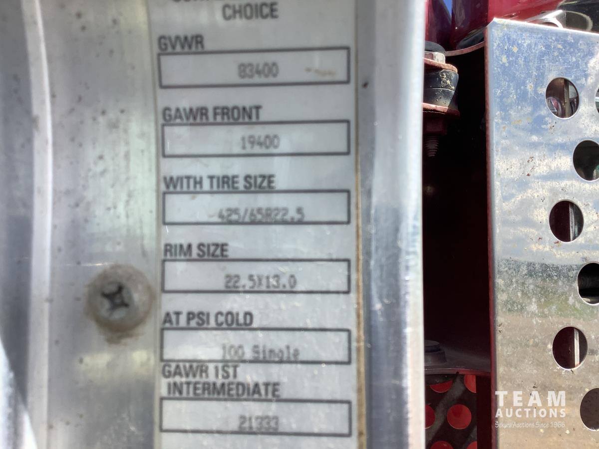 Cummins ISX, 600 HP, Eaton Fuller 18 speed transmission, 4 speed auxiliary transmission, 19,400 lb front, 46,000 lb rears, NeWay air ride suspension, above mount maxi brake pots, wide track axels, planetary drive system, dual steer boxes, 42 inch flat top sleeper, rear window, engine heater, Airco rig up, Tulsa, RN65P-5RXOA2 hydraulic drive winch, rear fenders, full cat walk, sliding fifth wheel, rear live roll, hitch plate, air lift wide load sign, beacon lights, tool boxes, wheel chains, 425/65R22.5 front, 11R24.5 rear
