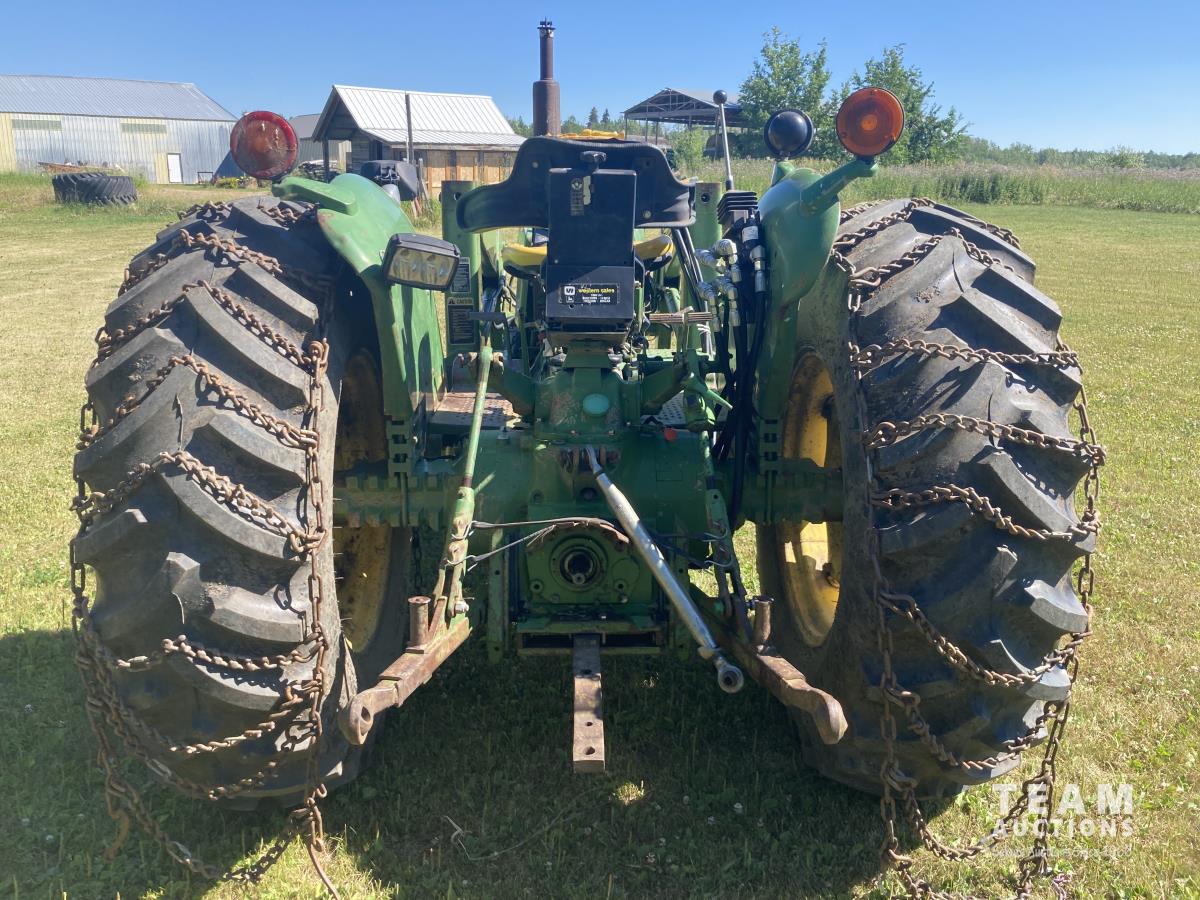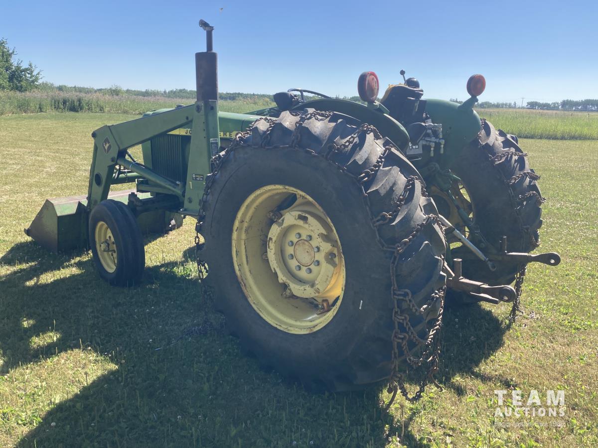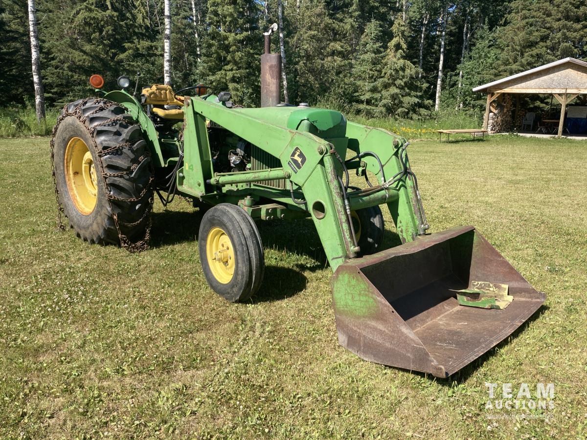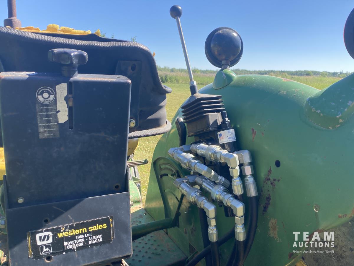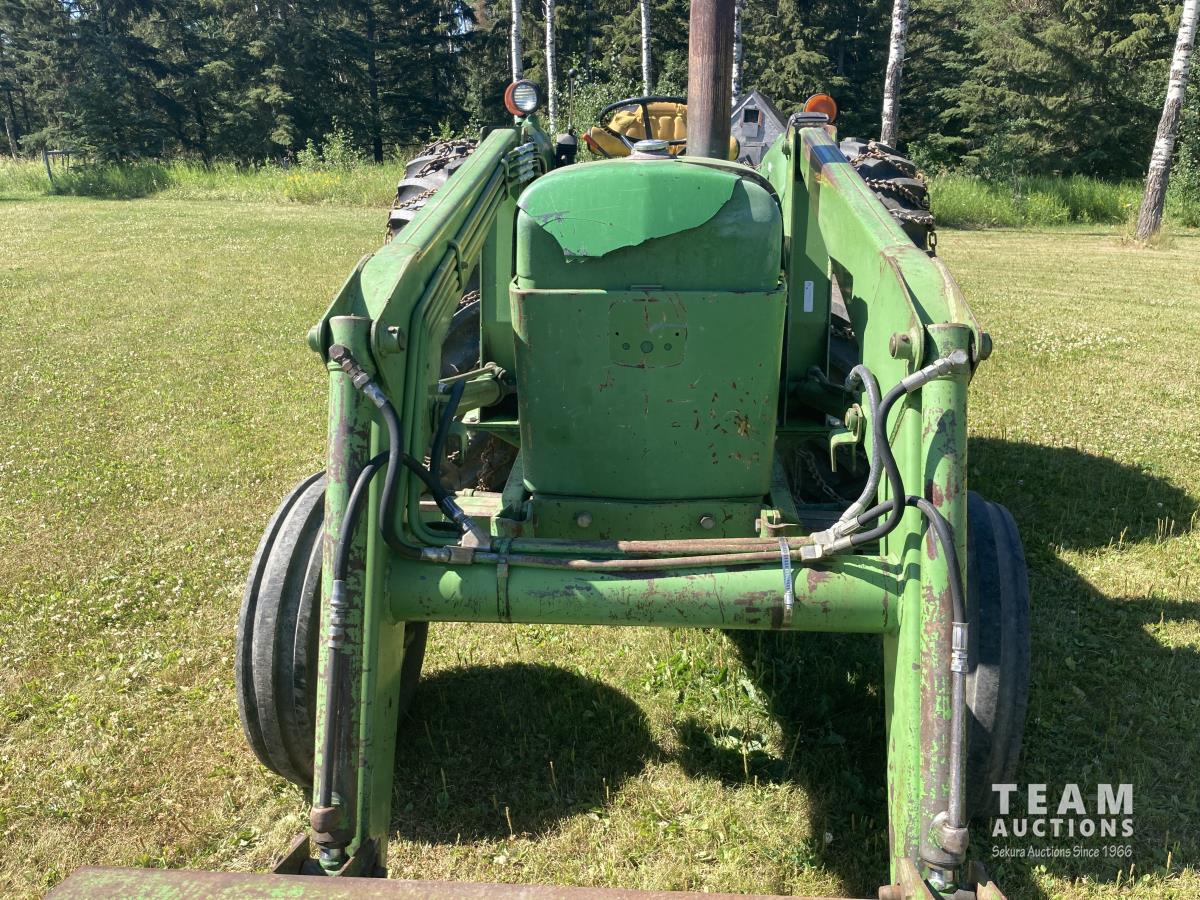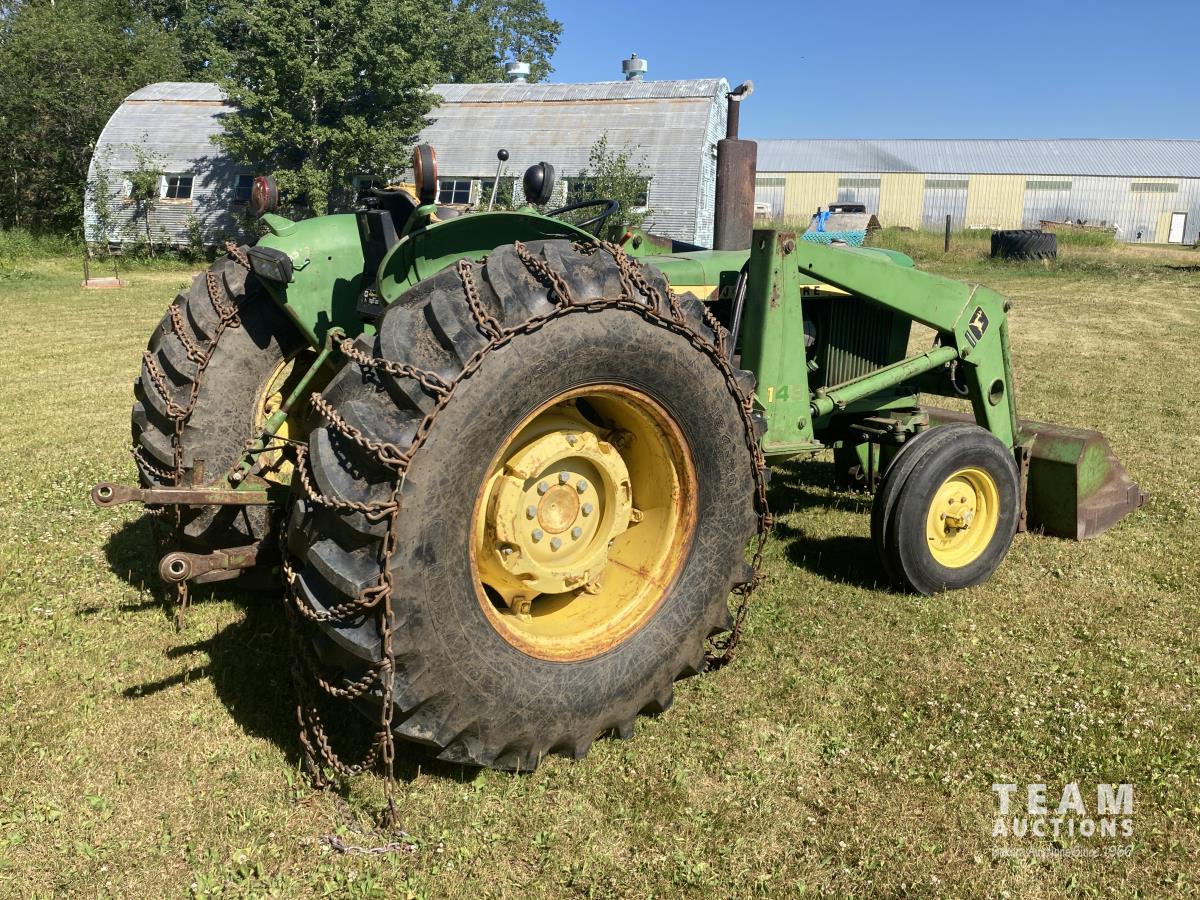 John Deere 148 front end loader, 60 inch bucket, 3 PT, 540 PTO, tire chains, 7.50-16SL front tires, 18.4-30 rear tires