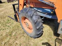 16 speed transmission, Kubota 796 loader, cab, joystick, 3 PT, 540 PTO, (2) hydraulic outlets, 7 ft bucket, bale forks, 12.4-24 front tires, 18.4-34 rear tires