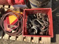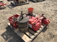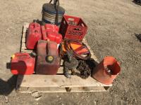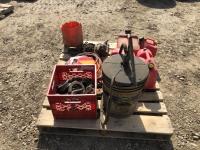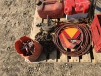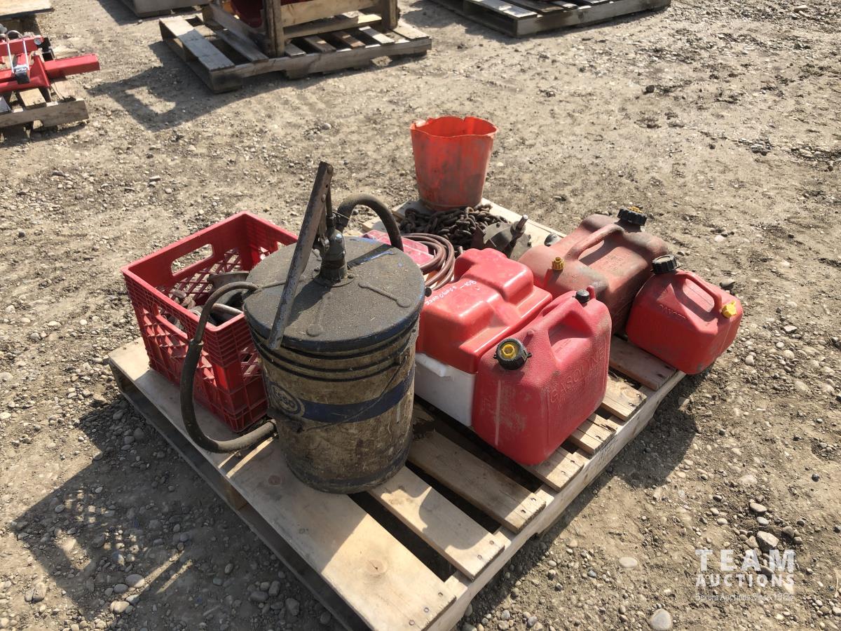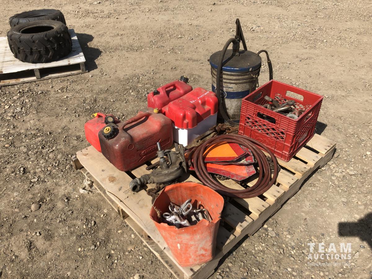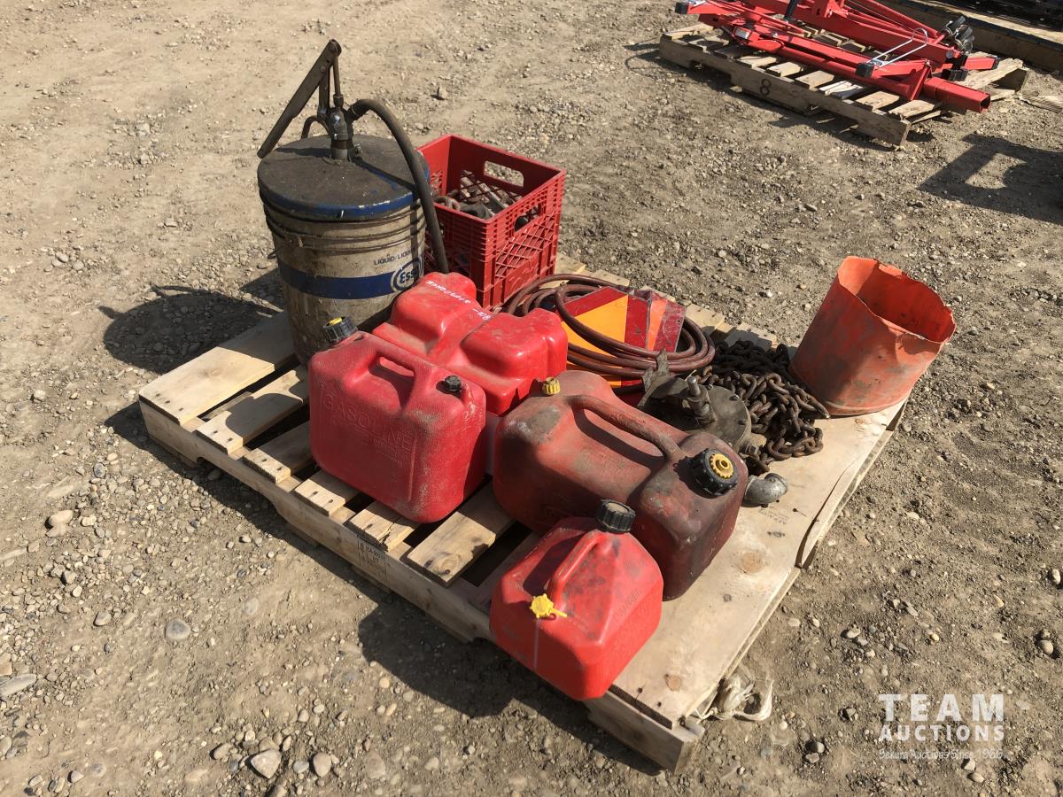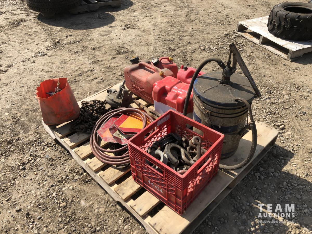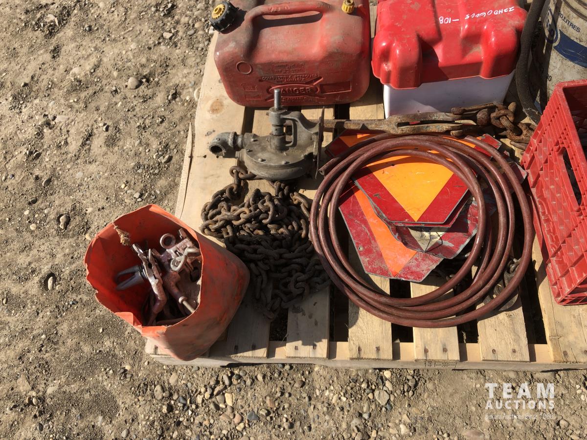 barrel pump, jerry cans, chain boomers, miscellaneous clevises, air hose, slow moving decals, battery box