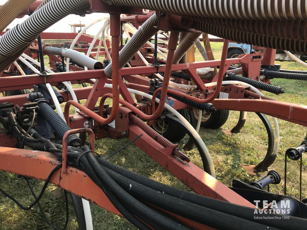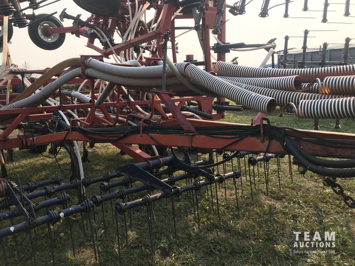 9 inch spacing, 600 lb break away sweeps, single shoot, grass deflectors, 4 bar mounted harrows, Morris 6180 (3) compartment air cart, single hydraulic fan, no monitor