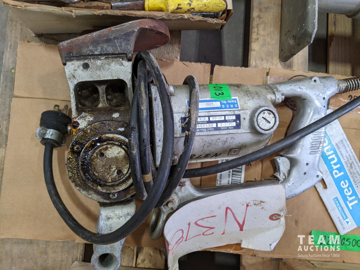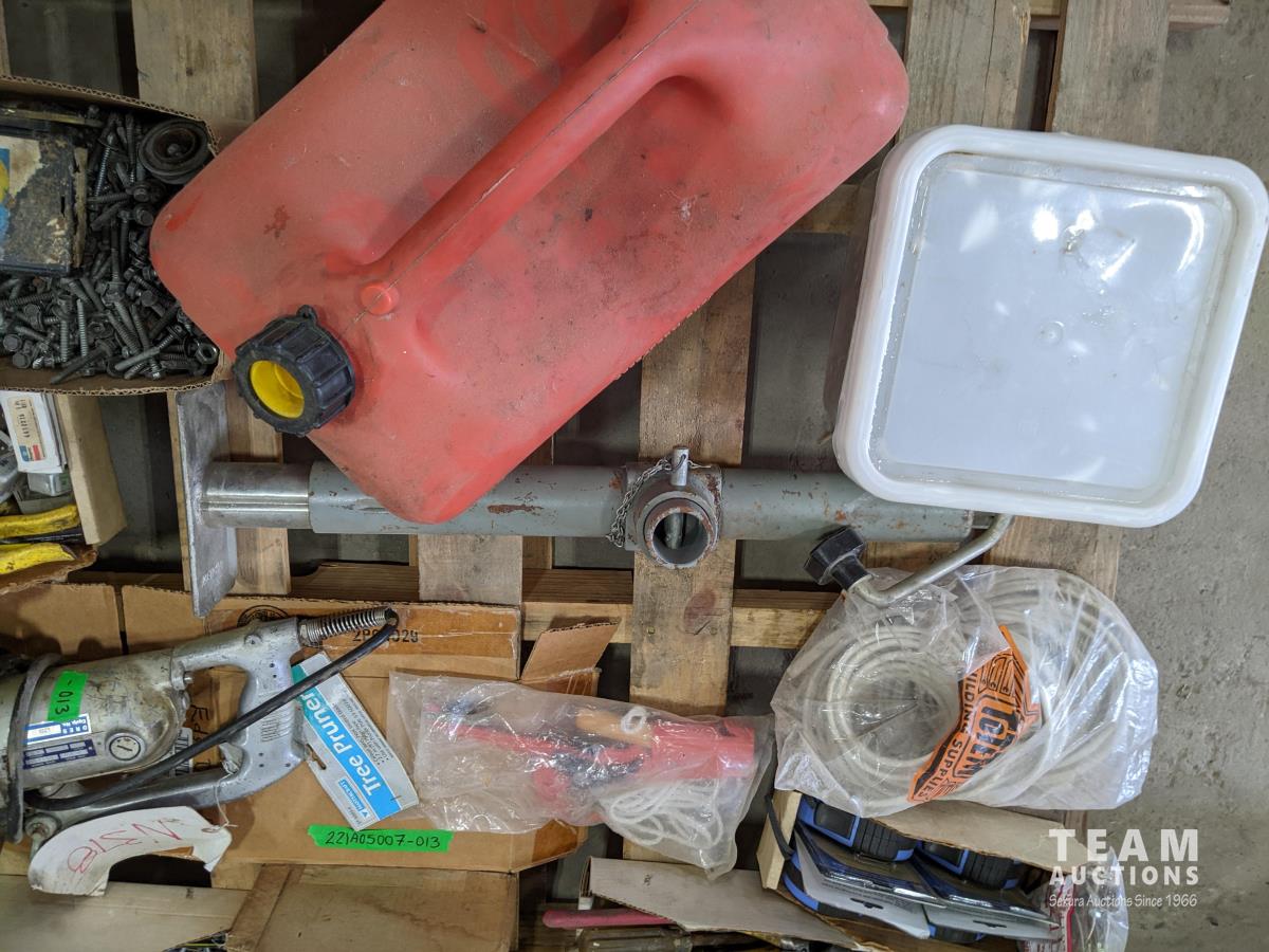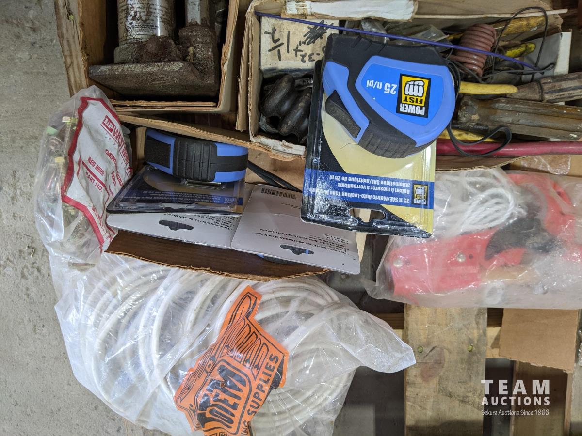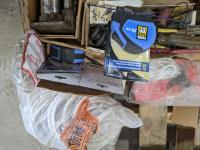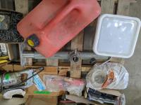 Various hardware, jerry can, tree pruner, implement jack, tape measures