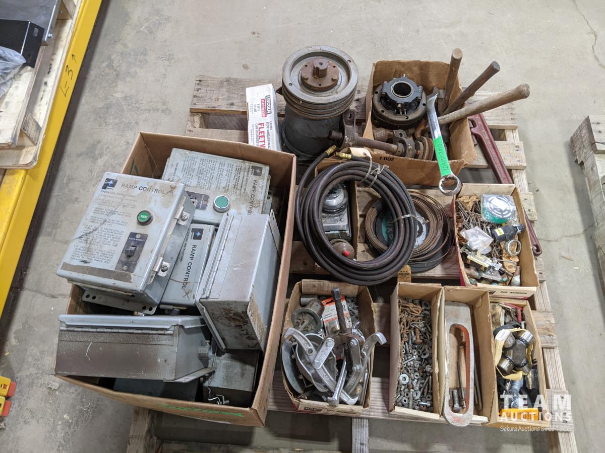 Box of ramp control boxes, gear puller, assorted bolts, welding rods