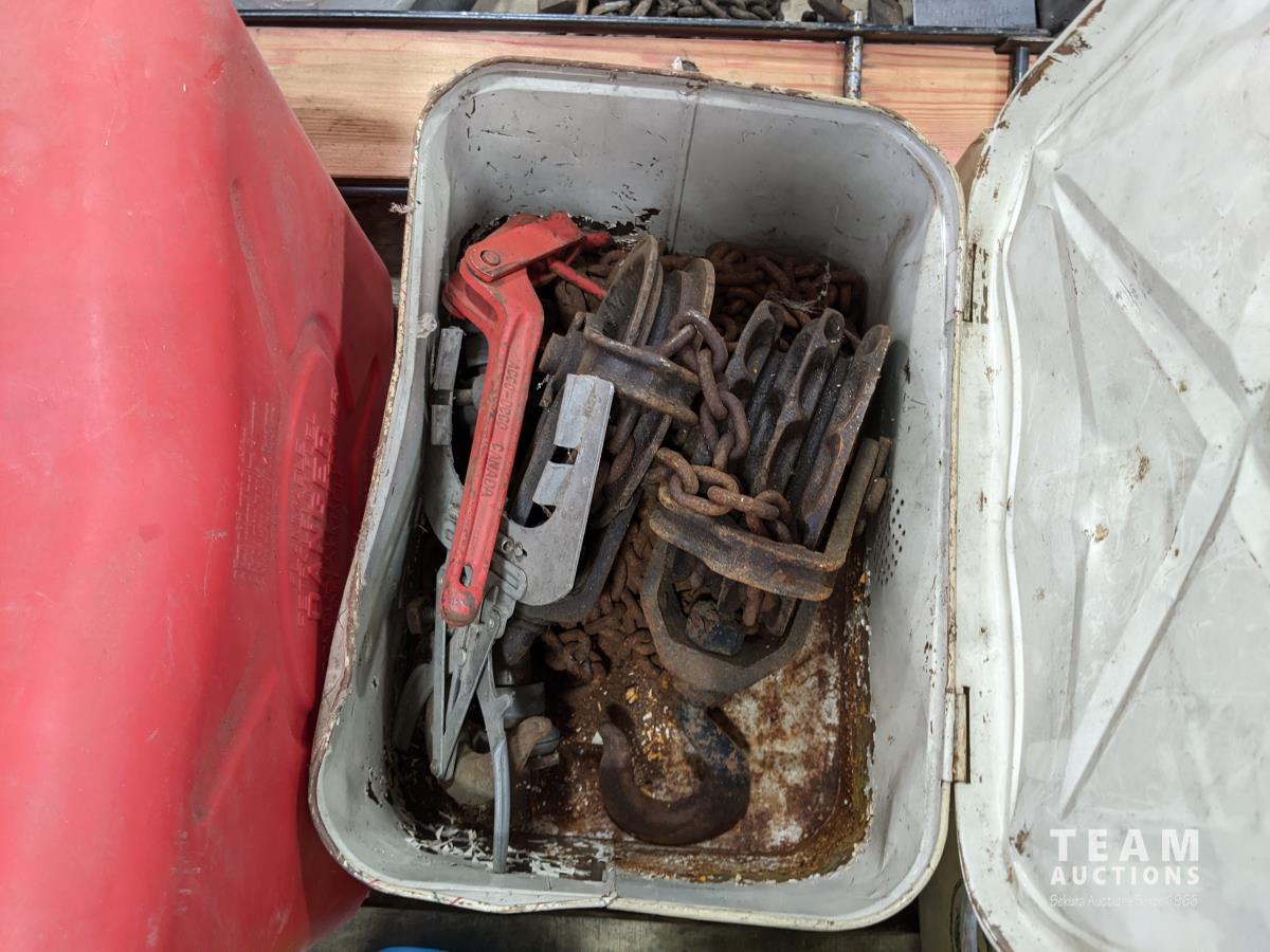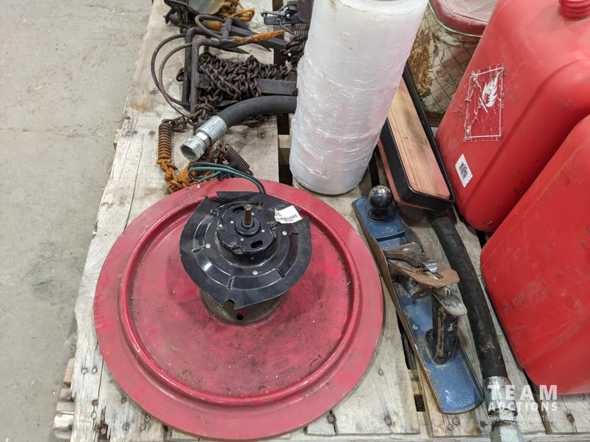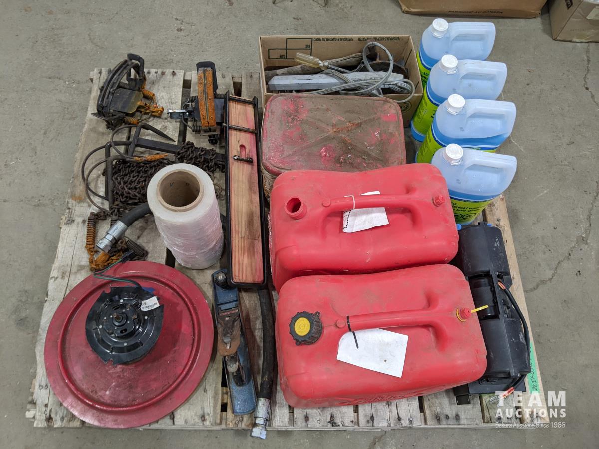 Jerry cans, no name windshield washer fluid, traps, blower, pulleys and boomers, hand tools