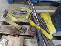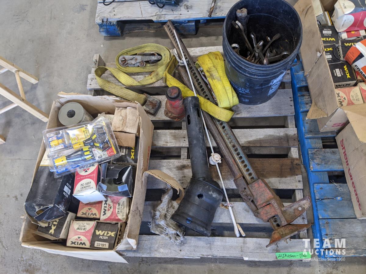 Assorted filters, jackall, wrenches, ratchet straps