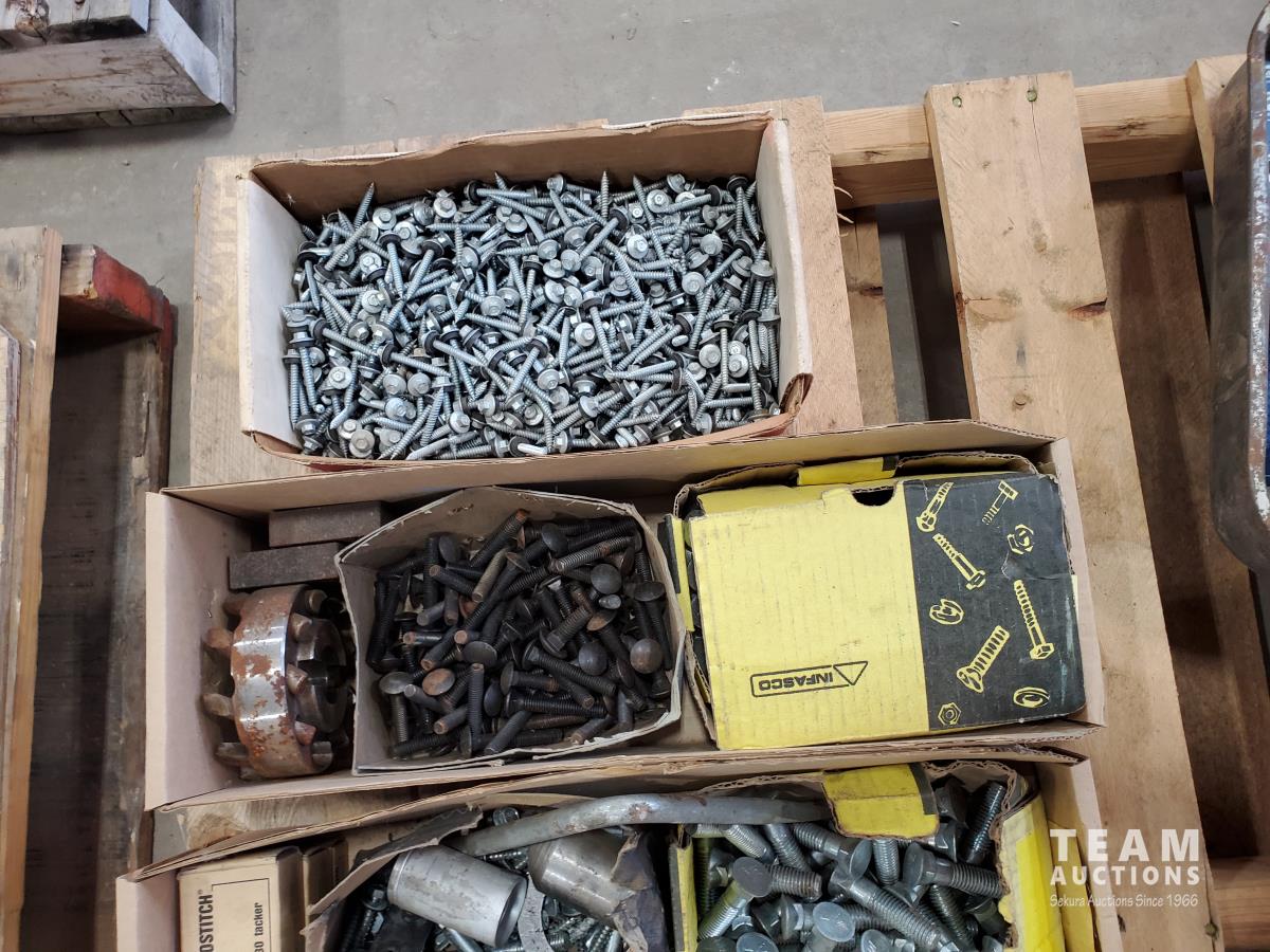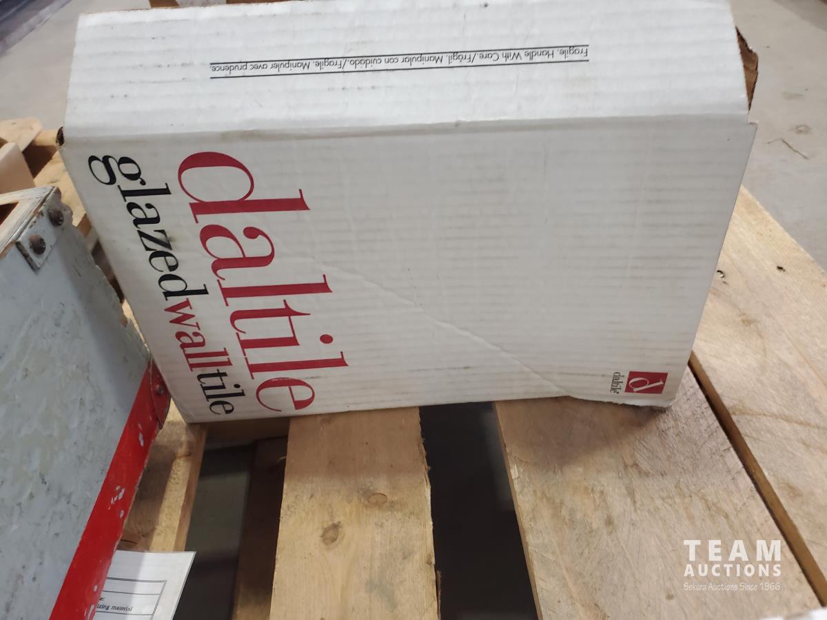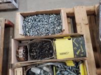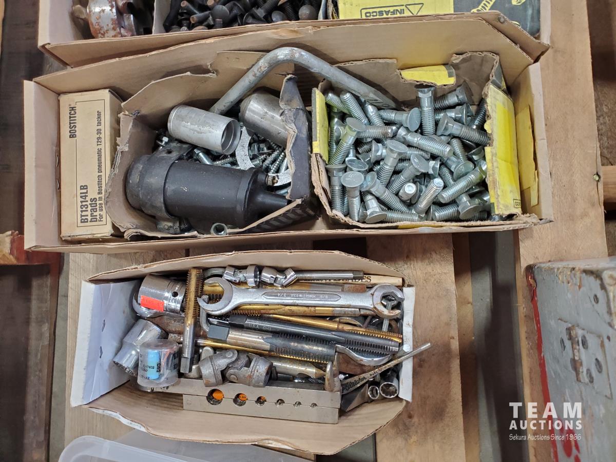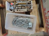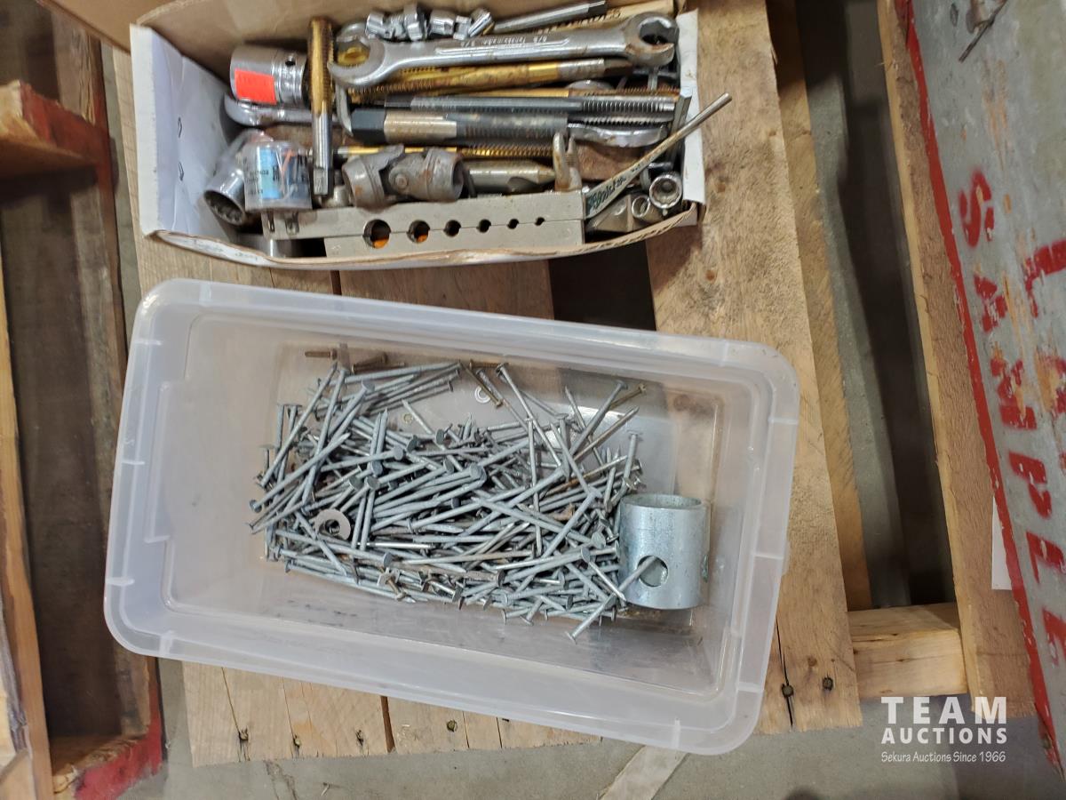 Nails, screws, door hinges, wooden box, (2) boxes of tiles