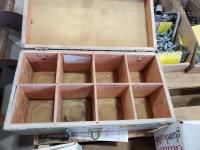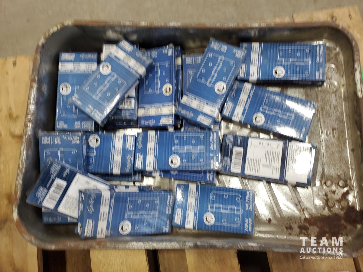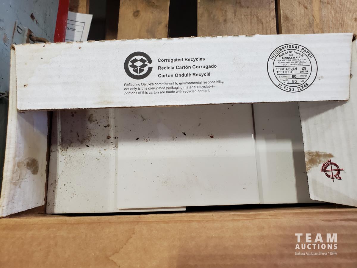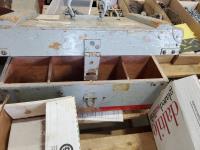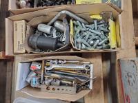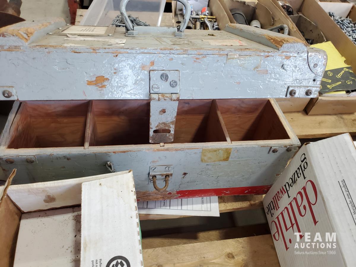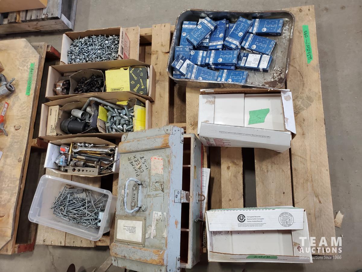 Nails, screws, door hinges, wooden box, (2) boxes of tiles