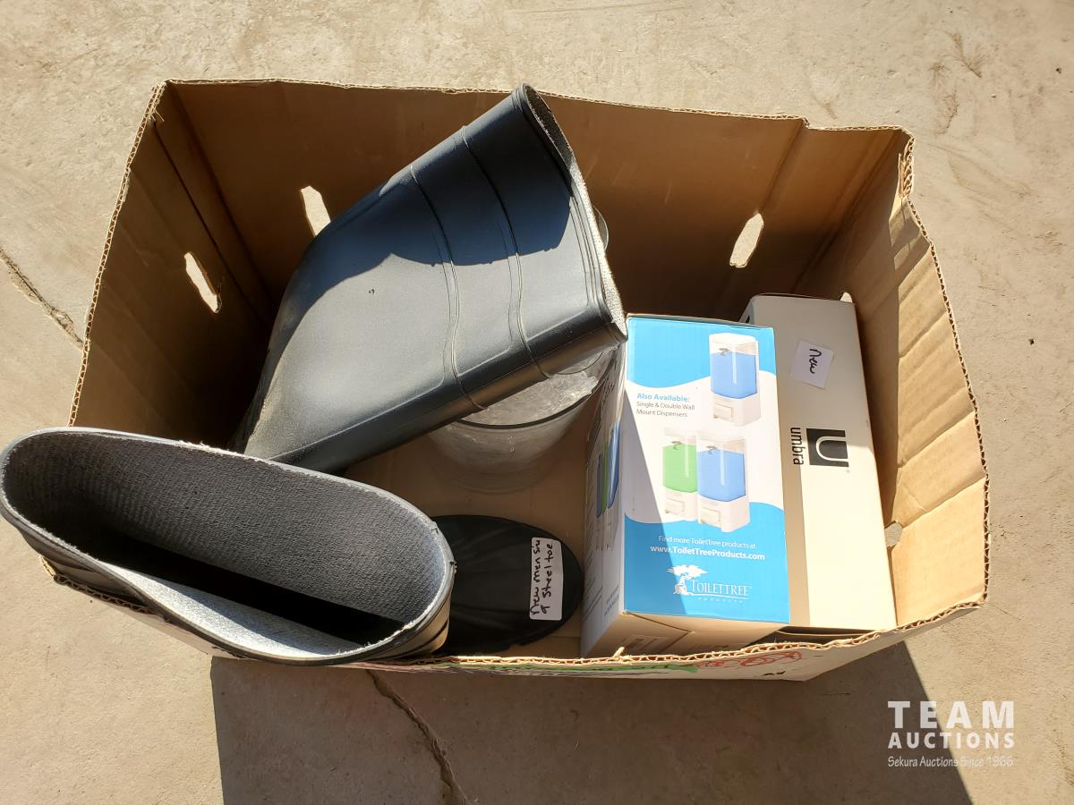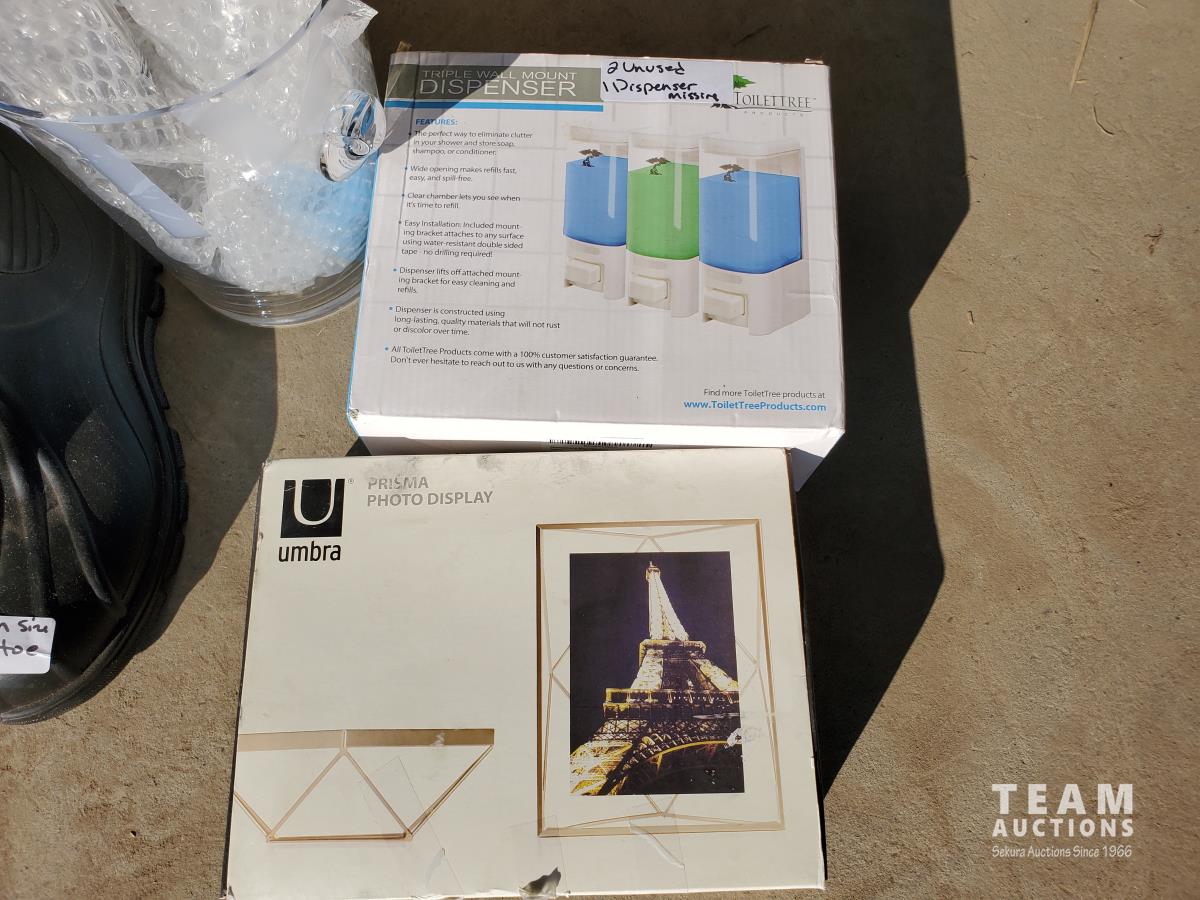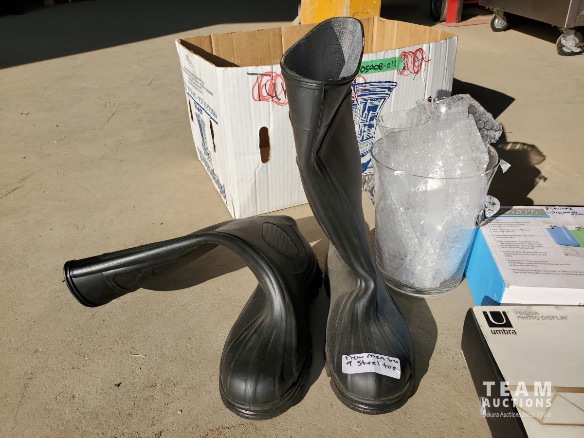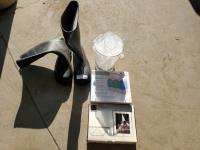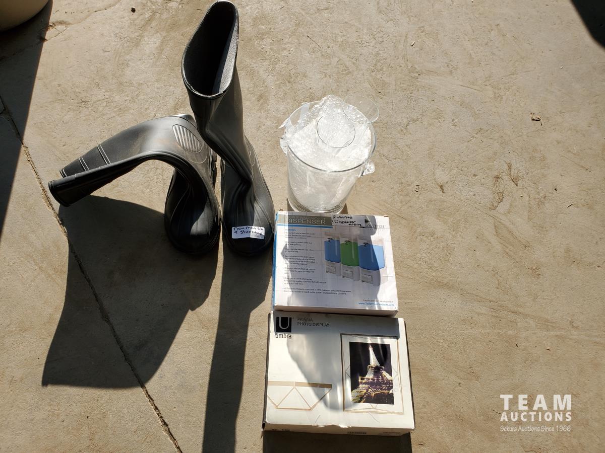 Steel toed mens boots (size 9), vases, photo display, soap dispenser