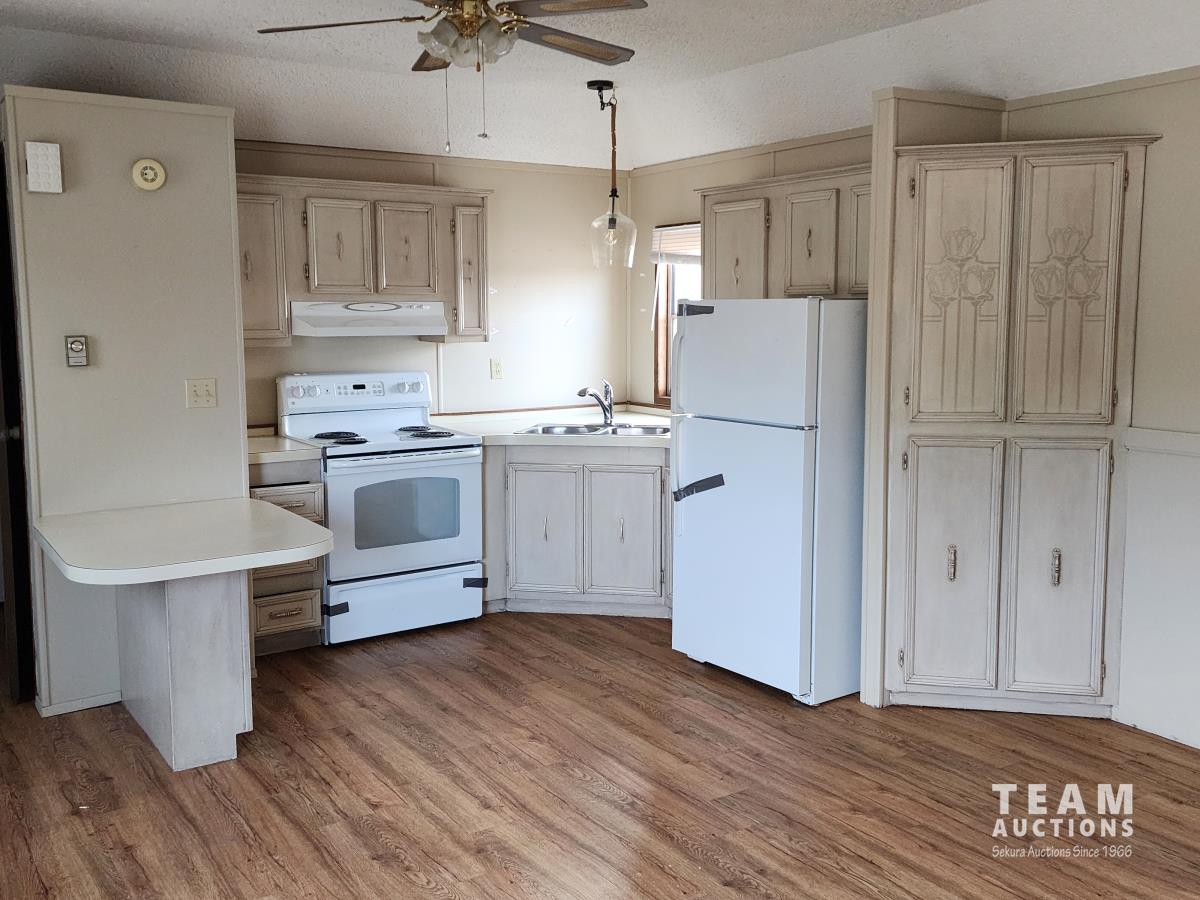 Large kitchen with fridge and stove, living room, bedroom with bathroom, baseboard heaters, washing machine, hot water tank