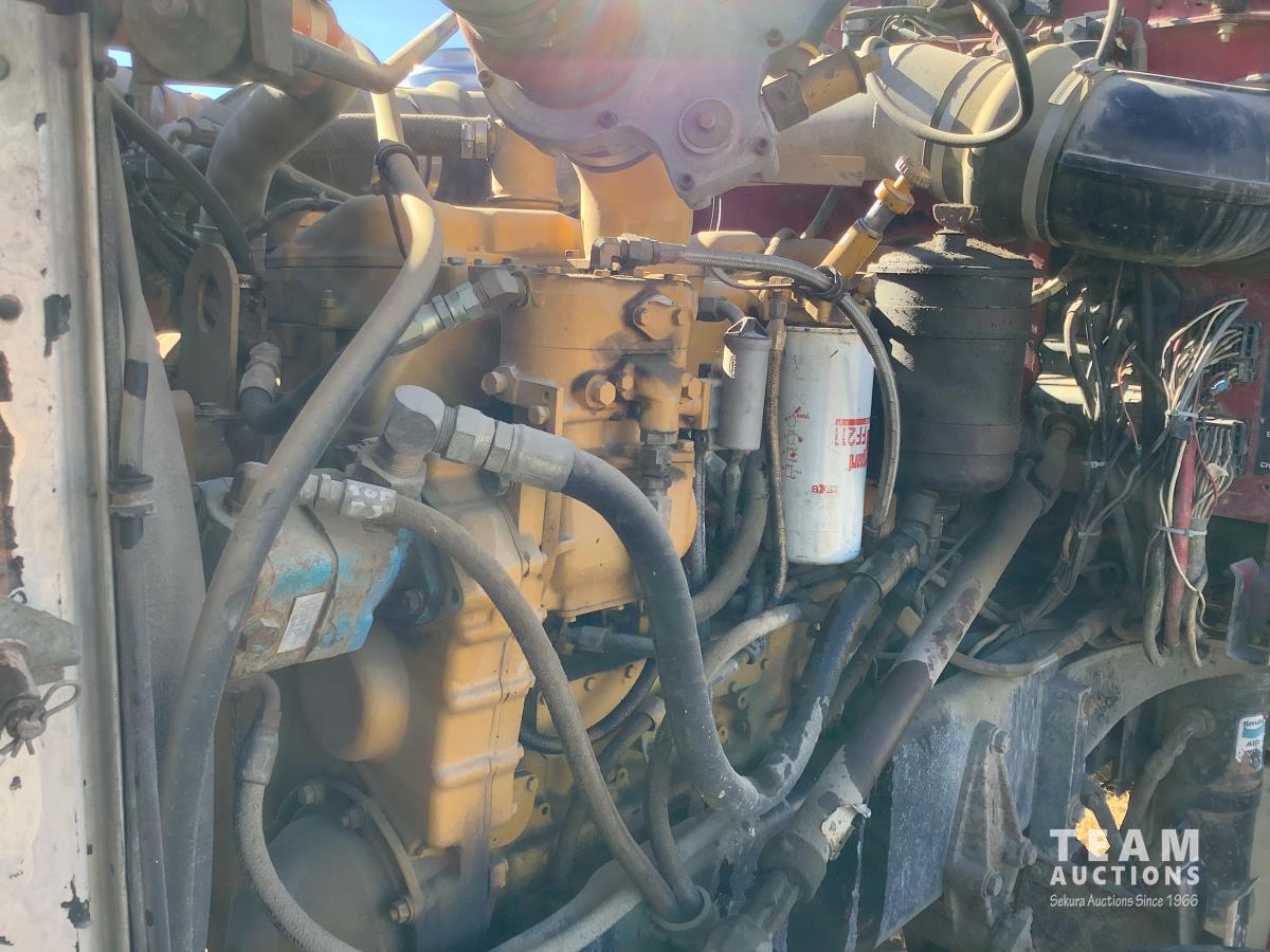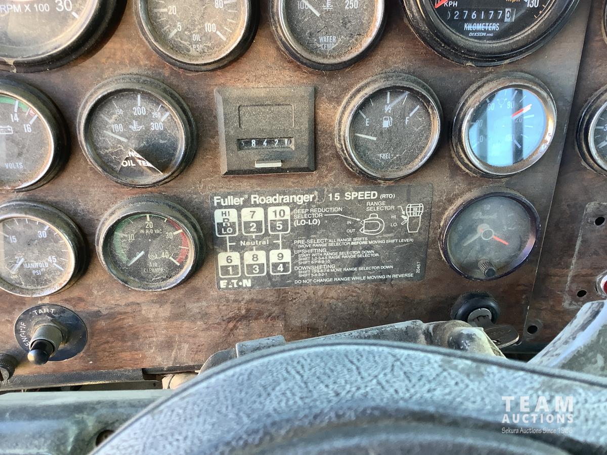 Caterpillar 3406B engine, 15 speed transmission, 12,000 lb front axle, possibly 44,000 rear axles with a single locker, air ride suspension, Texas bed with a rear live roll, PTO drive winch, air slide 5TH wheel, aluminum rims on rear, 11R24.5 tires