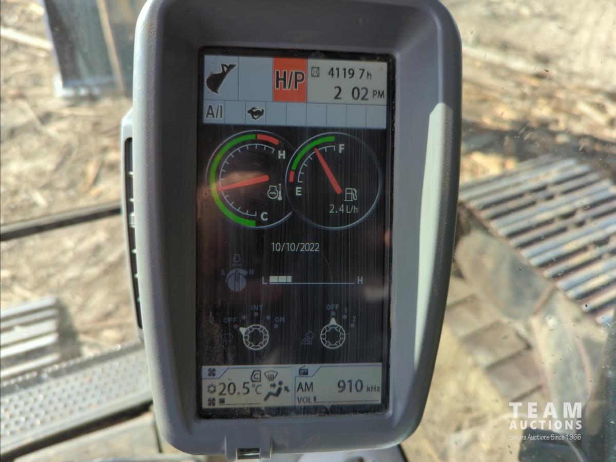 11 ft 11 inch stick, auxiliary hydraulic, Brandt 66 inch Q/C cleanup bucket, hydraulic thumb, A/C cab, cab screens, air ride seat, 31.5 inch triple grouser track pads, catwalks, positive air shutoff, Webasto heater