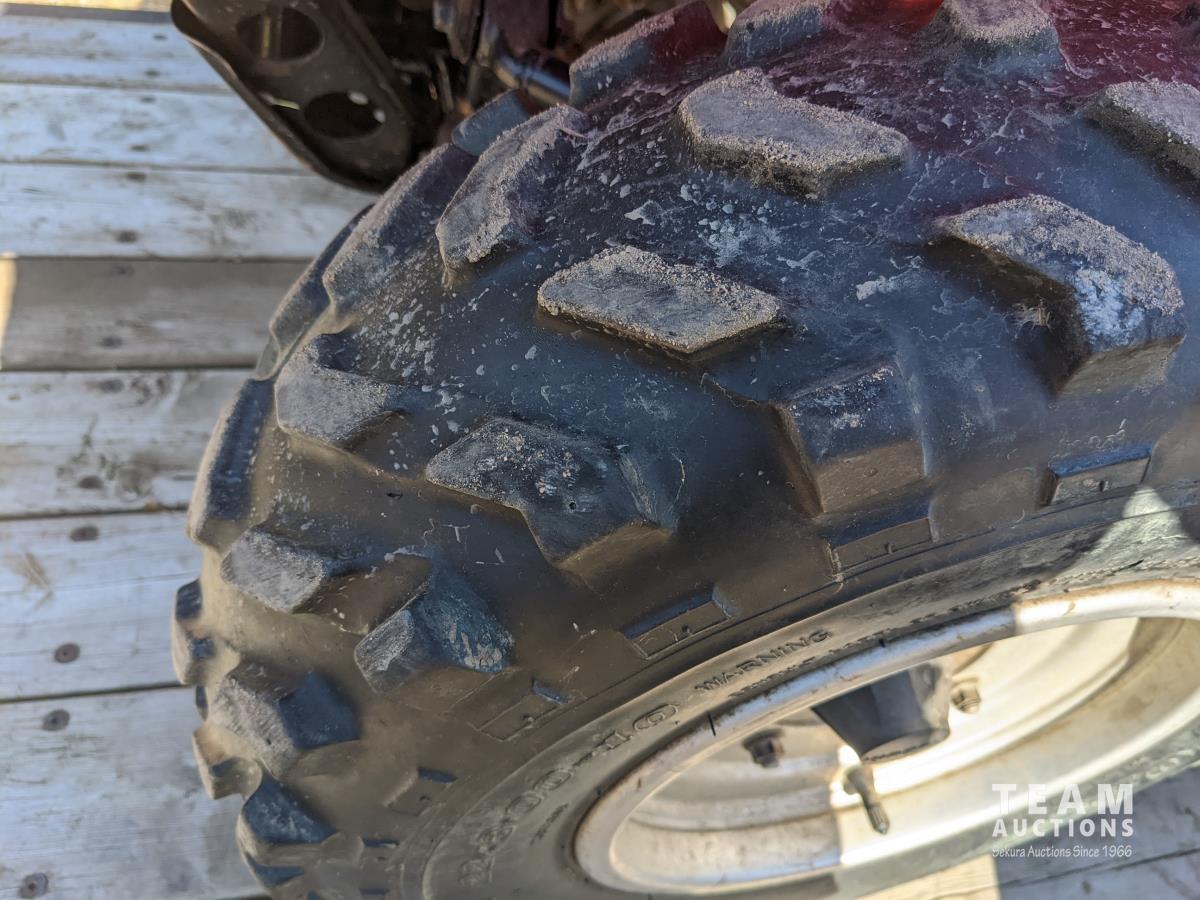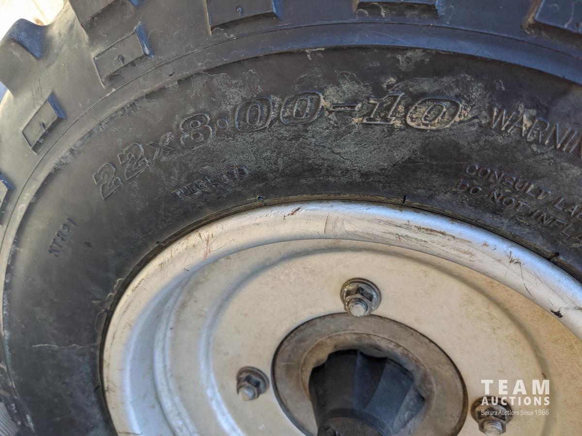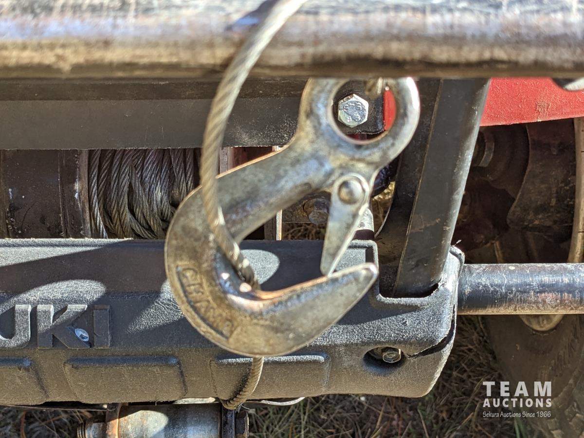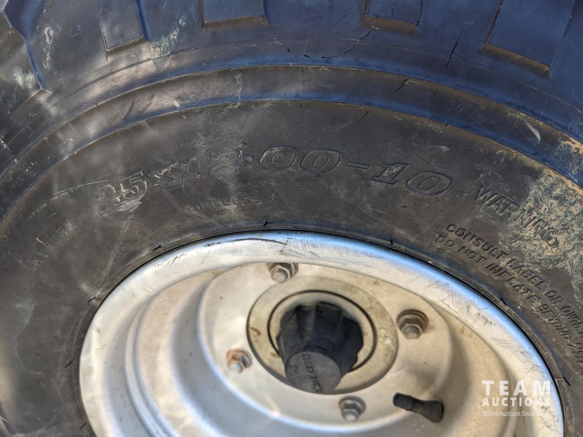 Winch, 5 speed transmission with (3) ranges, electric start, independent suspension on all axles, front and rear racks, padded rear rack cover, ball hitch, 22X8.00-10 front & 25X12.00-10 rear tires