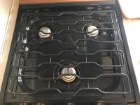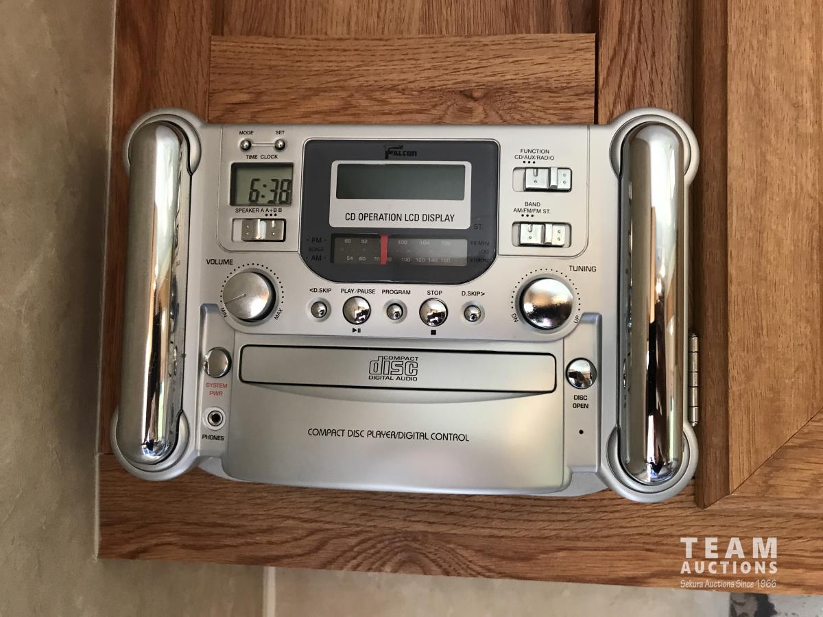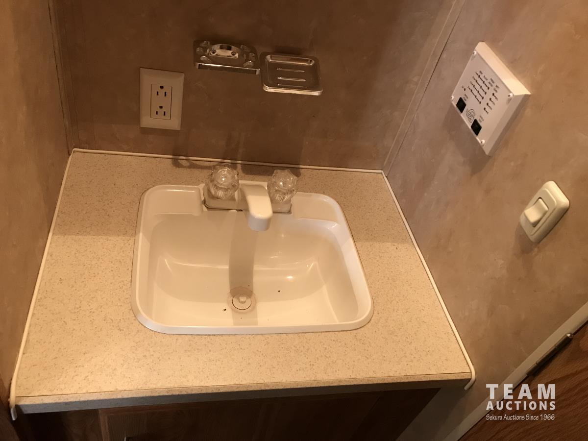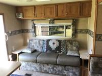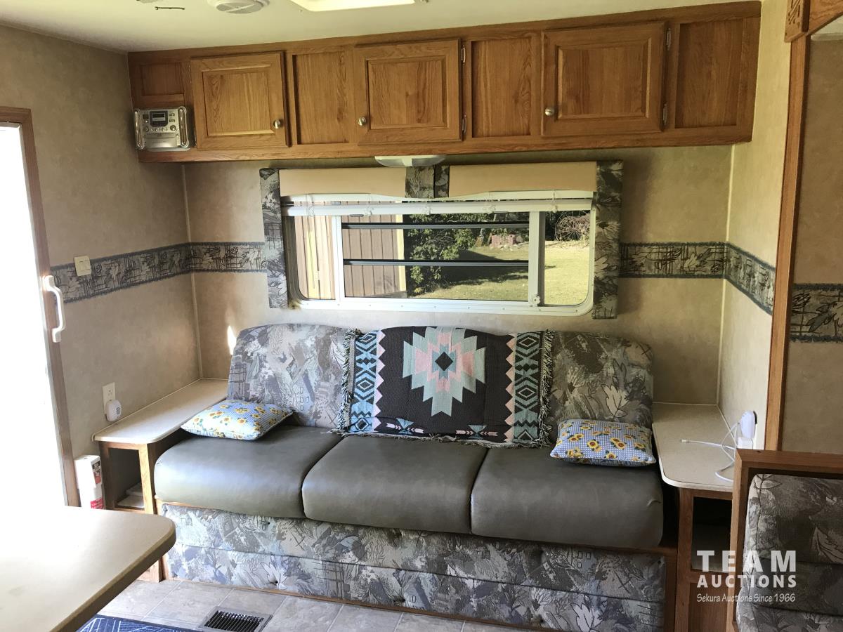Kitchen with stove, microwave, fridge, dinette, fold out couch, bathroom with tub and shower, bedroom, A/C, slide out, awning, 2-5/16 inch ball hitch, load leveler hitch, 30 lb propane tanks with cover, batteries, 205/75R14 tires