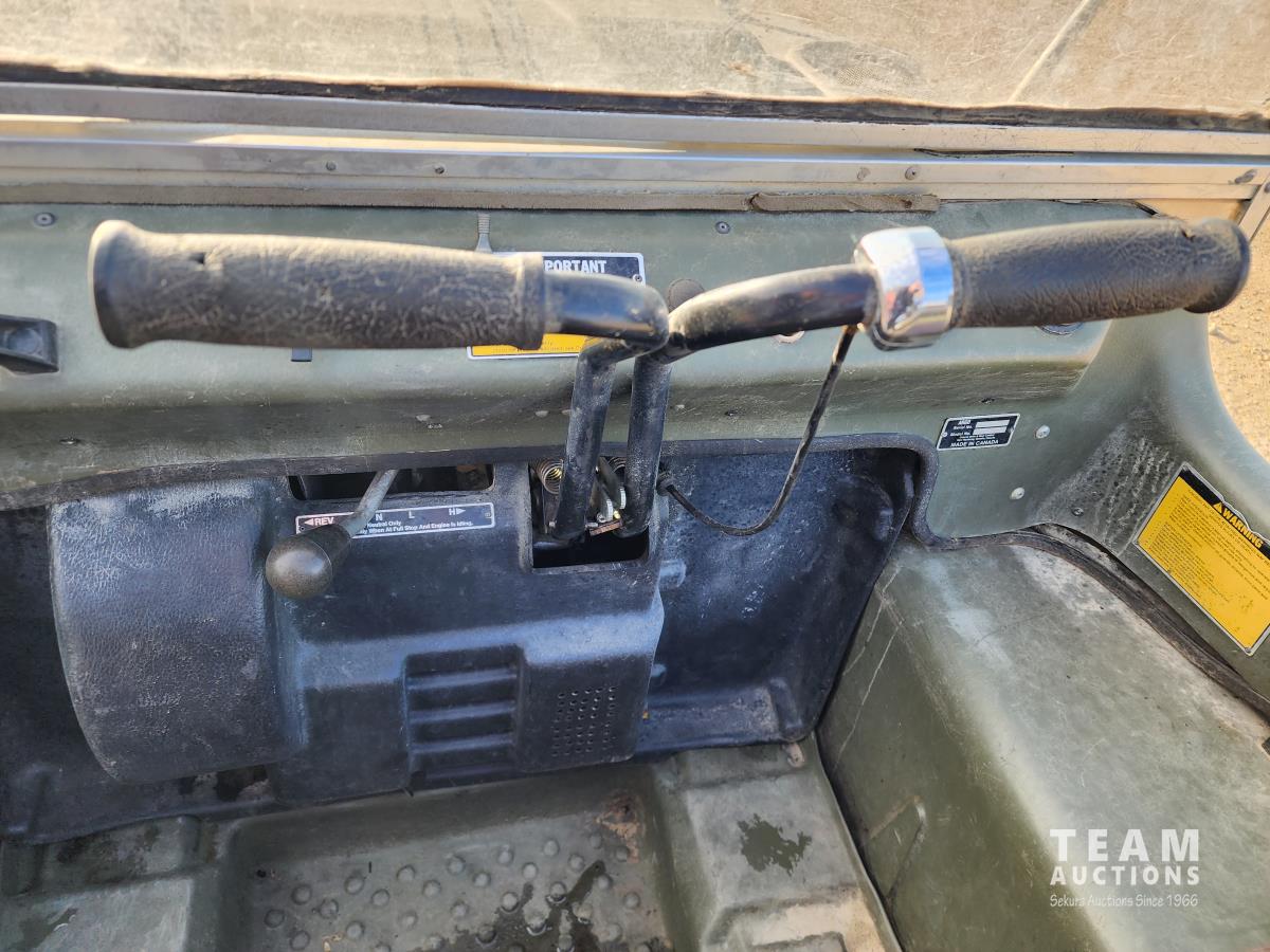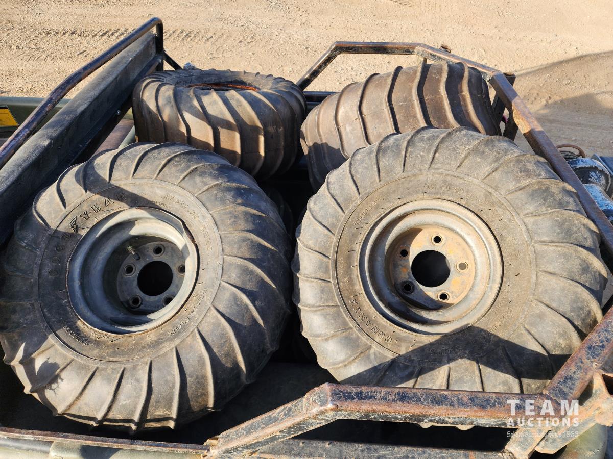 Kawasaki 20 HP engine, planetary differential transmission with high/low forward, neutral and reverse, front and rear winches, rear receiver, comes with extra tires and tracks, Goodyear Runamuk 22X10-8 tires