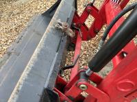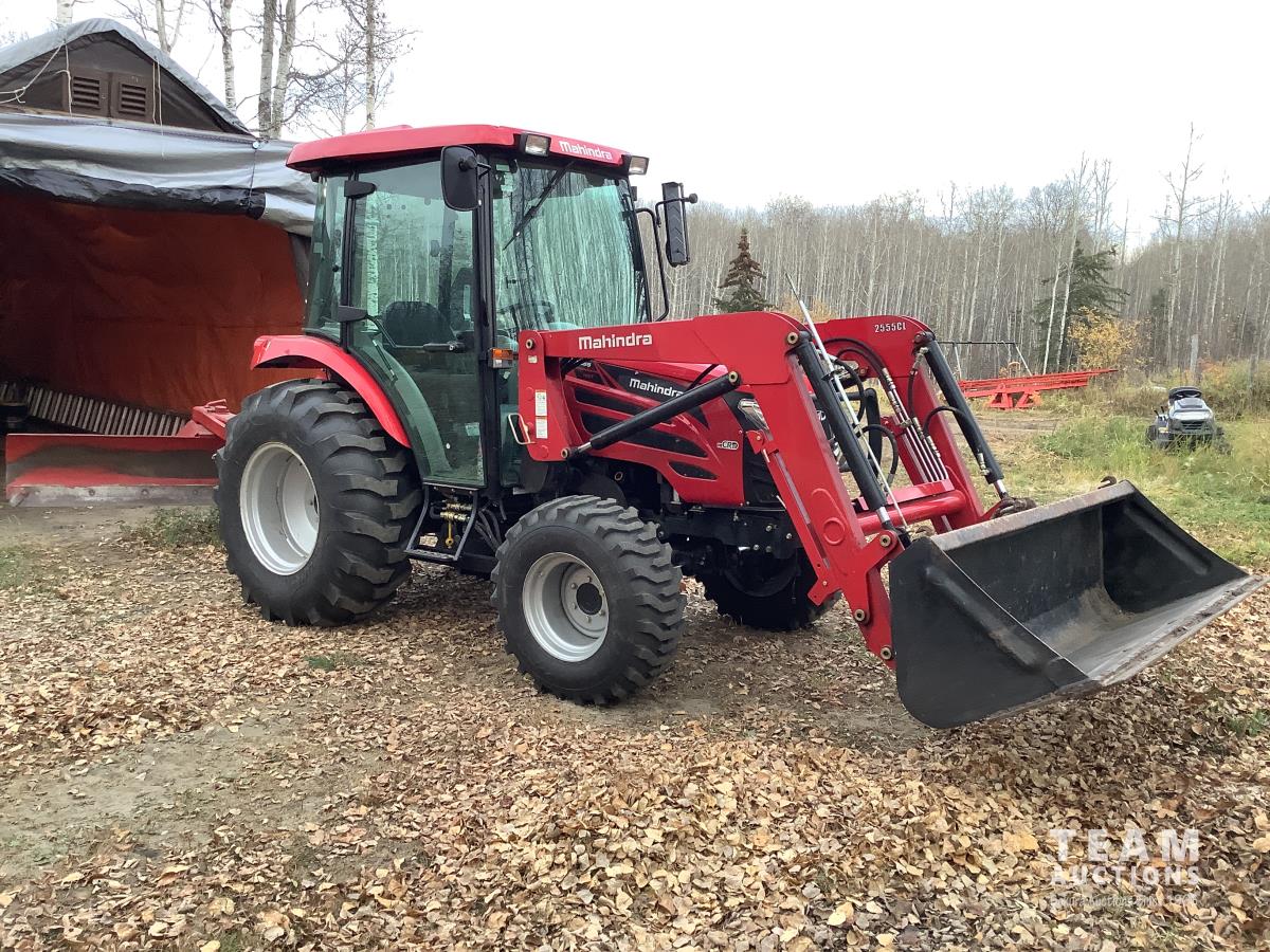 Mahindra 2555CL loader, Q/A bucket, joystick, grill guard, cab, AC, heat, radio, 3 PT hitch, single rear hydraulic outlet, 16.9-24 rear tires, attachments included with tractor, 6 ft 3 PT hitch blade, extra Bull Dog 80 inch bucket with replaceable cutting edge, shop built Q/A pallet forks
