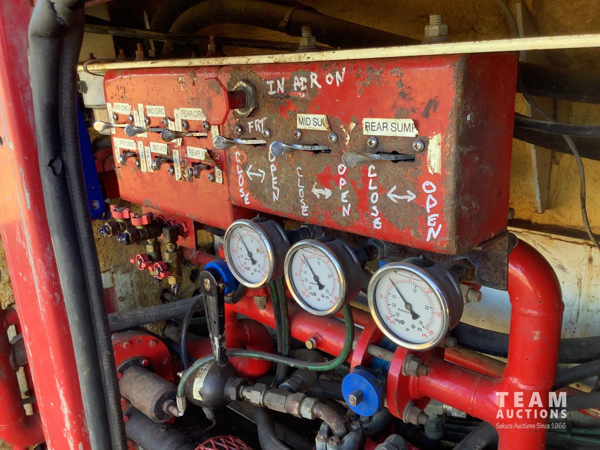 Mercedes 6 cylinder, engine brake, Allison automatic transmission, air ride suspension, 12,000 lb front, 21,000 lb rears, full lockers, 2007 Custom Vac Manufactured 10,287 litre TC407 3 compartment Steel tank, See Level gauges, General Industrial MSS40 triplex pump, 44 GPM, heated compartment, side storage compartment, aluminum rims, 11R22.5 tires