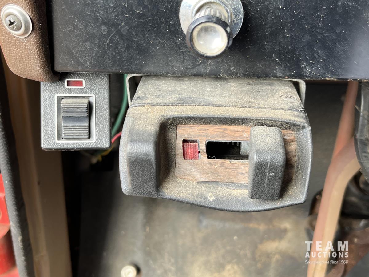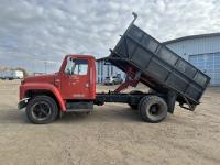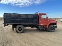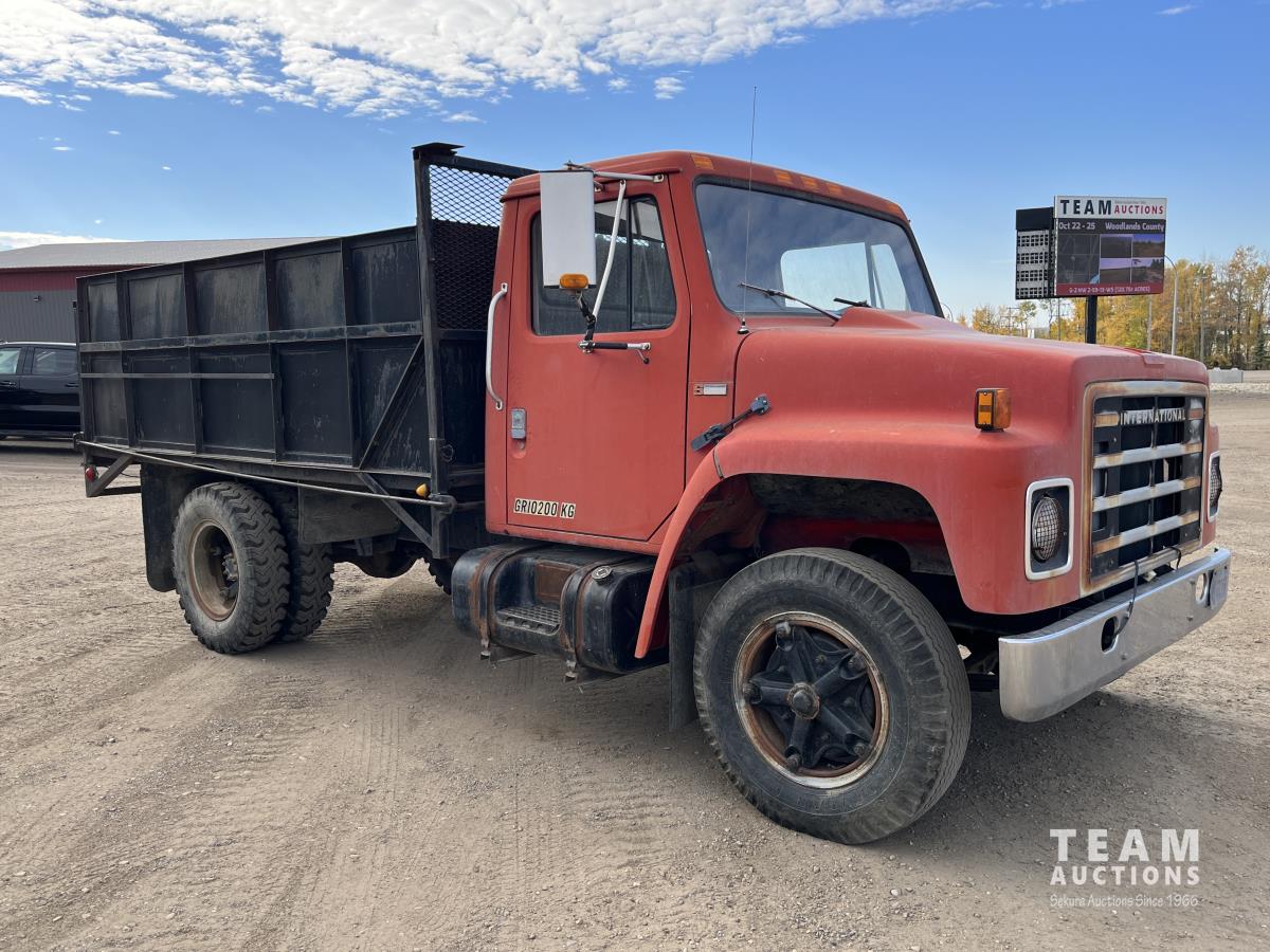 International 345 cu in gas engine, 5 & 2 transmission, spring suspension, 12 ft metal box with grain door and full open end gate, hoist, power steering, 152 inch WB, 8.25-20 tires.