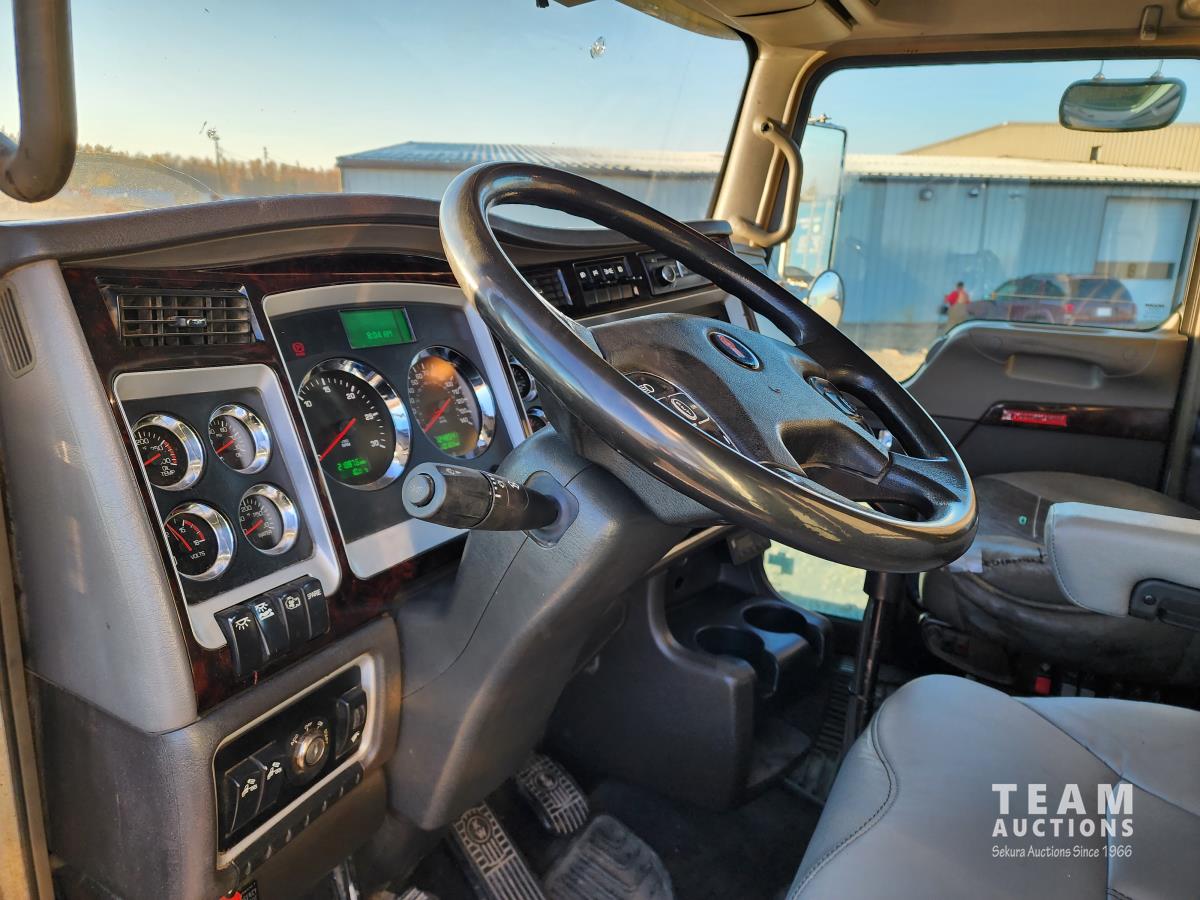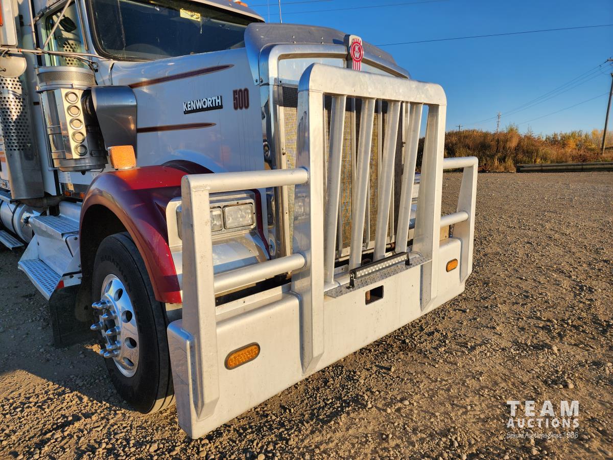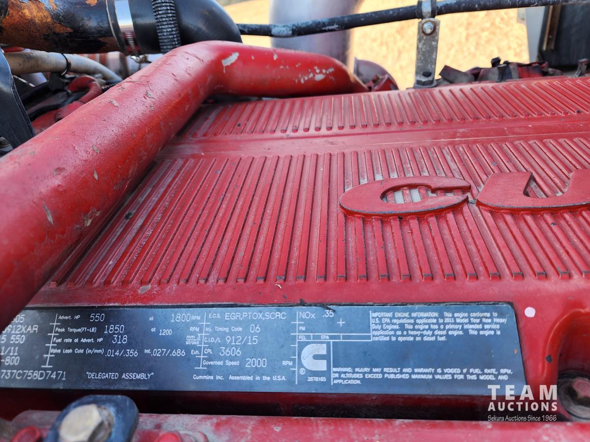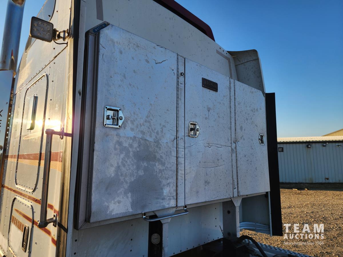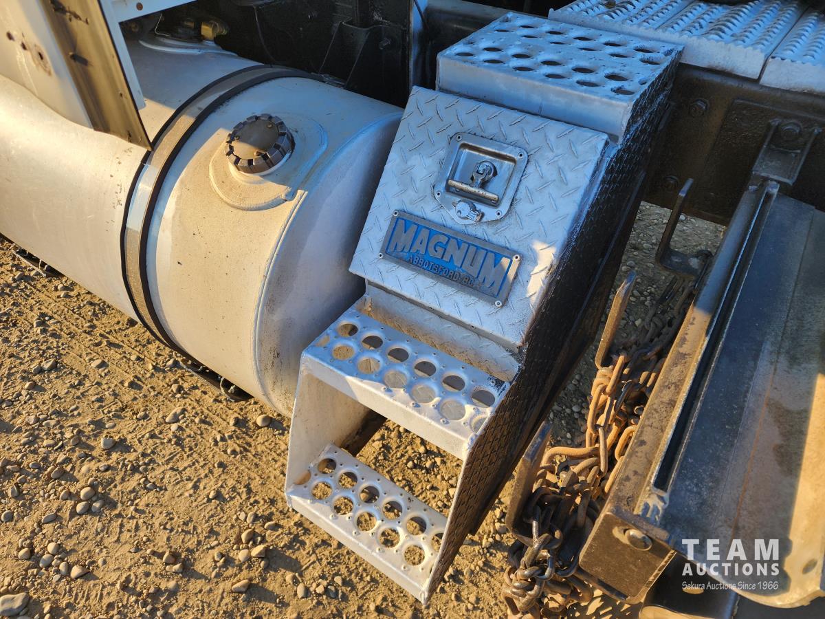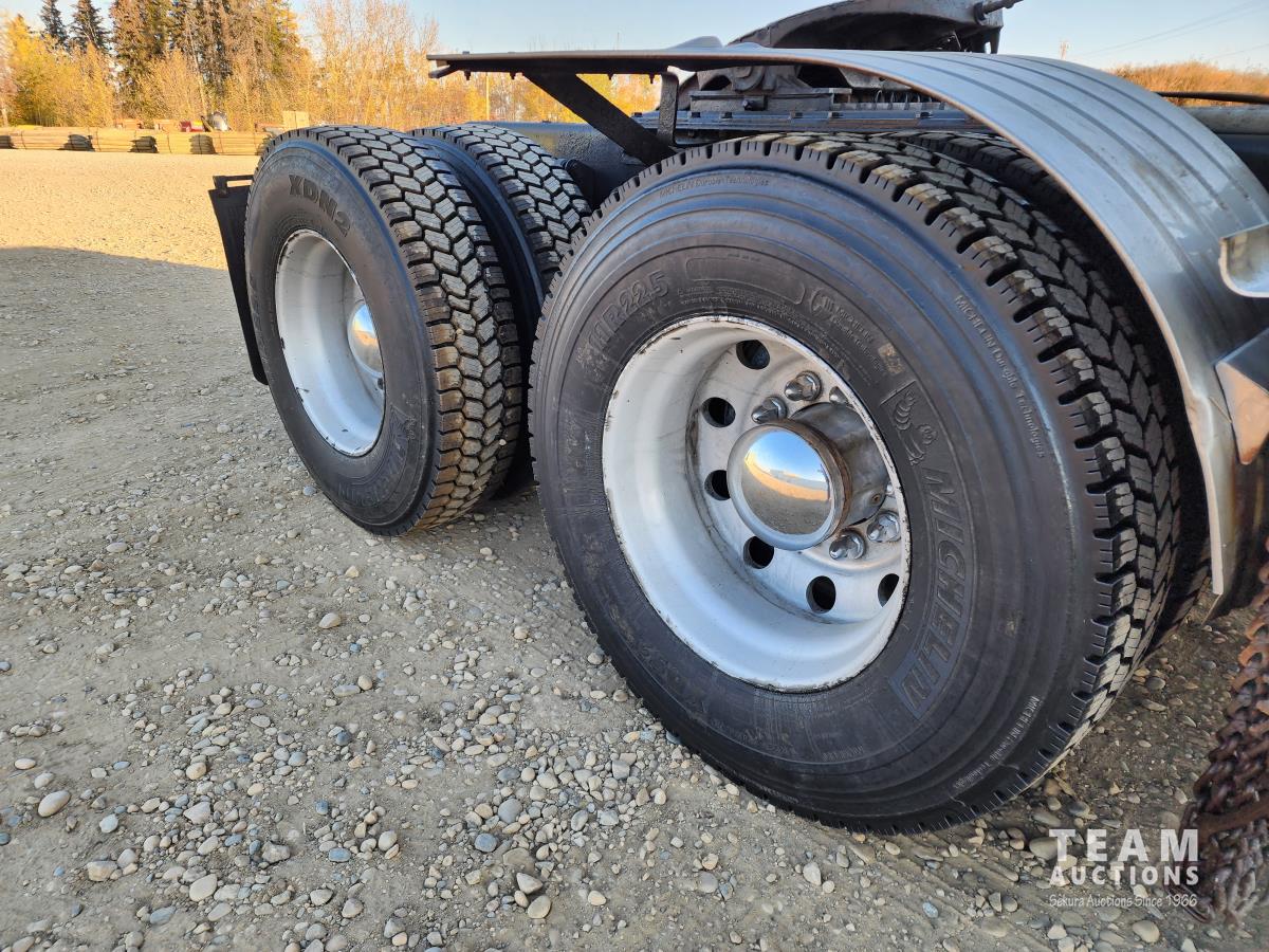 Cummins ISX 550 HP, RTO 18918B 18 speed transmission, air ride suspension, Dana 12,000 lb front end, Dana 46,000 lb rears with lockers, 1810 driveline, 63 inch sleeper, full 3 compartment cabinet style headache rack, frame mounted aluminum step box, (2) tire chain hangers, moose bumper, beacon lights, all aluminum rims, 11R22.5 front, Virgin 11R22.5 recaps on rear tires (winter tread)