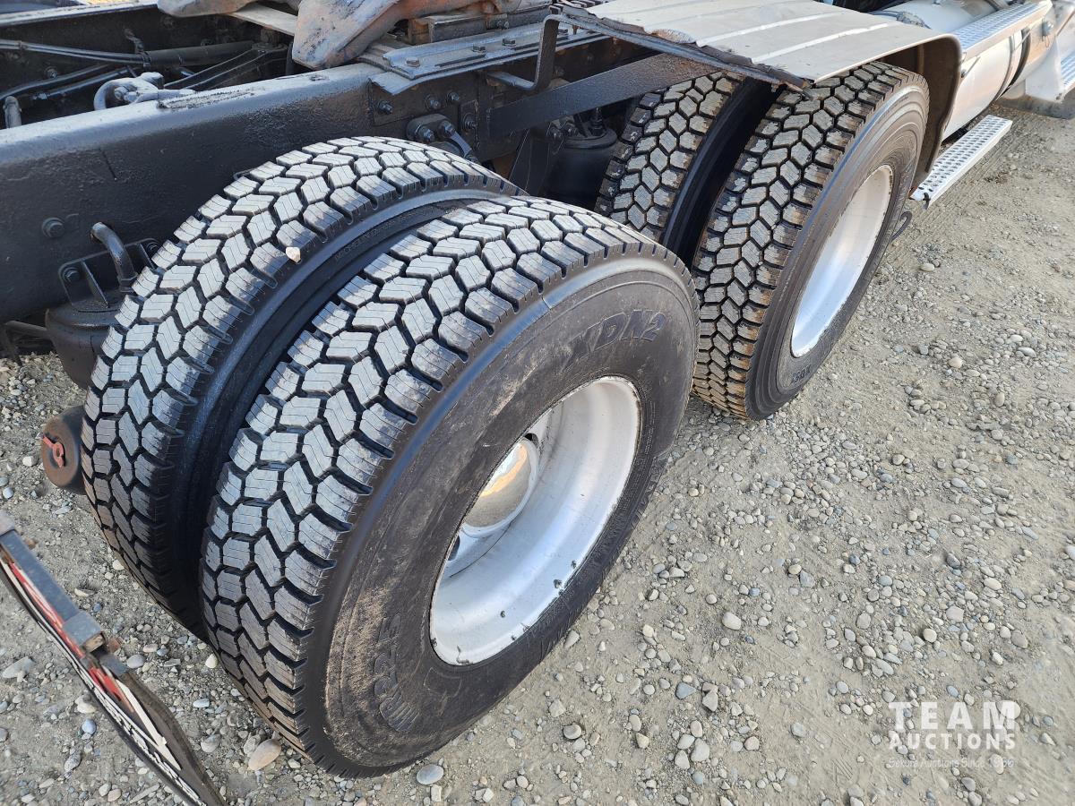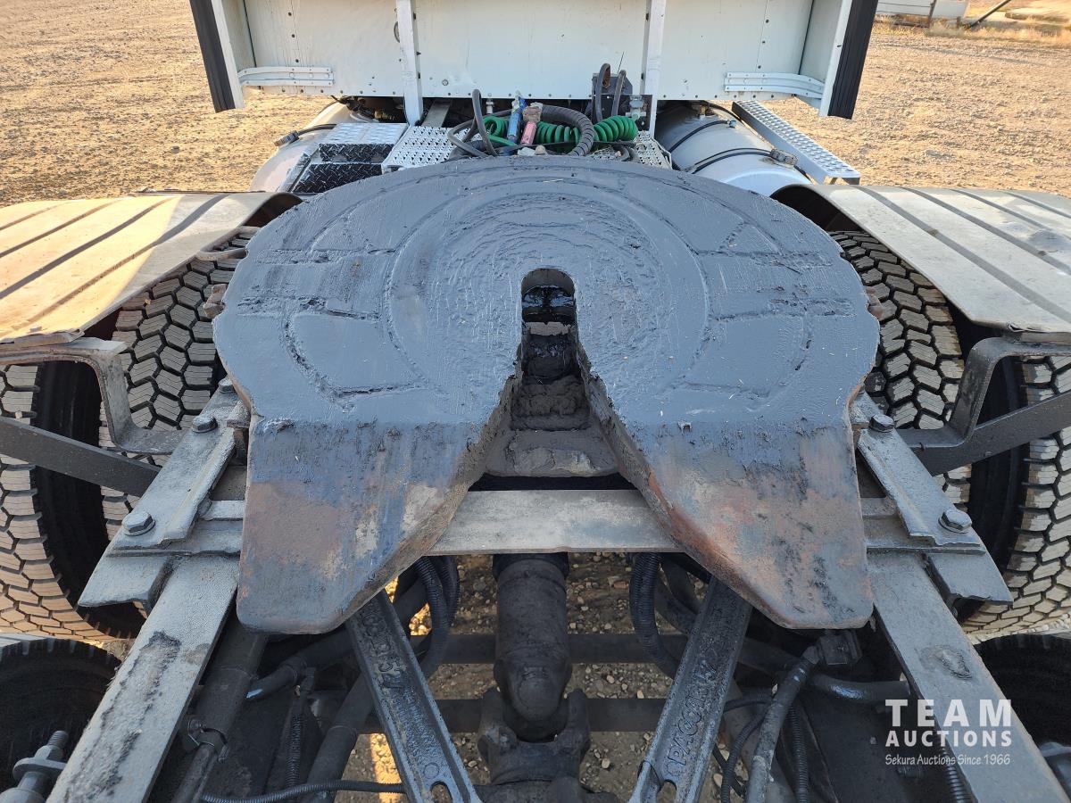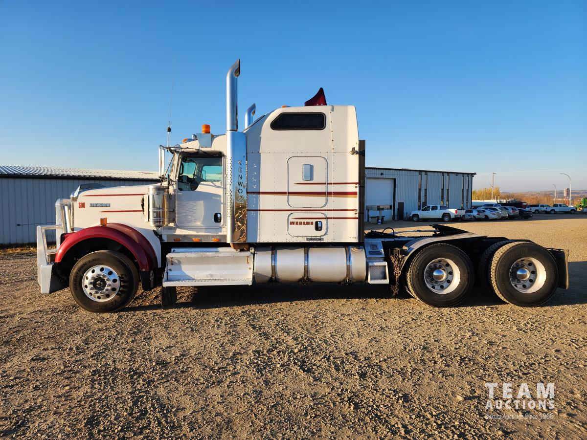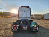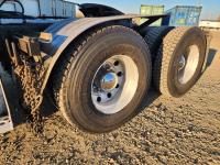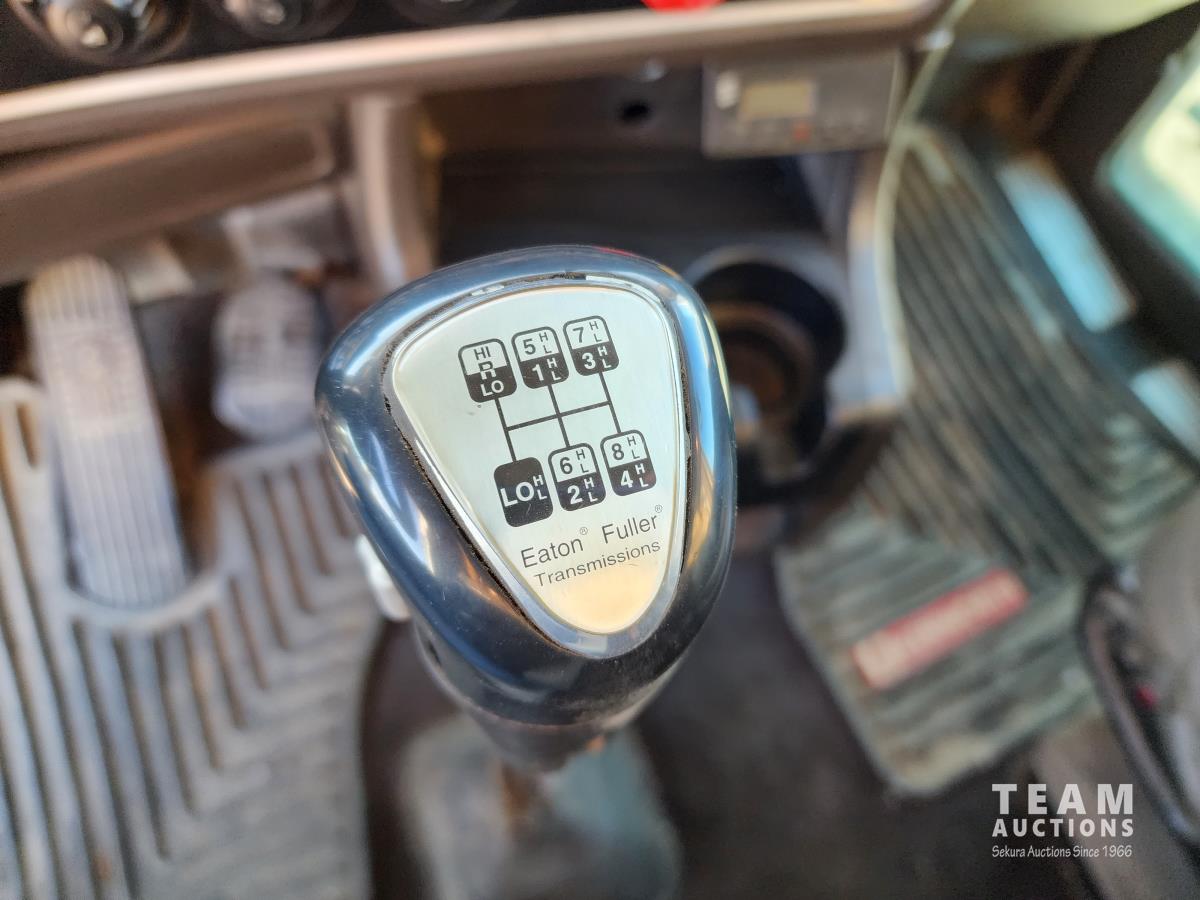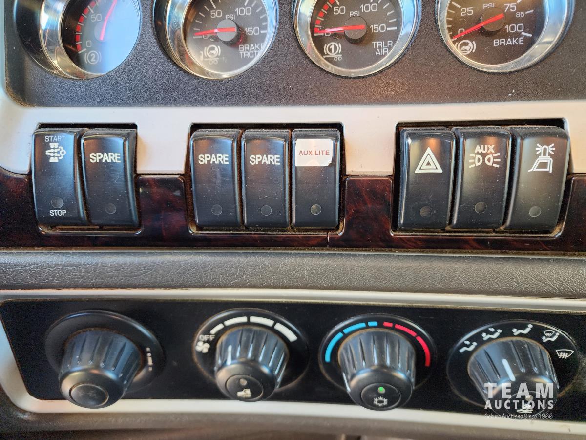 Cummins ISX 550 HP, RTO 18918B 18 speed transmission, air ride suspension, Dana 12,000 lb front end, Dana 46,000 lb rears with lockers, 1810 driveline, 63 inch sleeper, full 3 compartment cabinet style headache rack, frame mounted aluminum step box, (2) tire chain hangers, moose bumper, beacon lights, all aluminum rims, 11R22.5 front, Virgin 11R22.5 recaps on rear tires (winter tread)