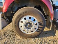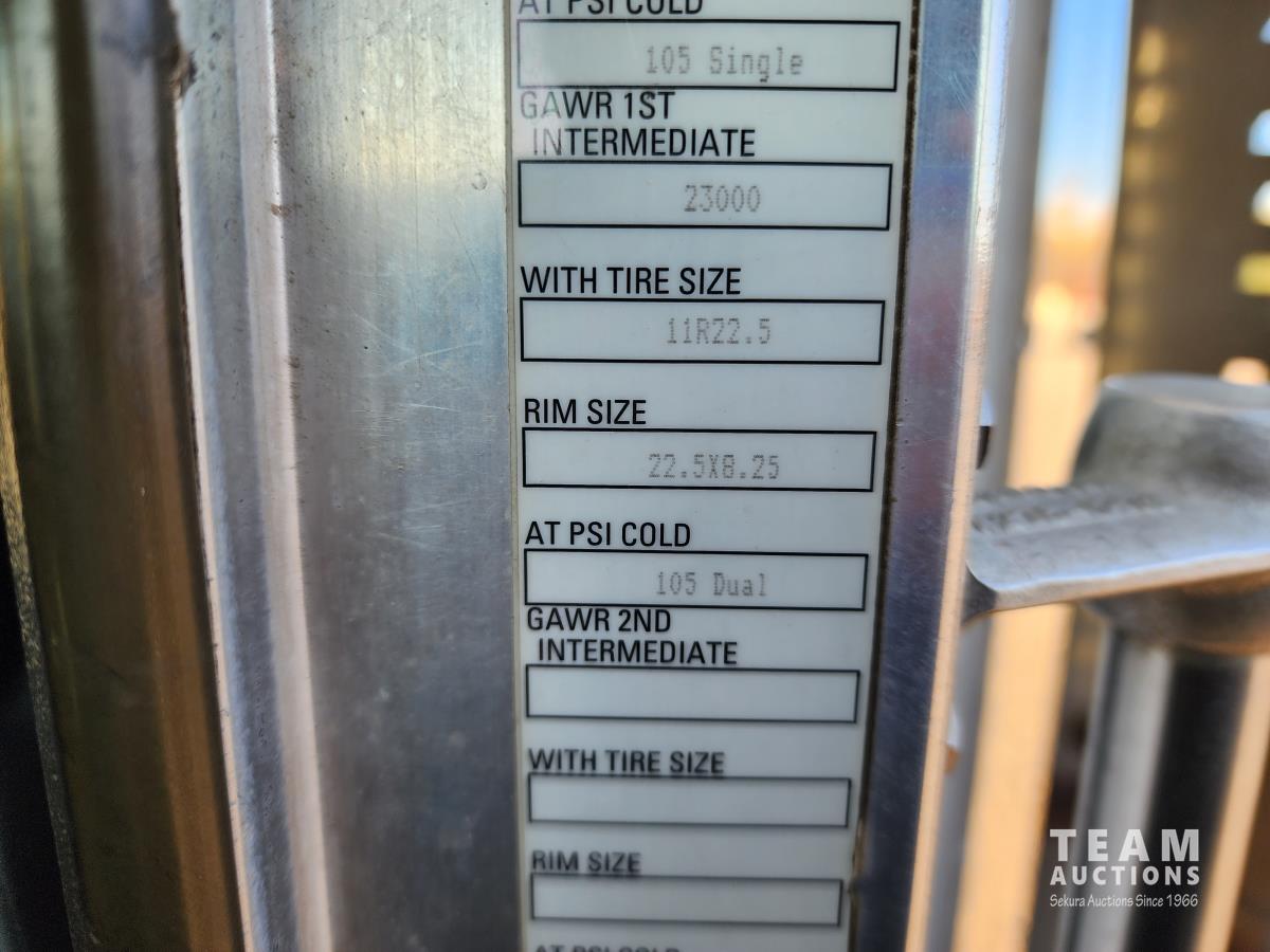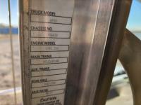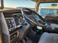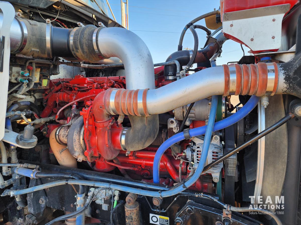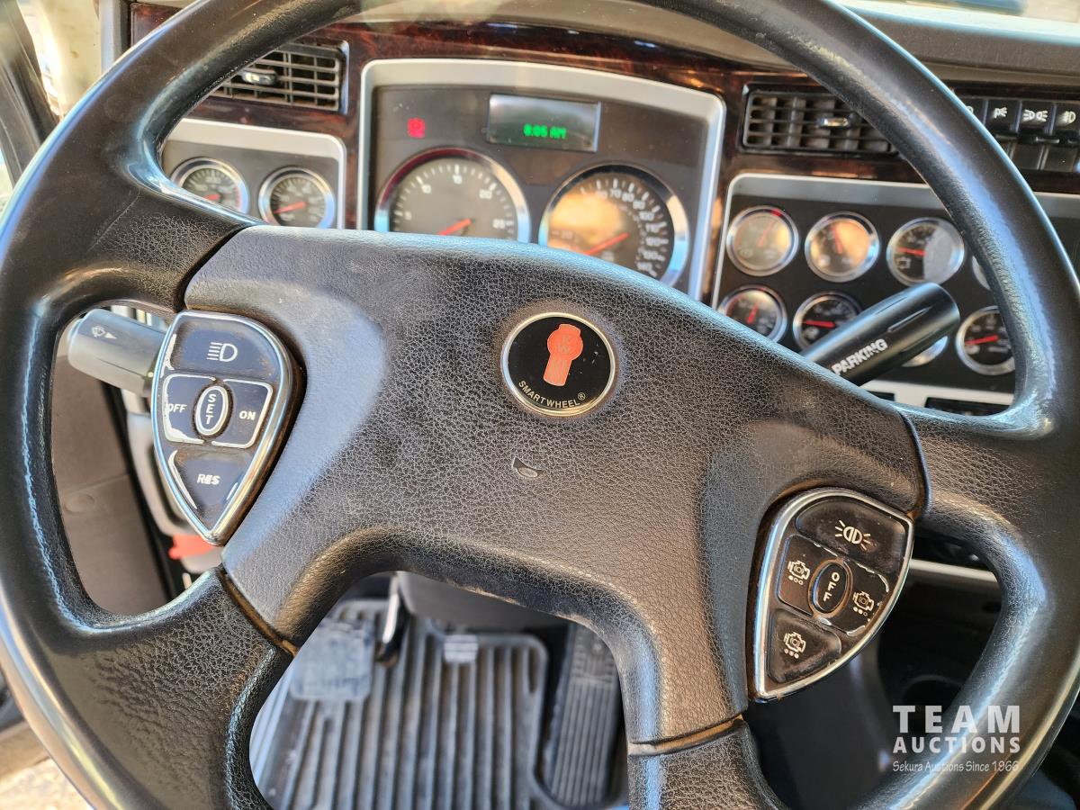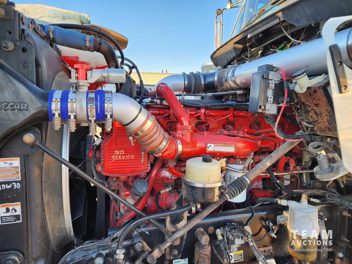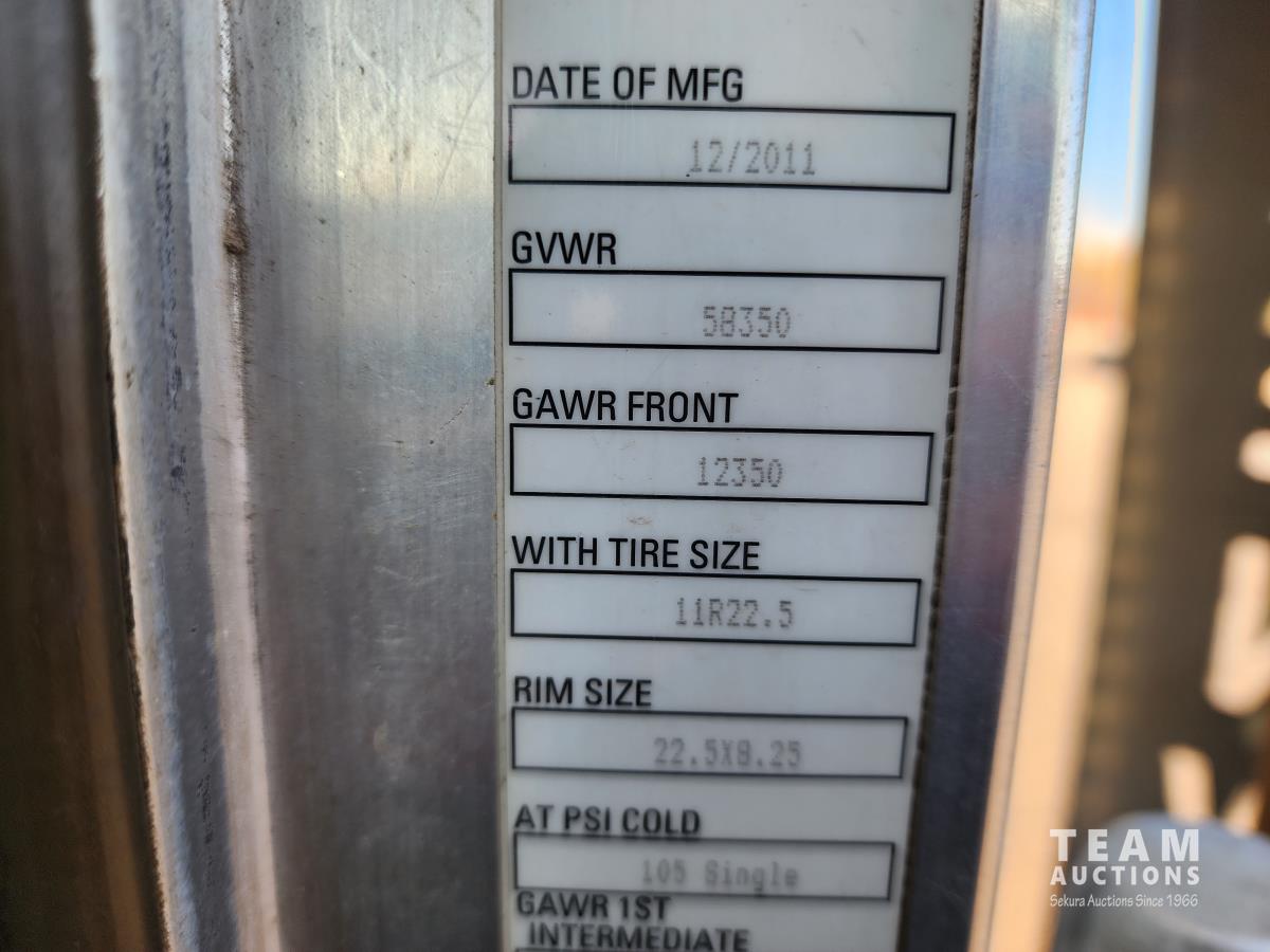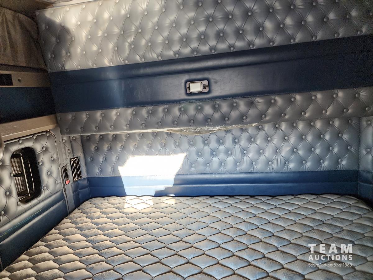 Cummins ISX 550 HP, RTO 18918B 18 speed transmission, air ride suspension, Dana 12,000 lb front end, Dana 46,000 lb rears with lockers, 1810 driveline, 63 inch sleeper, full 3 compartment cabinet style headache rack, frame mounted aluminum step box, (2) tire chain hangers, moose bumper, beacon lights, all aluminum rims, 11R22.5 front, Virgin 11R22.5 recaps on rear tires (winter tread)